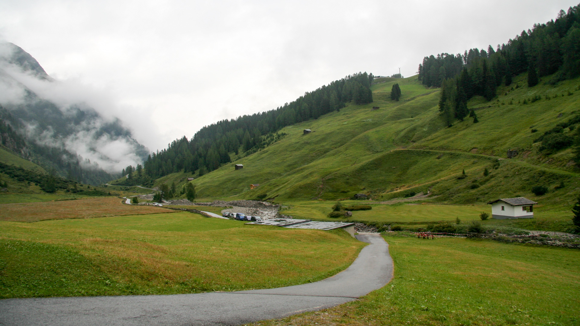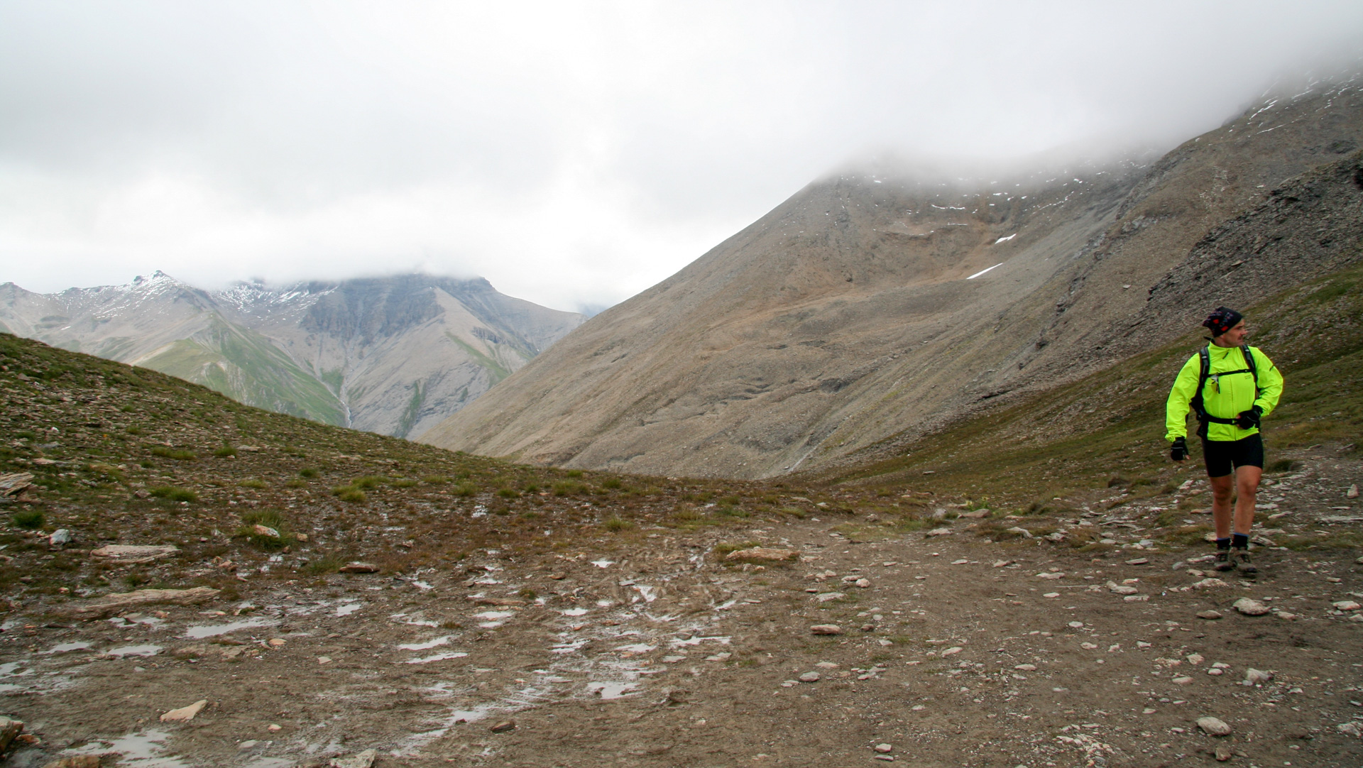 Gleich zu Beginn bergauf. Einen Rhythmus zu finden ist schwer. Die Beine noch schwer, tiefes Durchatmen hilft wenig, und dann noch der leichte kalte Nieselregen. Vom Start bei 1.650 Metern im Fimbertal erreichen wir nach 8 Kilometern die grüne Grenze Österreich/Schweiz an einer kleinen, verlassenen Zollhütte. Zeit für eine kurze Pinkelpause – trotz enormer Schweißproduktion erstaunlich, dass noch genug übrig bleibt!