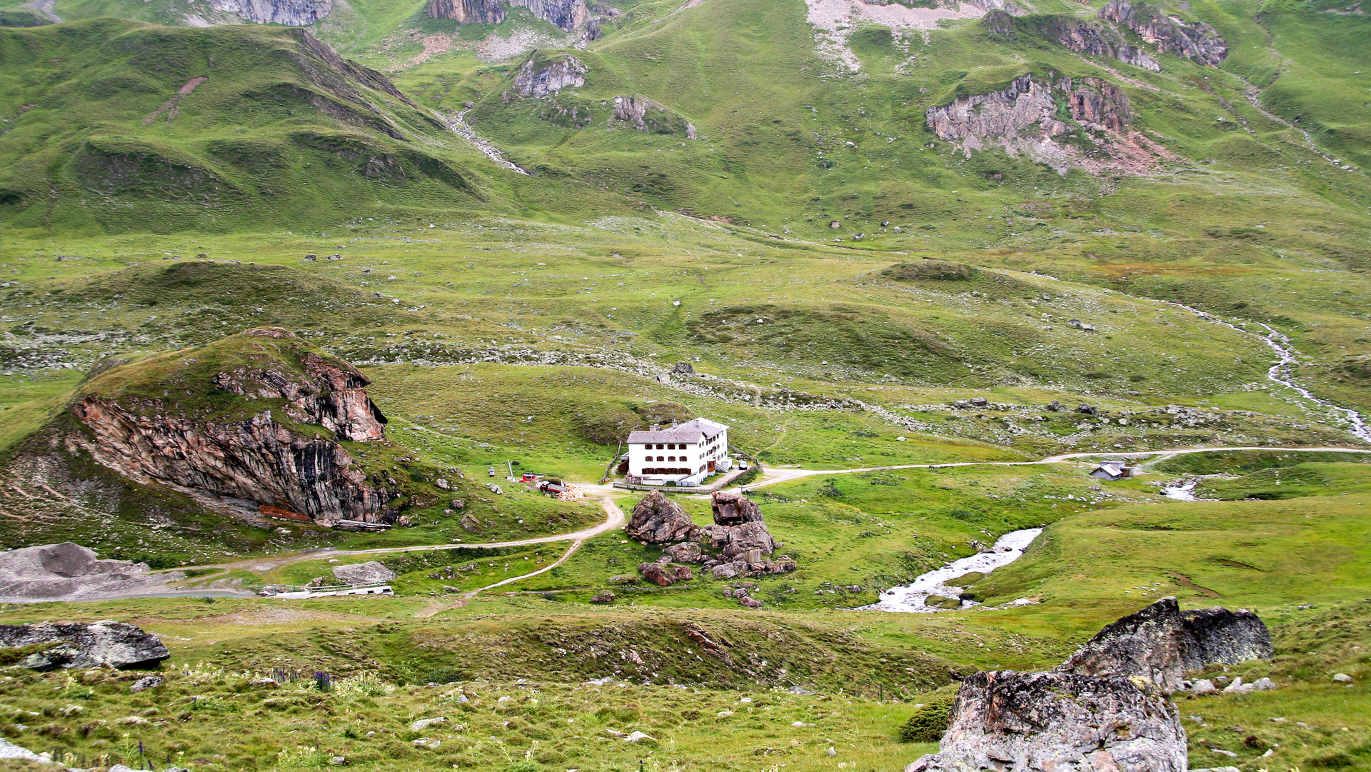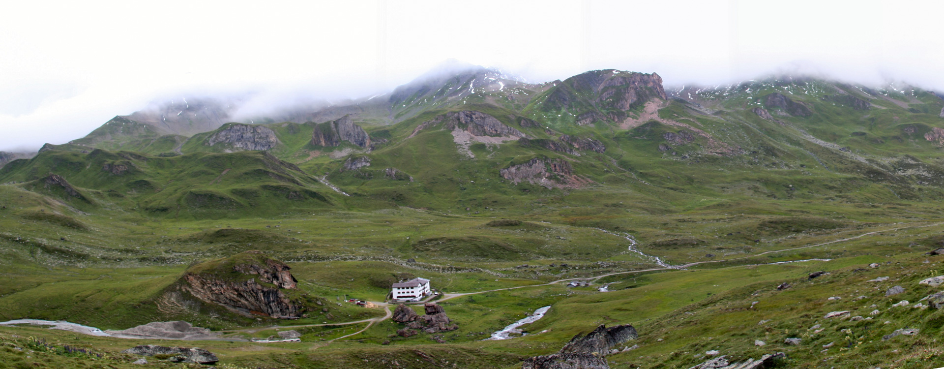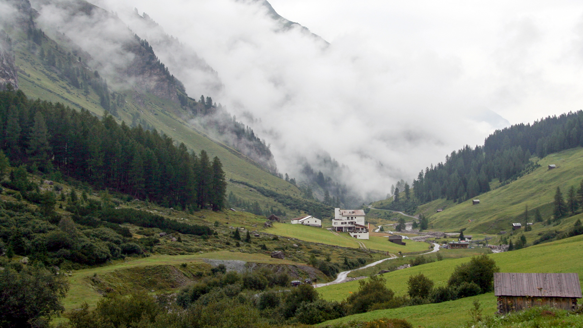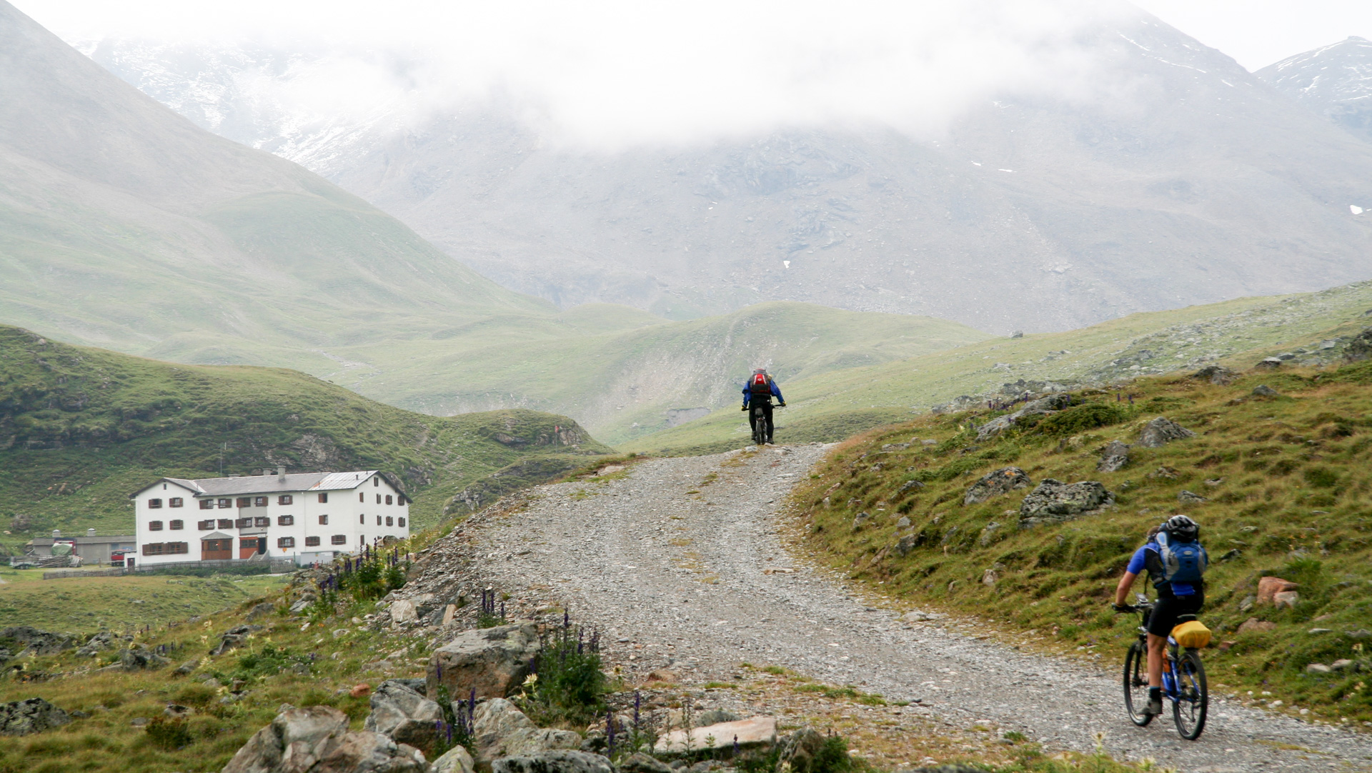 Der Nieselregen hat inzwischen aufgehört, wir befreien uns vom Windbreaker, aber die Berggipfel verschwinden alle in Nebelsuppe. Leicht fahrbarer Schotter führt zur Heidelberger Hütte. Zehn Kilometer, 600 Höhenmeter geschafft – Apfelsaftschorle wert. Schade, dass Nebel und Wolken das Panorama verhüllen, bei klarer Sicht muss das hier atemberaubend sein!