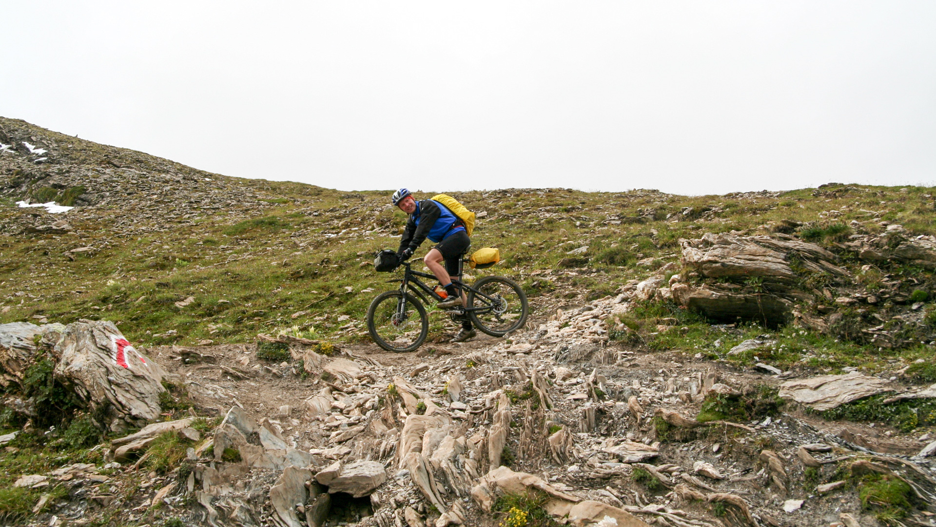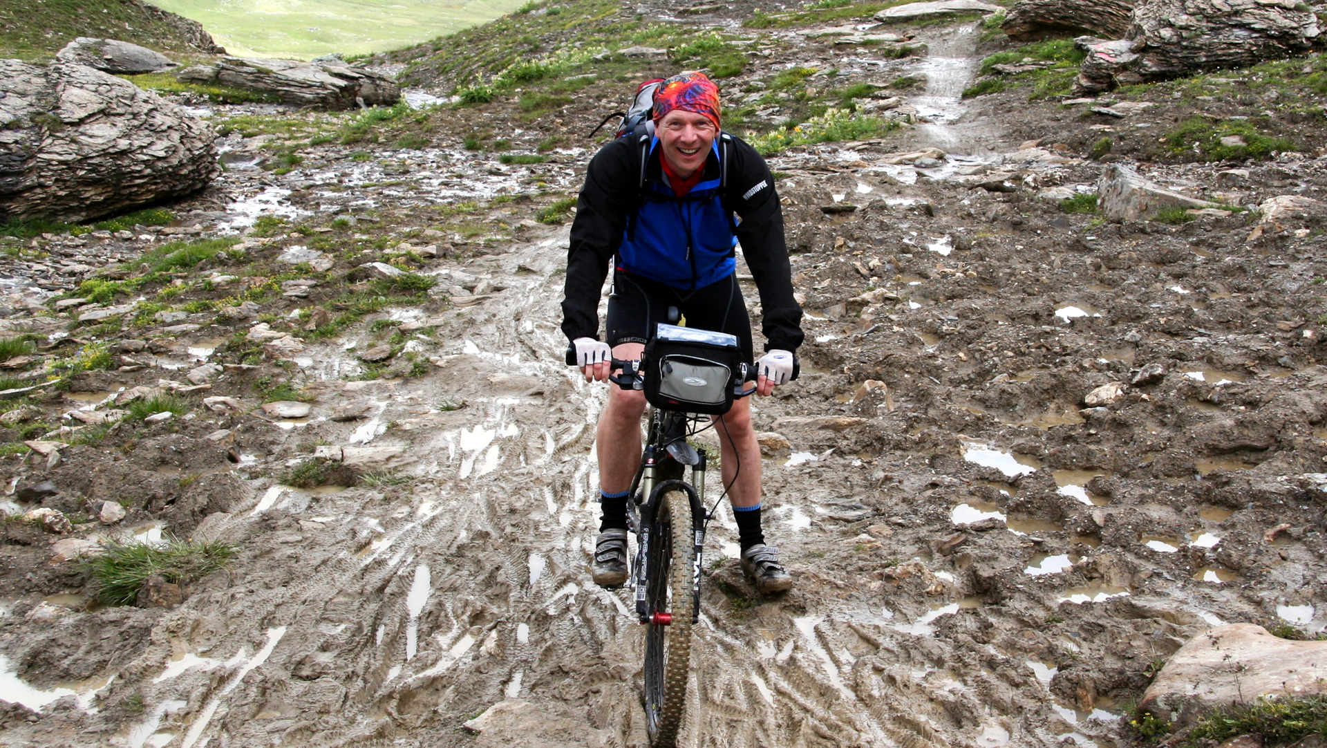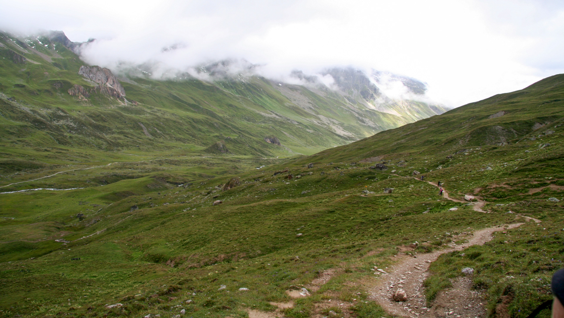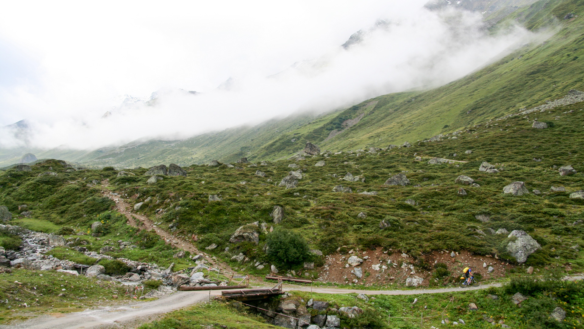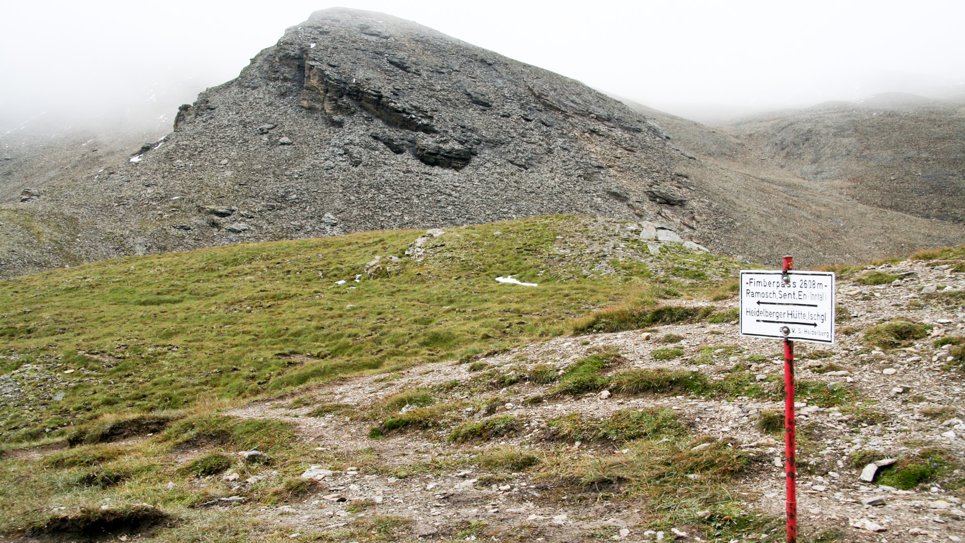 Jetzt beginnt der Aufstieg zum Fimberpass. Nicht ganz so hart wie die Heilbronner Hütte gestern, aber trotzdem fahrunfähig. Der Weg ist ausgewaschen, nass, schlammig vom Regen. Steile Passagen wechseln mit flachen, manchmal knöcheltief im Schlamm.
