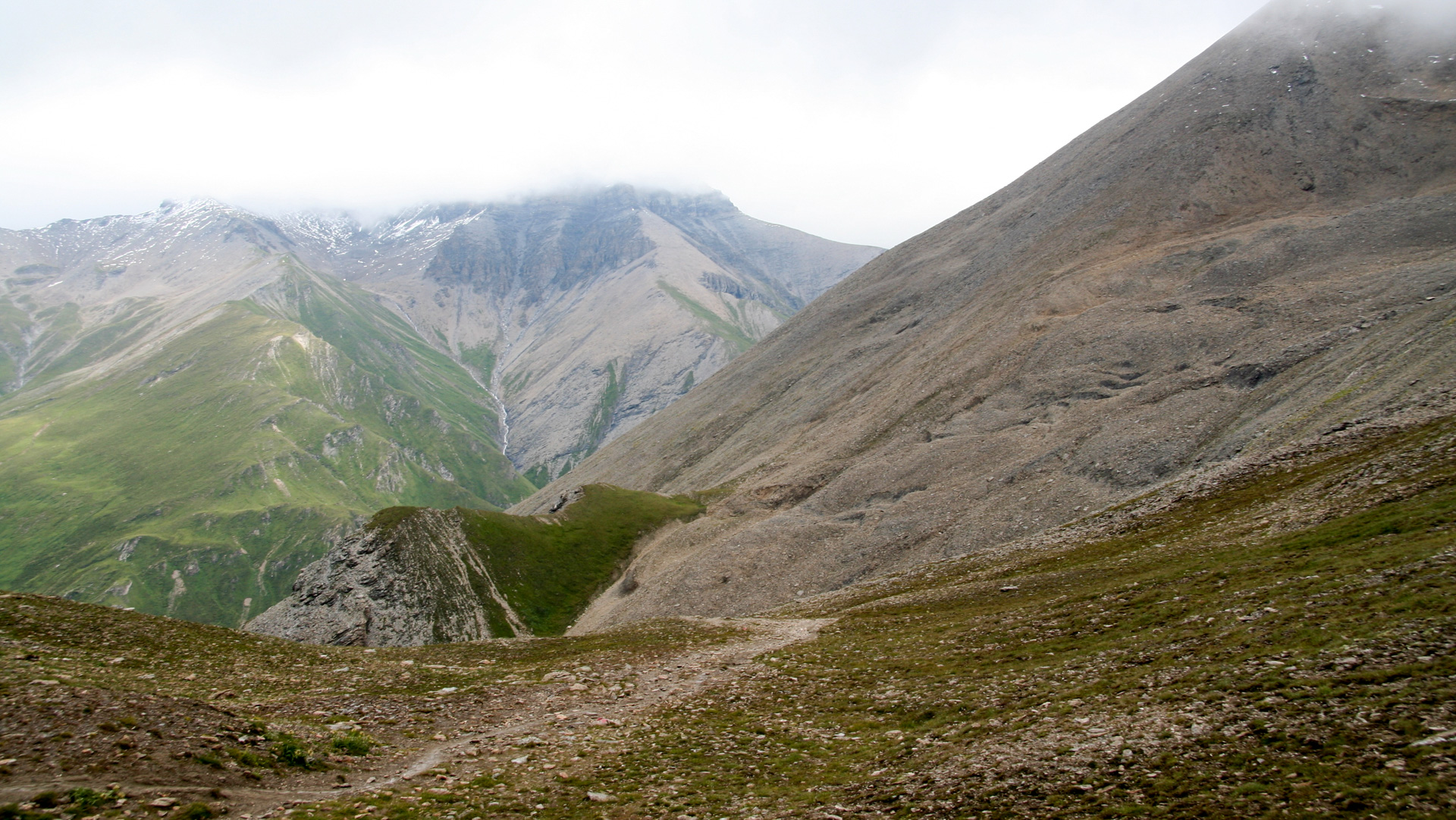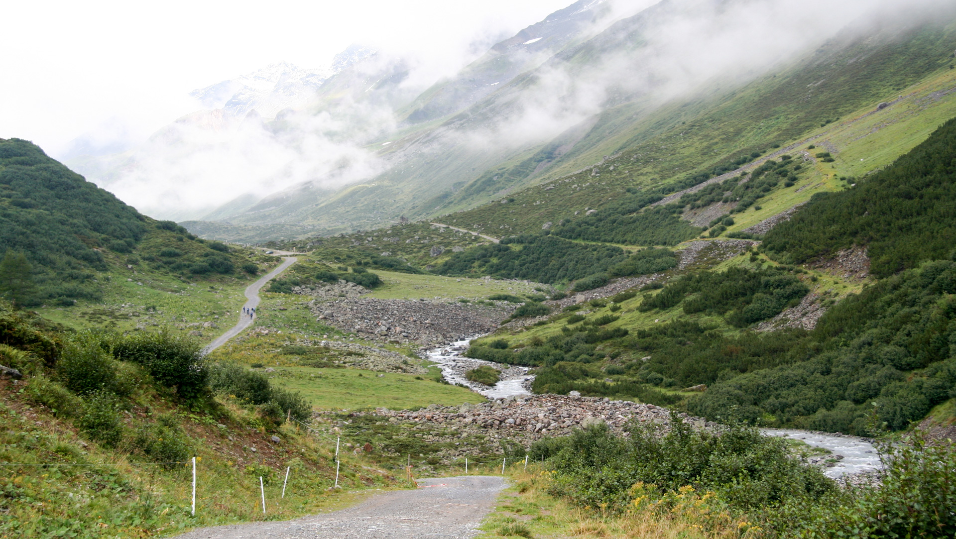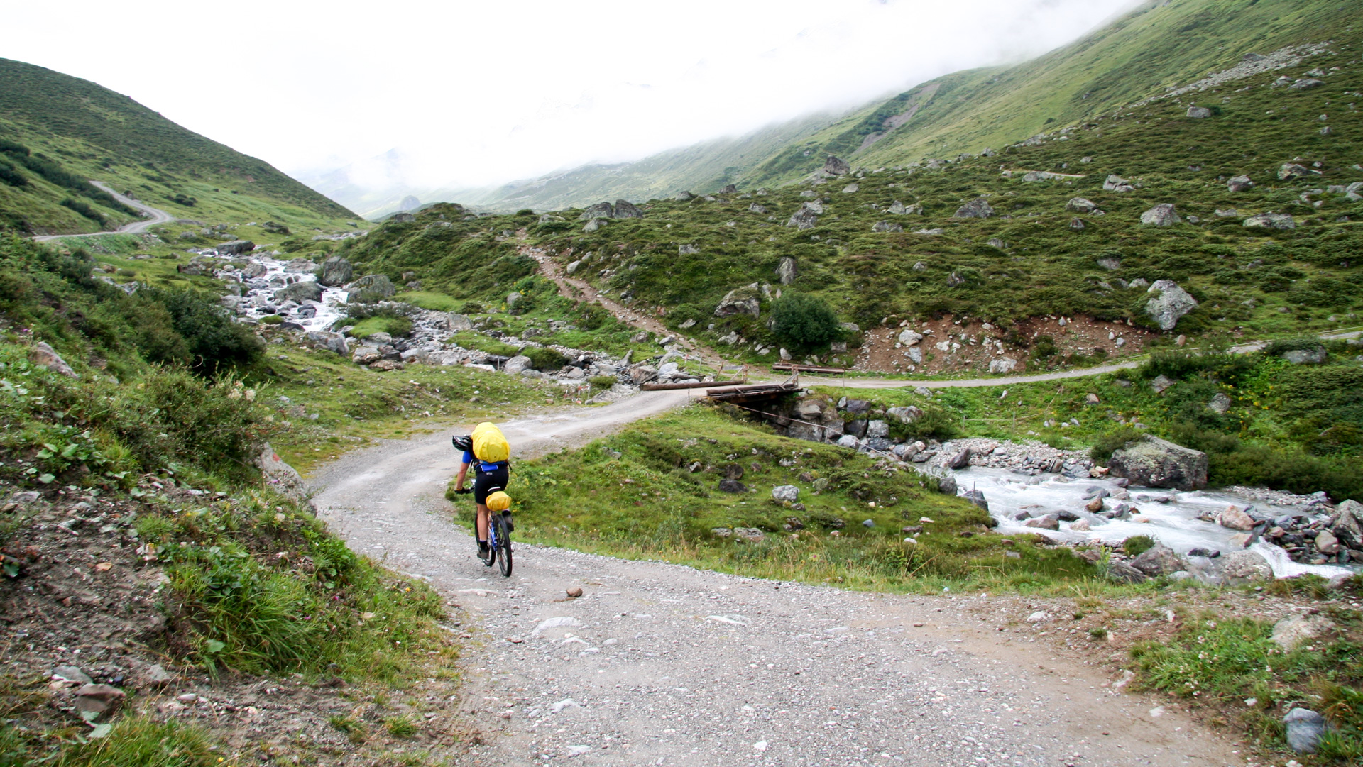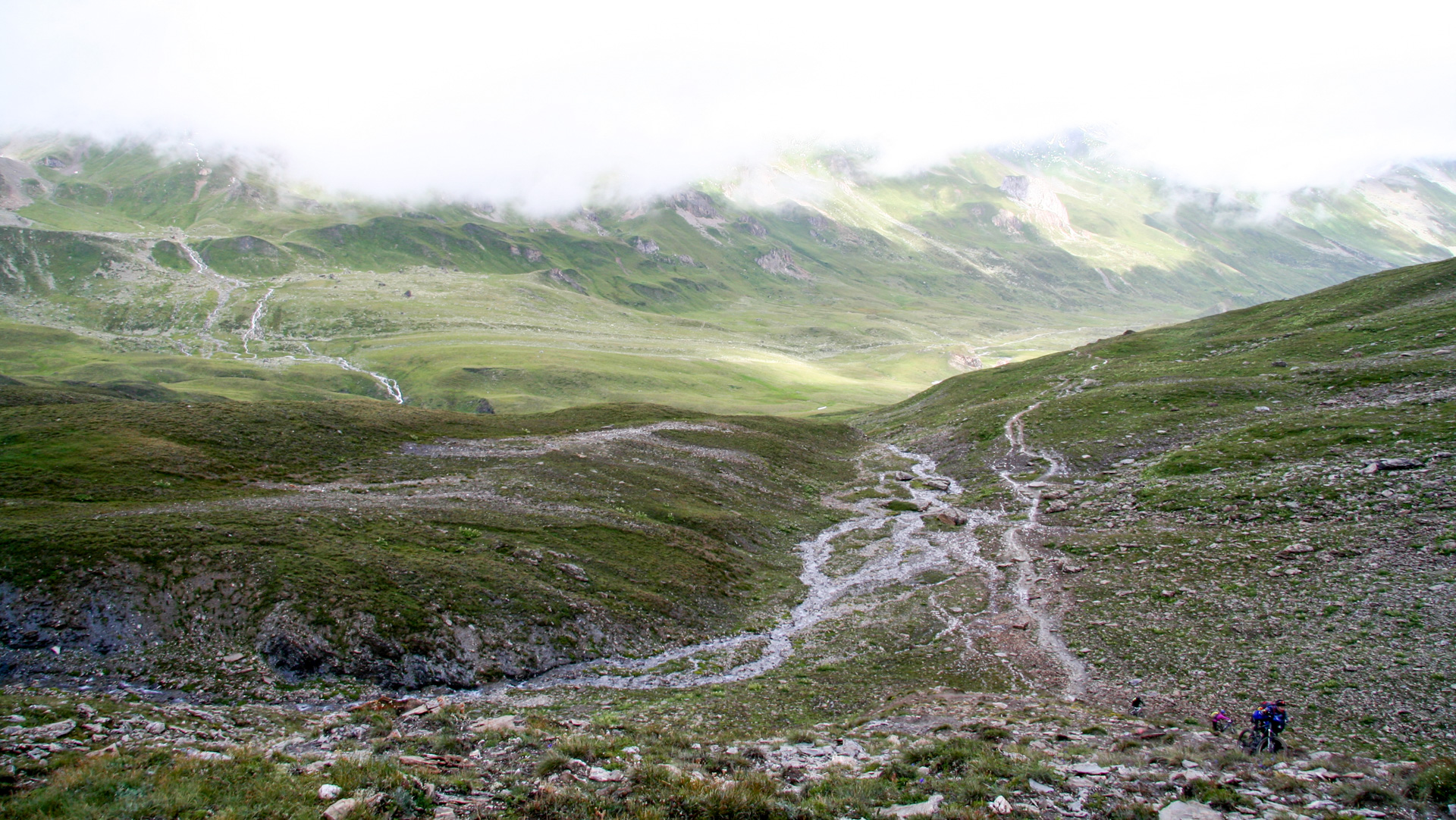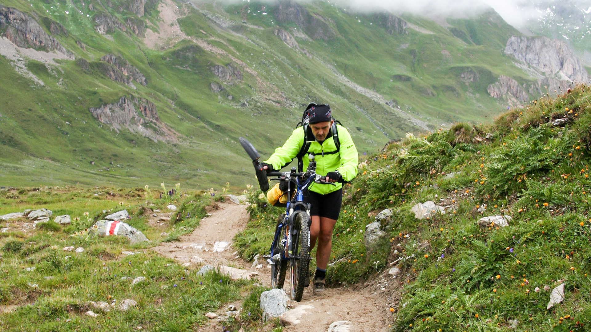 Jetzt beginnt der Aufstieg zum Fimberpass. Nicht ganz so hart wie die Heilbronner Hütte gestern, aber trotzdem fahrunfähig. Der Weg ist ausgewaschen, nass, schlammig vom Regen. Steile Passagen wechseln mit flachen, manchmal knöcheltief im Schlamm.