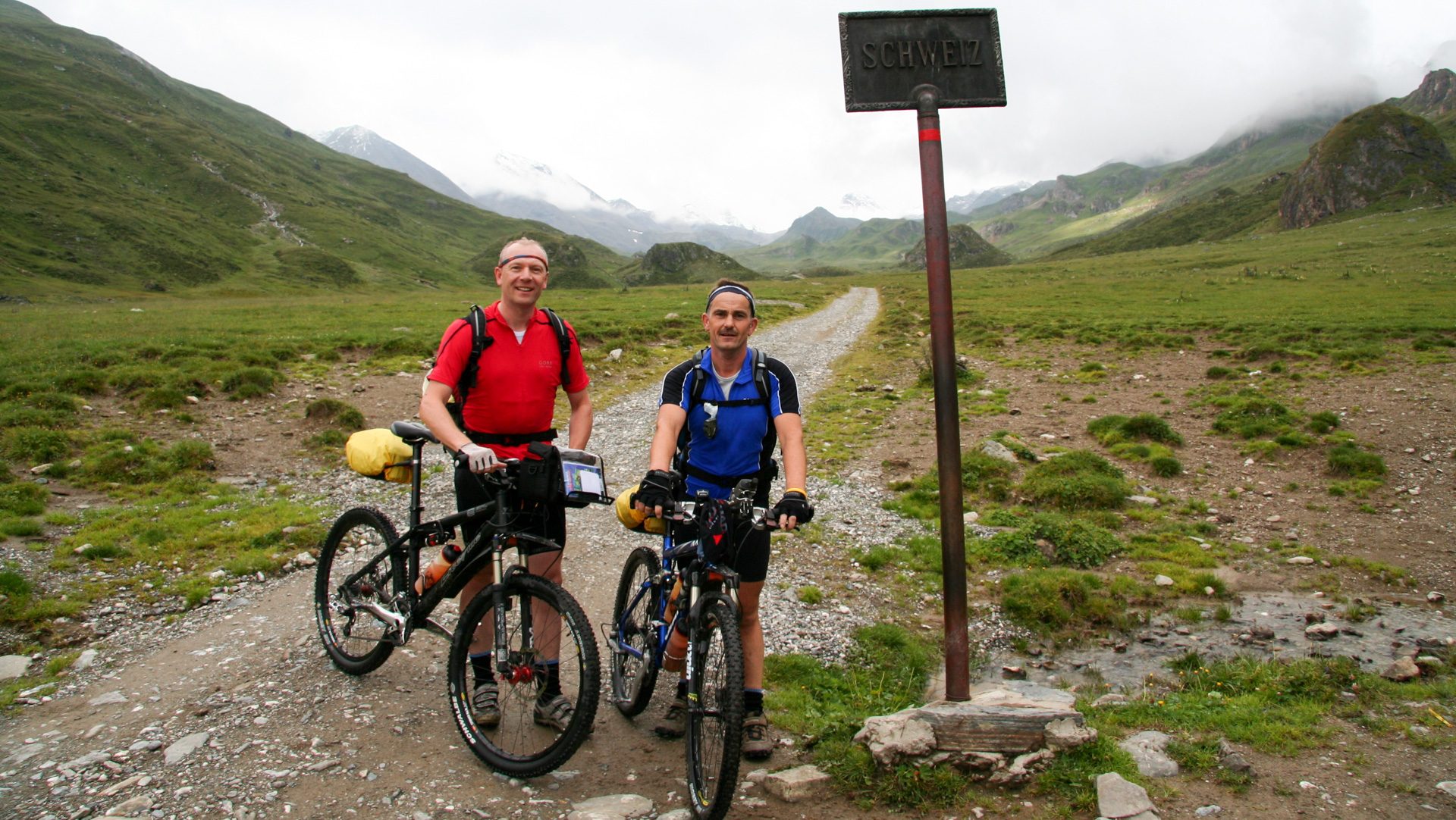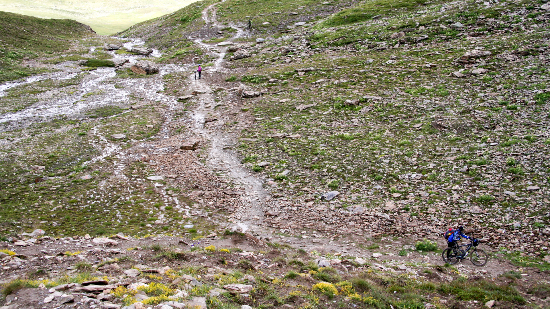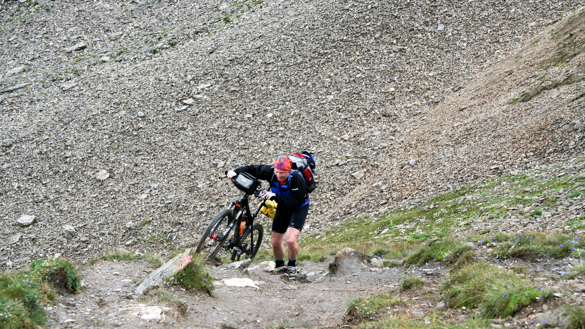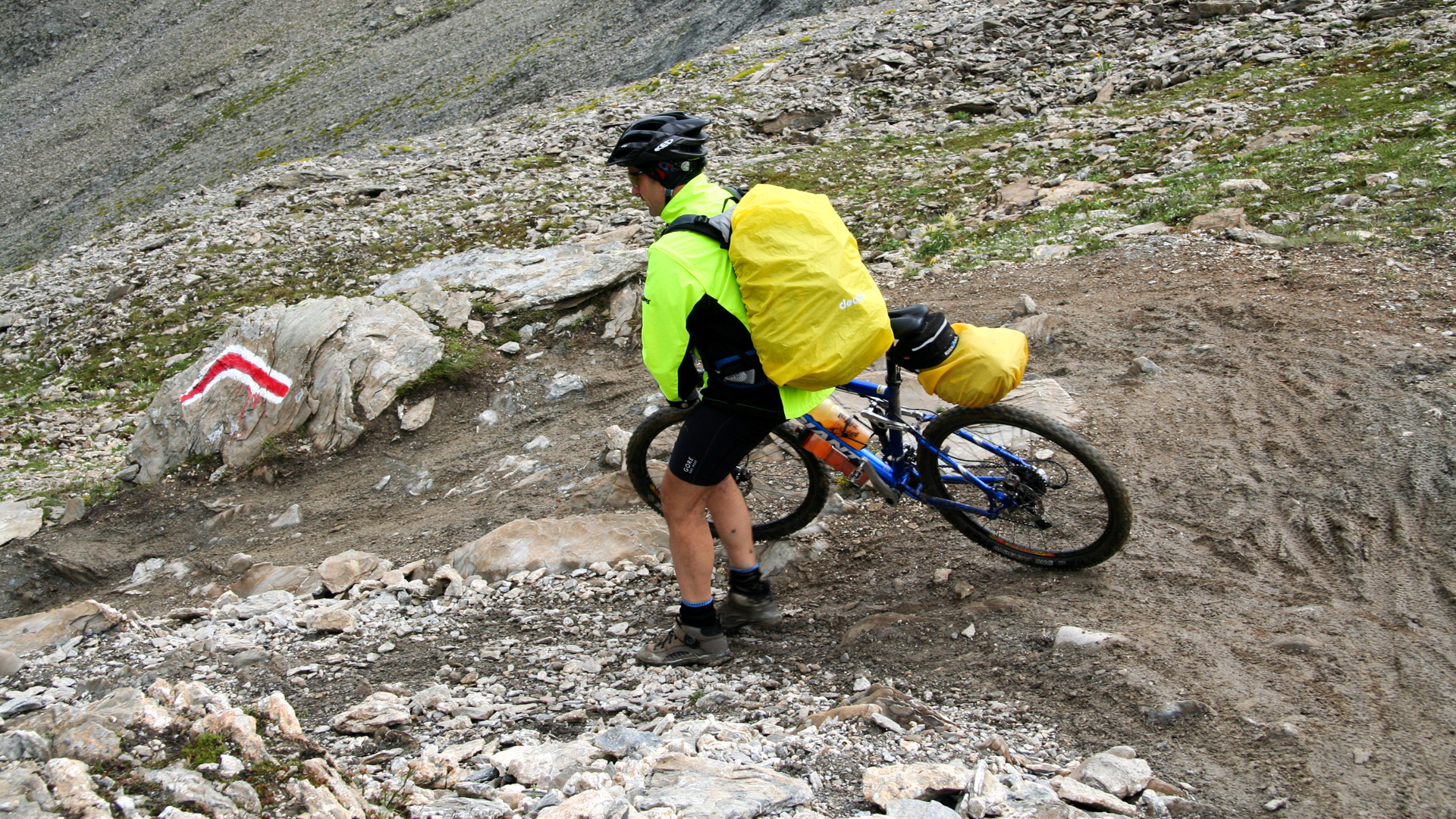 Jetzt beginnt der Aufstieg zum Fimberpass. Nicht ganz so hart wie die Heilbronner Hütte gestern, aber trotzdem fahrunfähig. Der Weg ist ausgewaschen, nass, schlammig vom Regen. Steile Passagen wechseln mit flachen, manchmal knöcheltief im Schlamm.