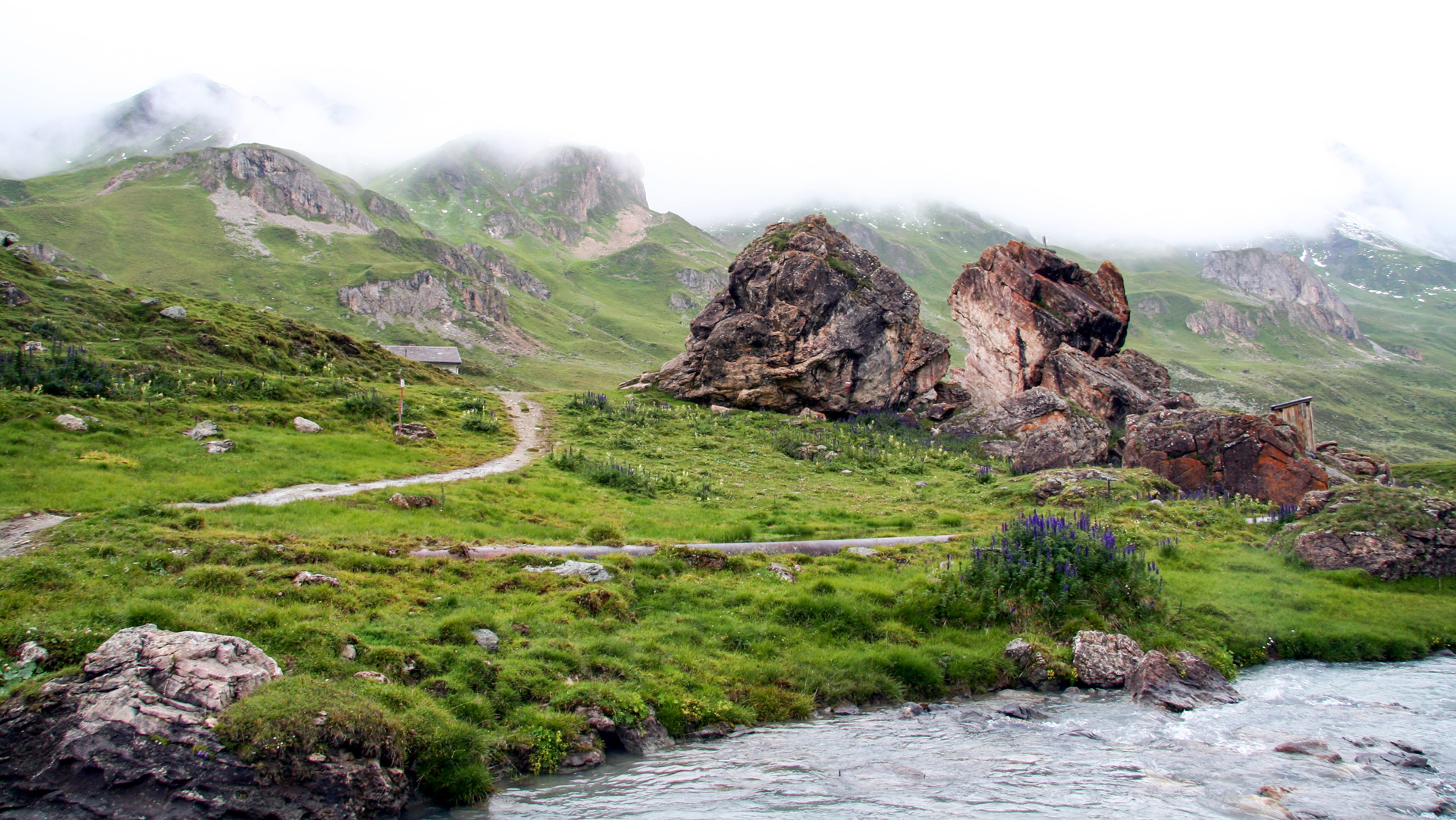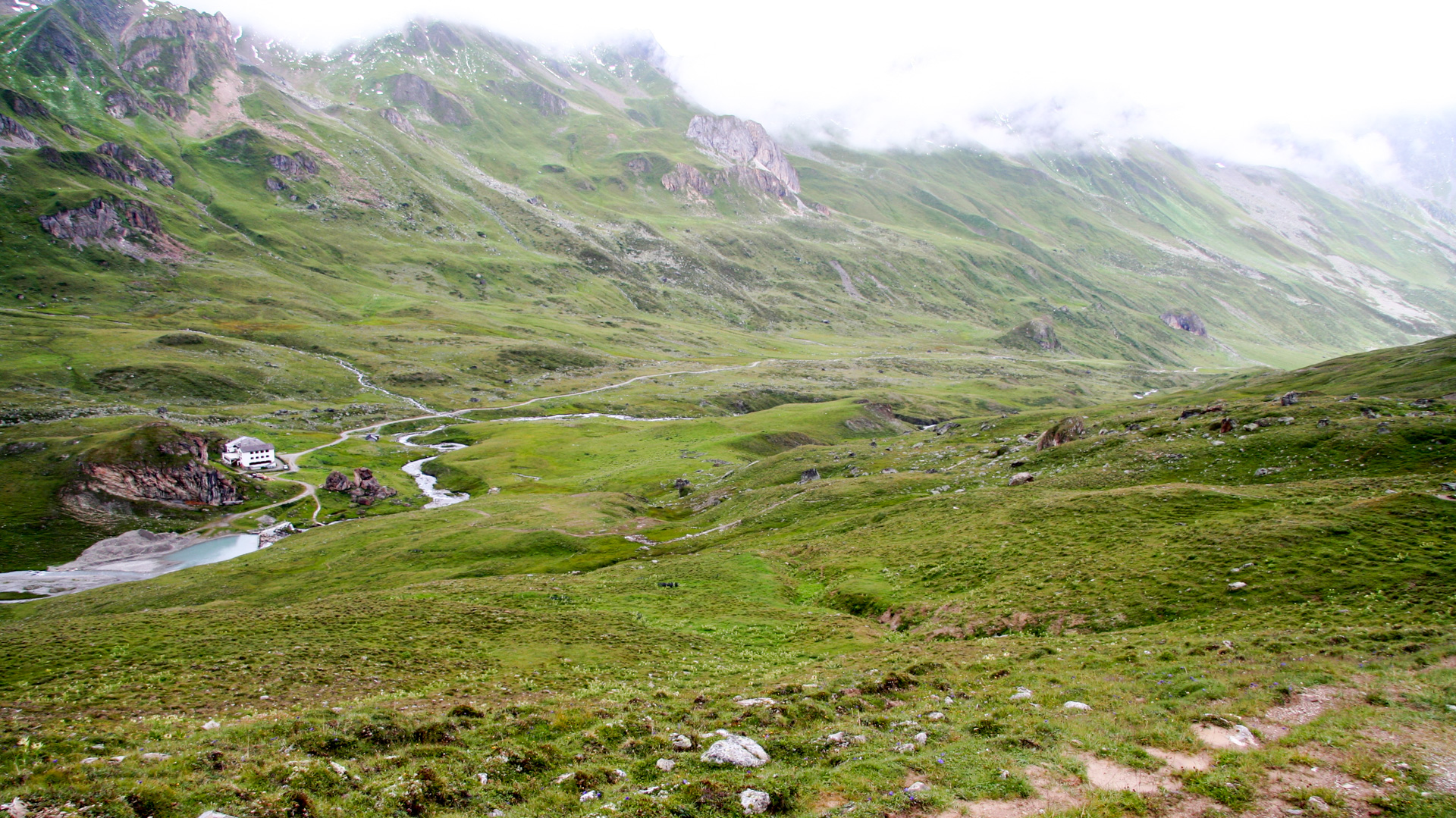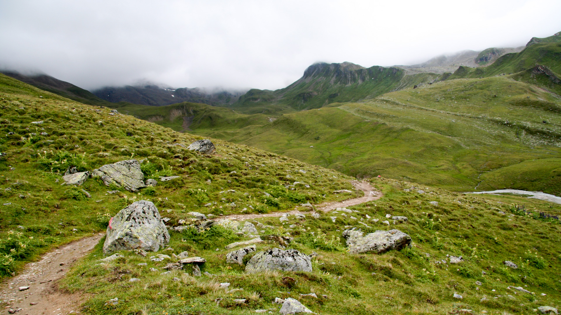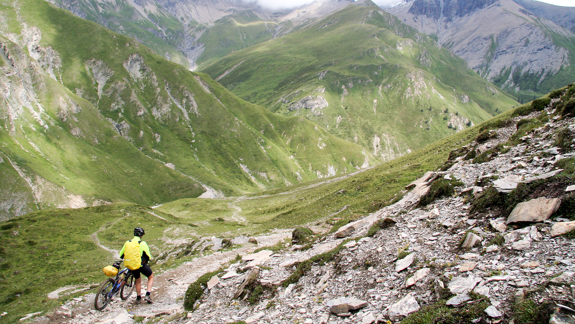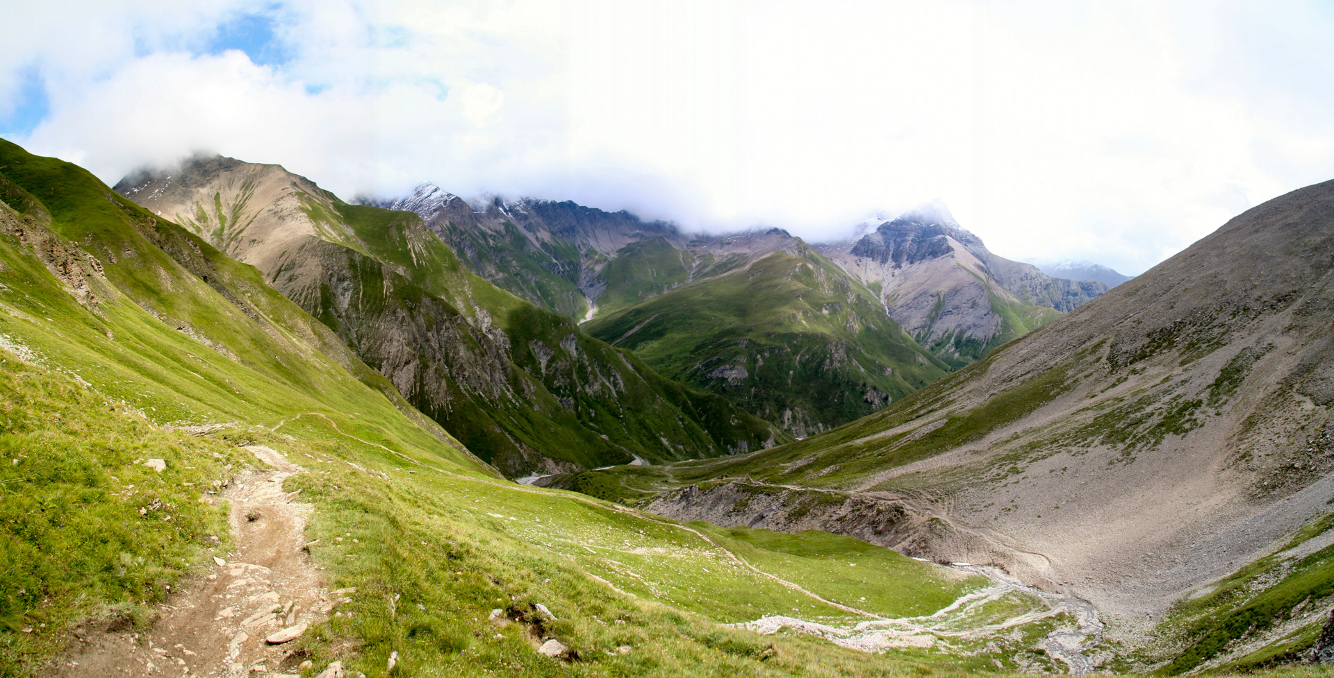 Jetzt beginnt der Aufstieg zum Fimberpass. Nicht ganz so hart wie die Heilbronner Hütte gestern, aber trotzdem fahrunfähig. Der Weg ist ausgewaschen, nass, schlammig vom Regen. Steile Passagen wechseln mit flachen, manchmal knöcheltief im Schlamm.