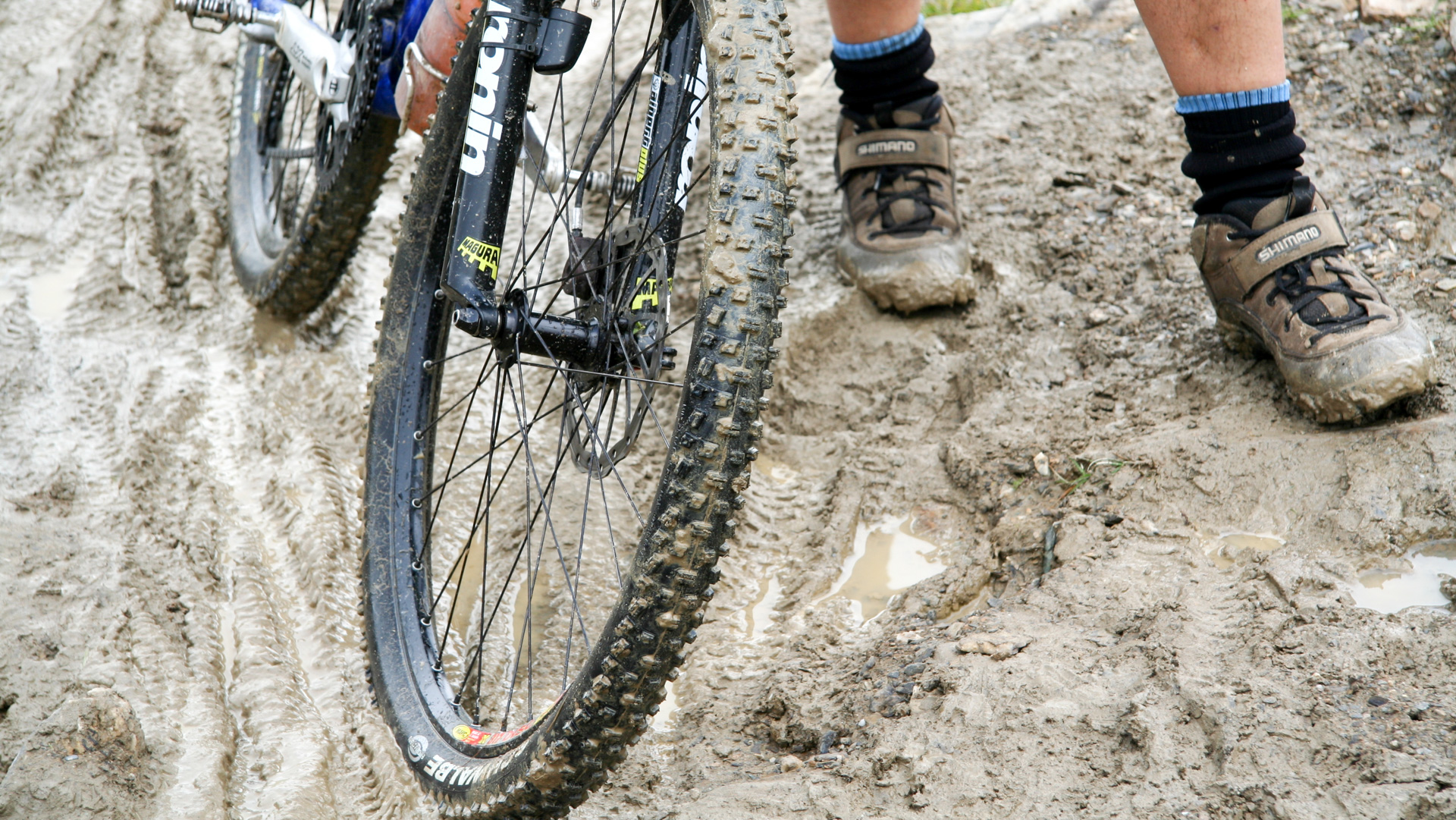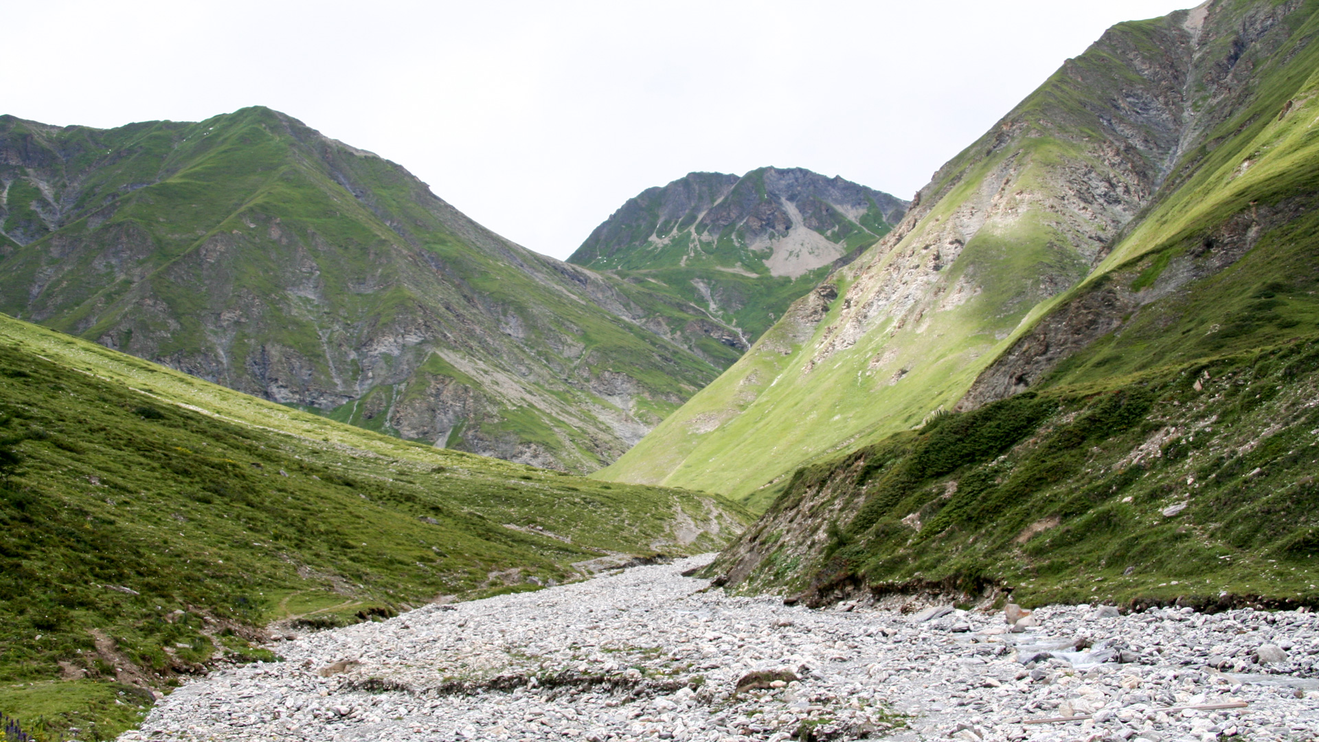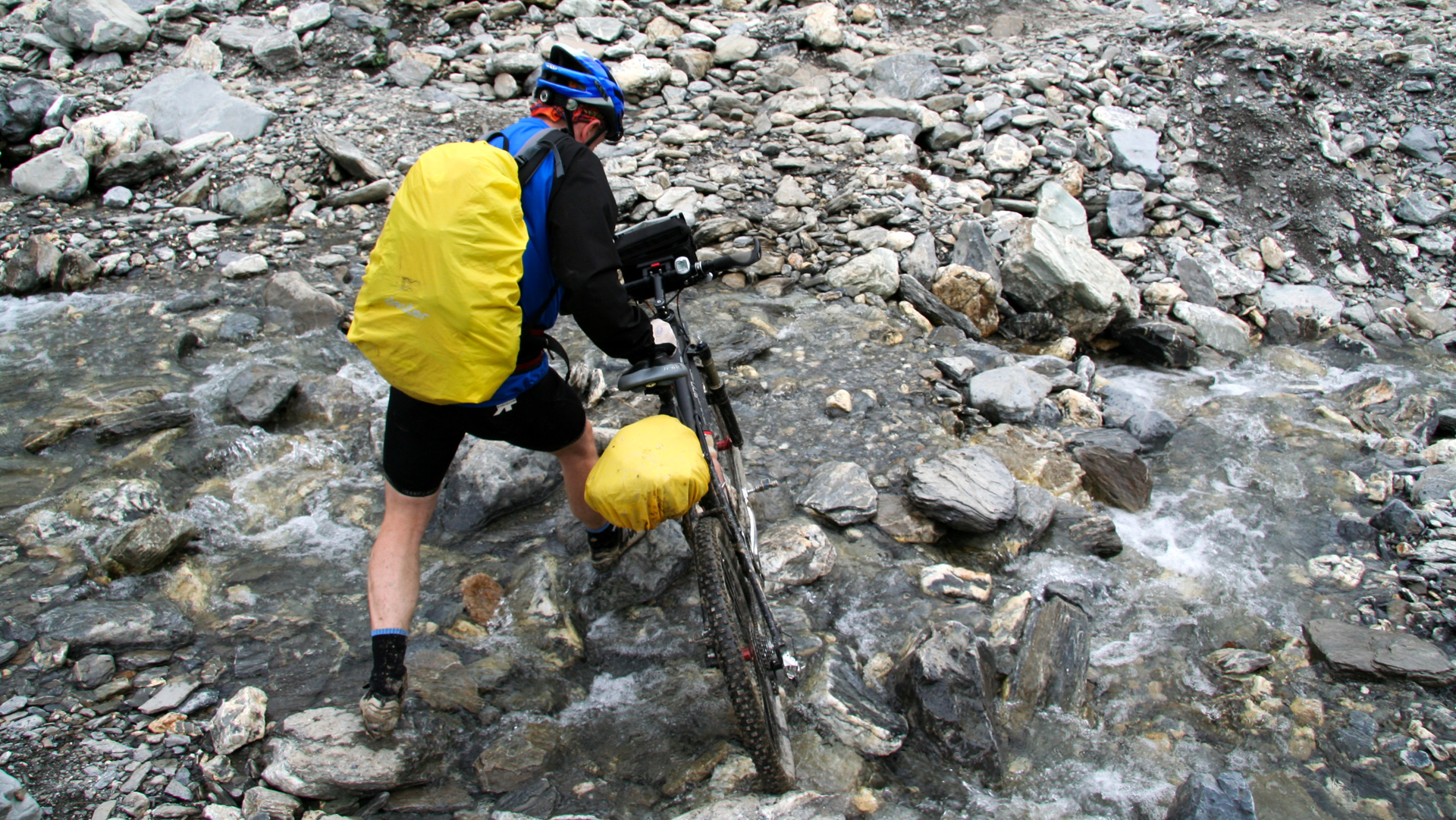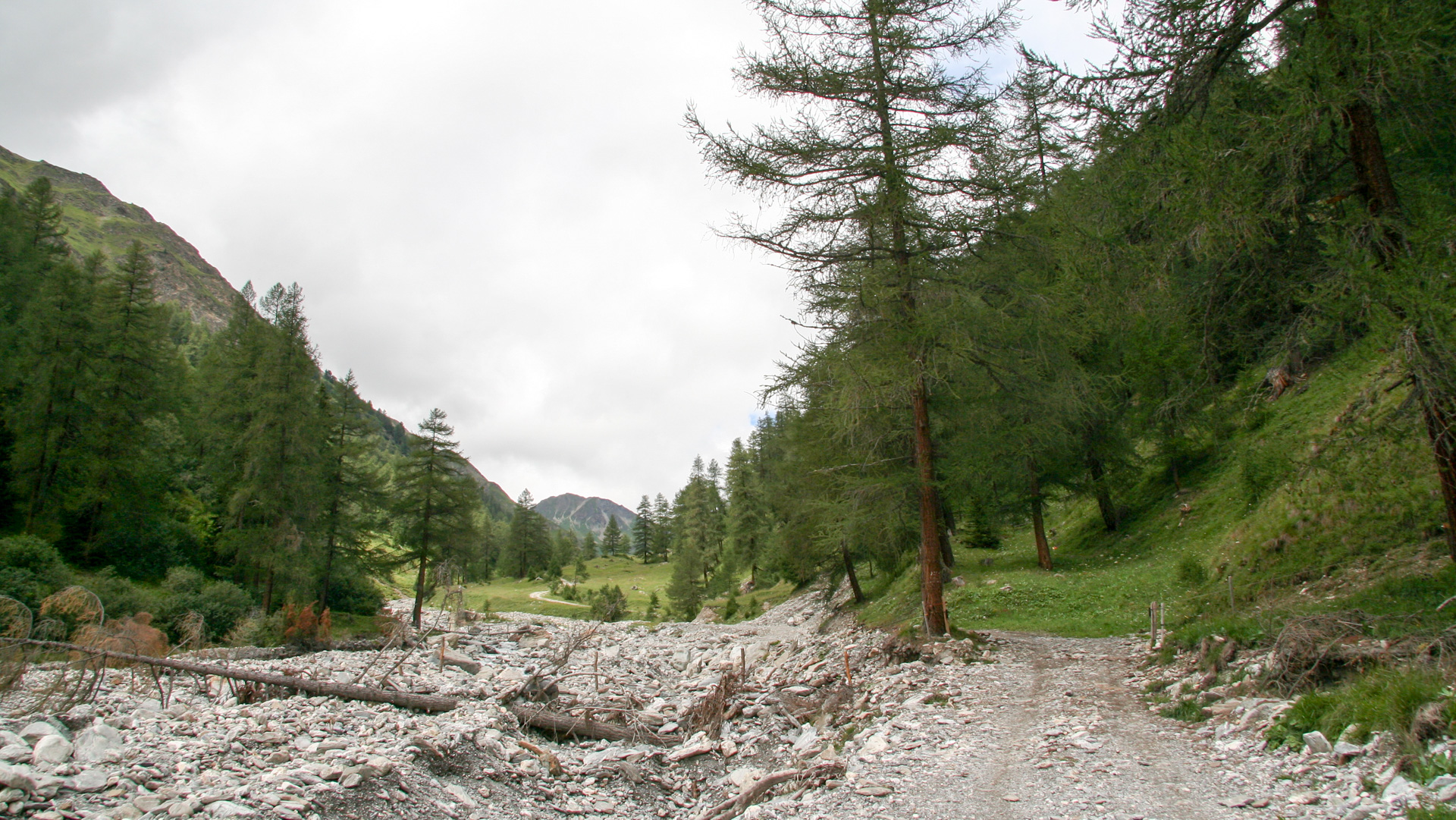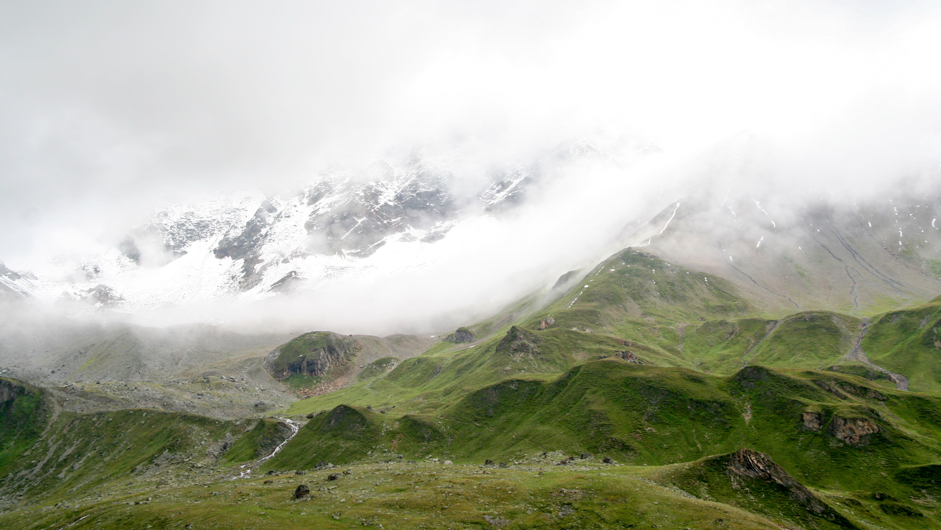 Jetzt beginnt der Aufstieg zum Fimberpass. Nicht ganz so hart wie die Heilbronner Hütte gestern, aber trotzdem fahrunfähig. Der Weg ist ausgewaschen, nass, schlammig vom Regen. Steile Passagen wechseln mit flachen, manchmal knöcheltief im Schlamm.