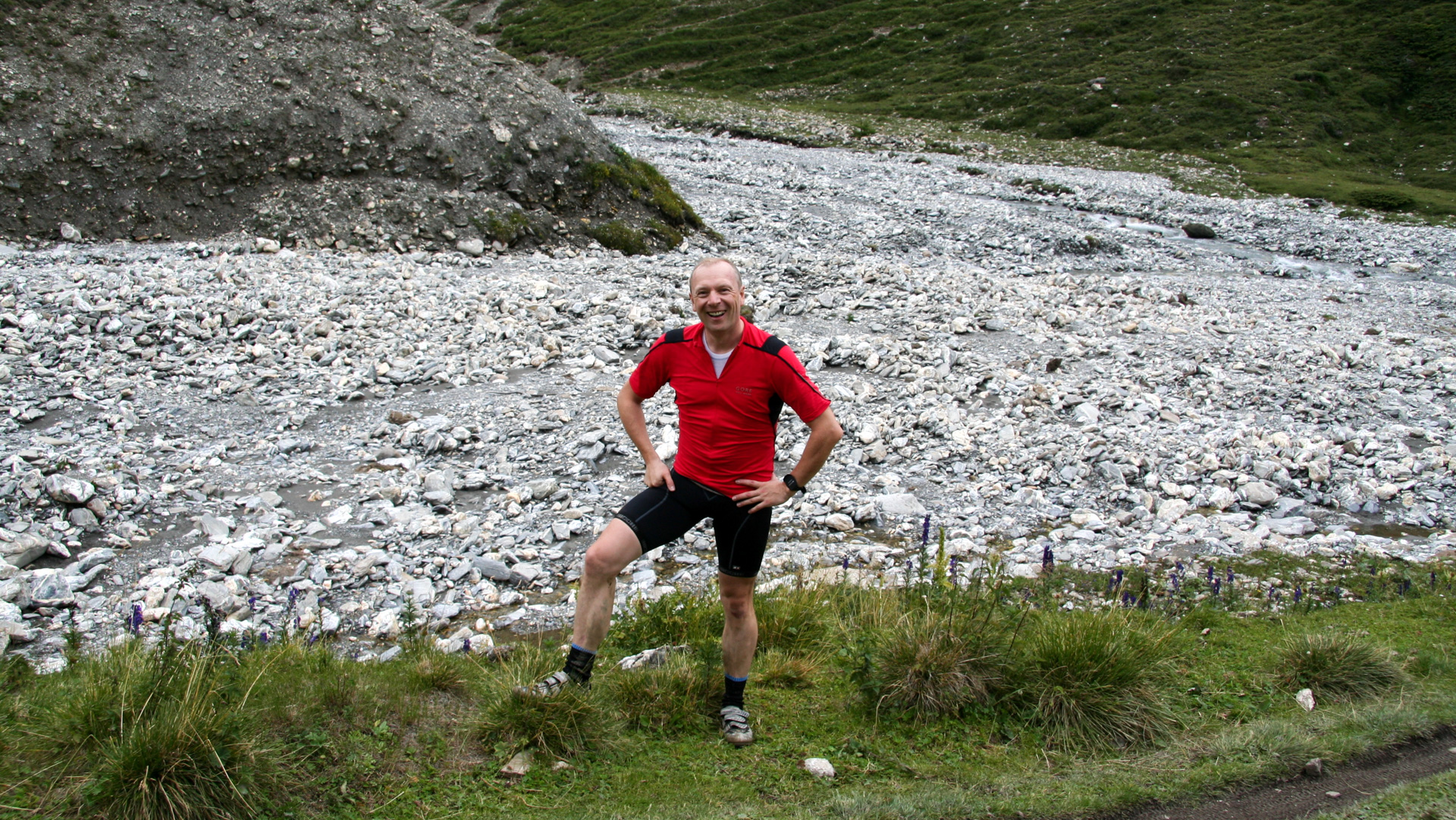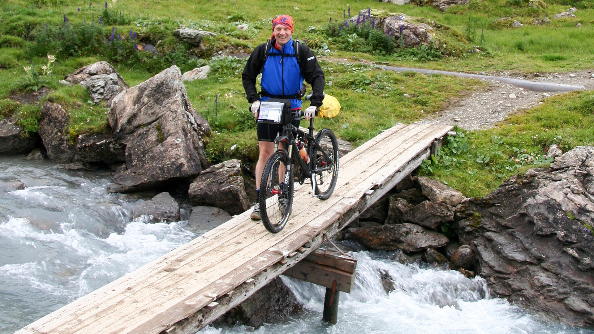 Nach vielen Fotos machen wir uns auf den Rückweg. Menschenhand kann Wunderbares schaffen! Der Bikecomputer zeigt 18:00 Uhr – kaum Wanderer unterwegs, die Abfahrt wird zum Traum. Kleine Trails, verschlungene Schotterwege, Wasserfallbrücke. Ein Mal hakt es: Schuh-Cleat klemmt, Schraube fehlt. Ersatz? Klar im Hotelzimmer – notdürftig repariert, weiter geht’s.