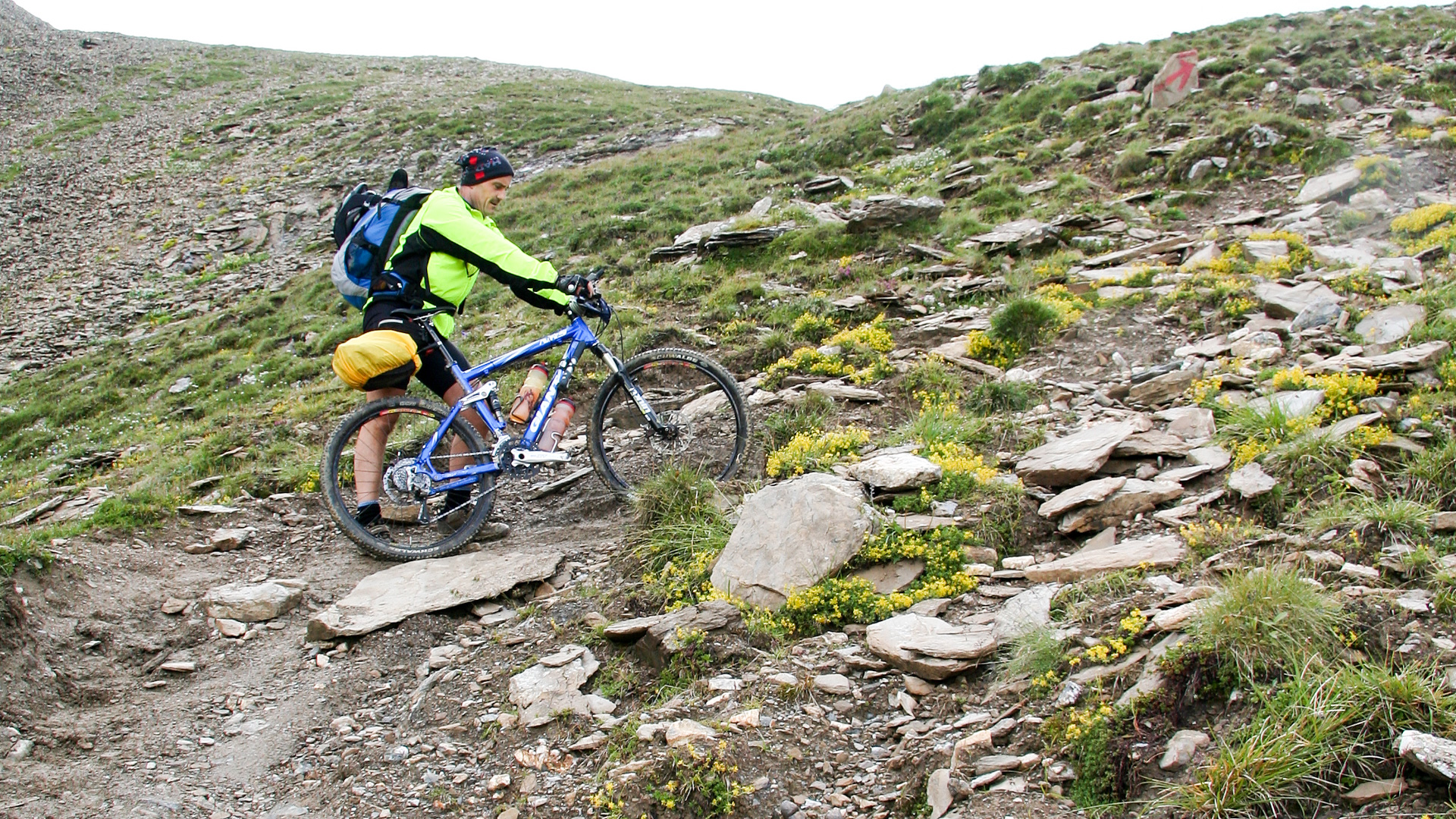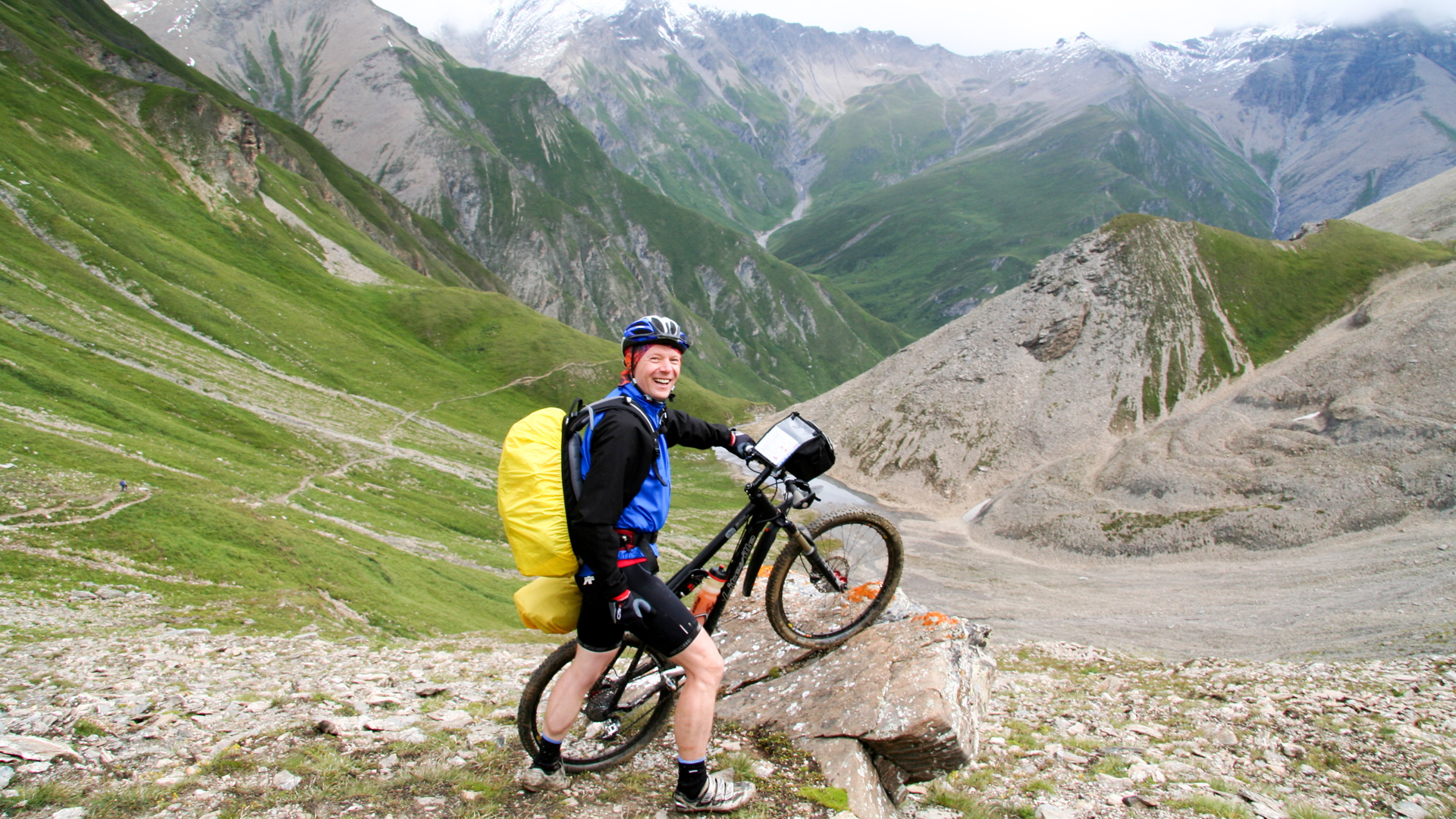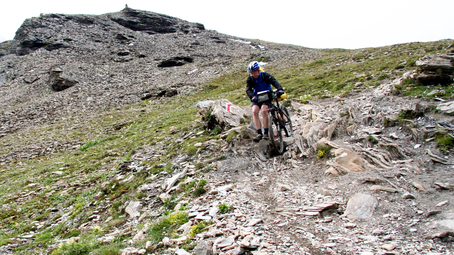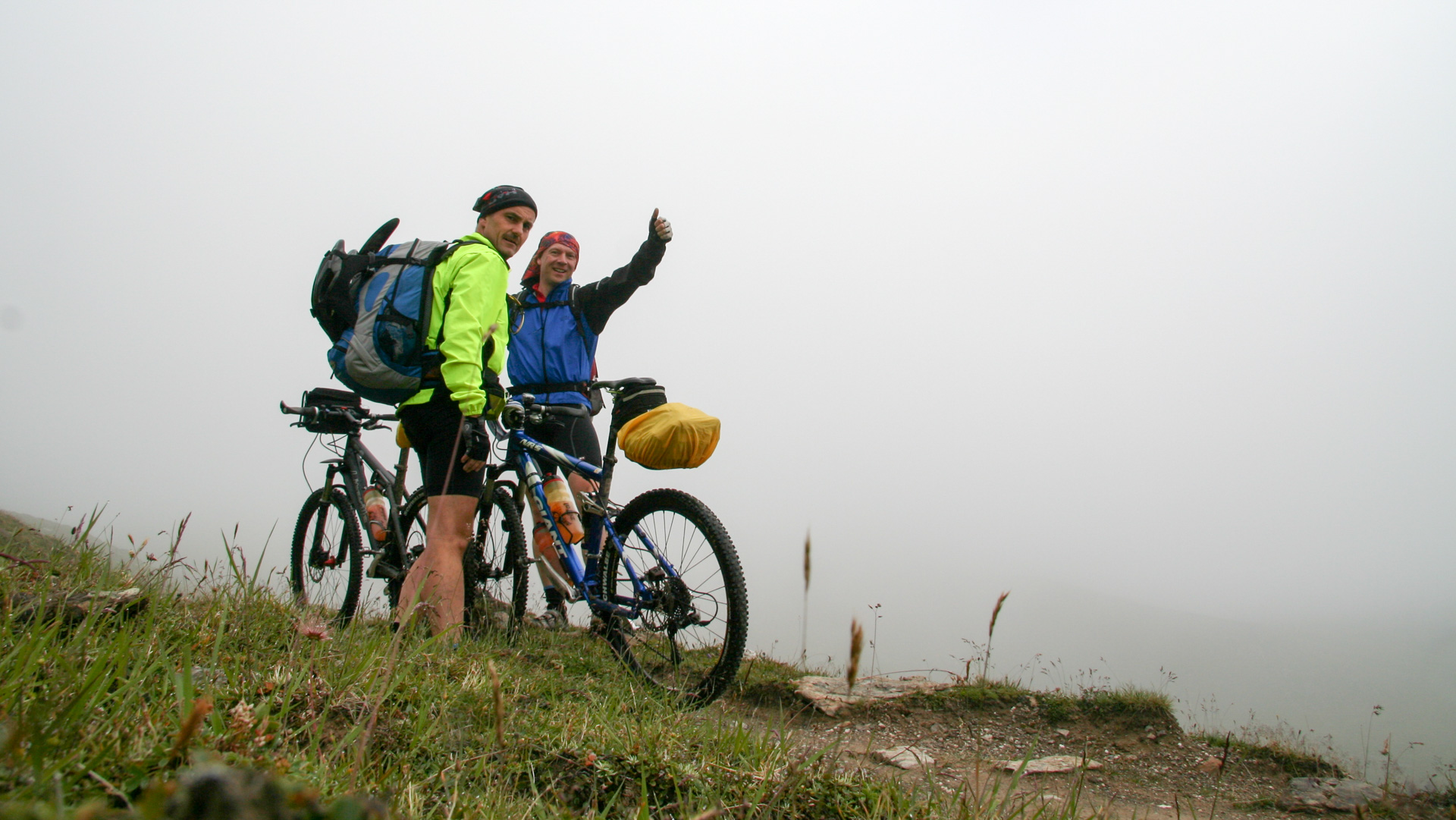 2,5 Kilometer, 350 Höhenmeter – in knapp einer Stunde oben. 2.600 Meter über dem Meer! Ein tolles, erhabenes Gefühl. Handshake, Gruppenfoto mit Selbstauslöser, ein paar Panoramabilder trotz Nebel. Kalt, durchgeschwitzt – keine Zeit, lange zu bleiben. Vom Gipfel sieht man einen tollen Singletrail, aber für uns „Flachlandtiroler“ oft nur absteigen oder schieben. Große Steingefälle, hohe Absätze, grobes Geröll – auf einem mehrtägigen Abenteuer riskiert man hier keinen Sturz.