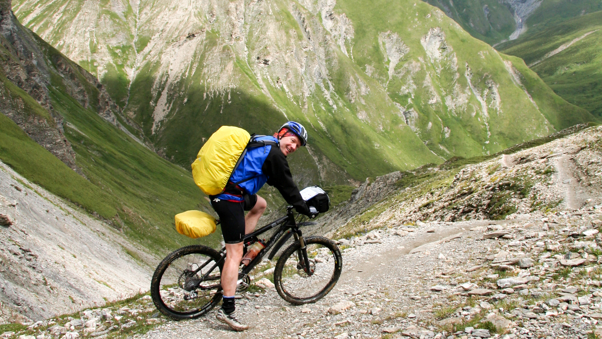 Start auf knackigem Schotterweg bis zur Alpe Uina Dadaint, danach Pfad bis zur Felsschlucht. Dann heißt es schieben, 8,5 Kilometer und 850 Höhenmeter bis zur Galerie der Schlucht. Felsenwege, Tunnels, Höhlen, Abgründe von geschätzten 300 Metern. Der letzte Kilometer nur zu Fuß, steil, schroff, enge Wege – Seil hilft bei den engsten Passagen.