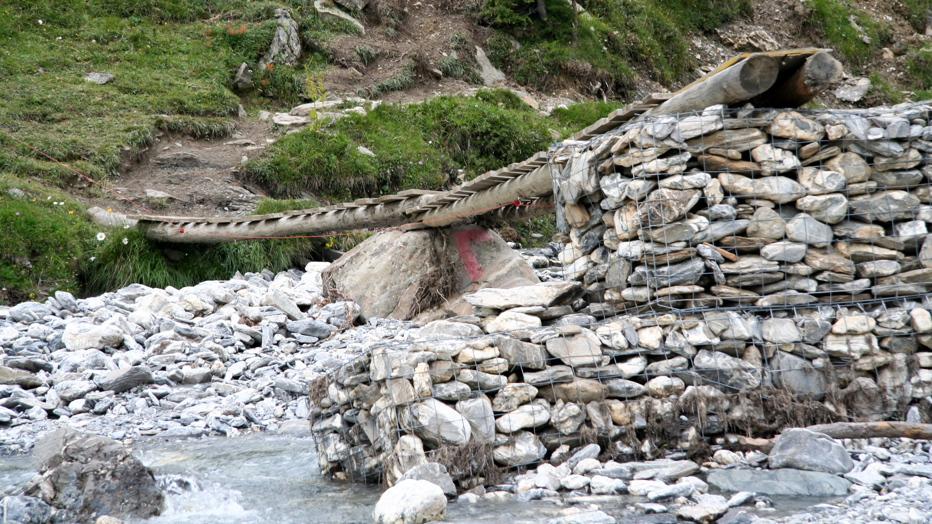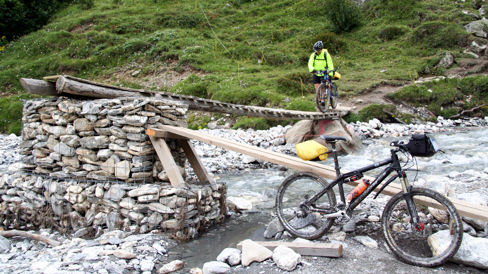 Glücklich erreichen wir Alp Chöglias, eine kleine, geschlossene Hütte. Ein Kilometer weiter bergab, manchmal durch ein Flussbett, und wir stehen vor einer beeindruckenden Brücke aus Stein und Drahtgeflecht, Schweizer Baukunst pur. Wacklig? Vielleicht. Aber stabil genug. Weiter über Forstwege nach Griosch, rasante Wiesenabfahrt, Wurzeltrail nach Vna, vorbei am Kurhaus Val Sinestra, dann auf Naturstraße nach Sur En.