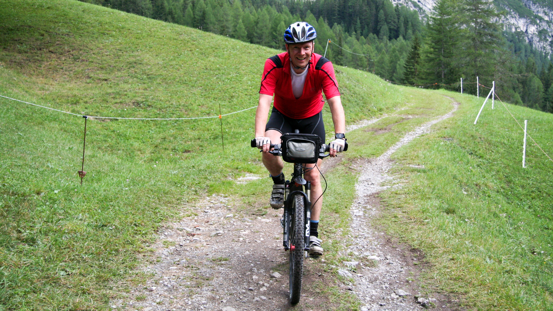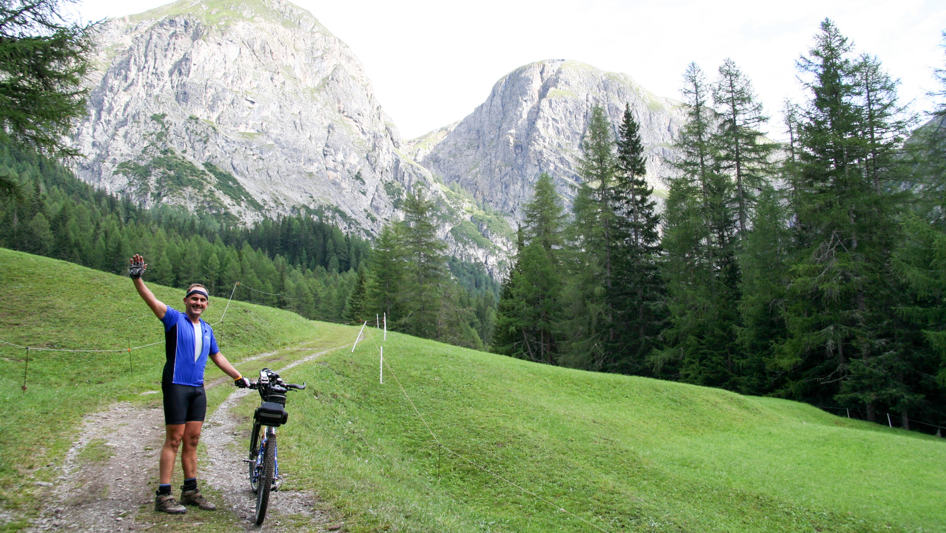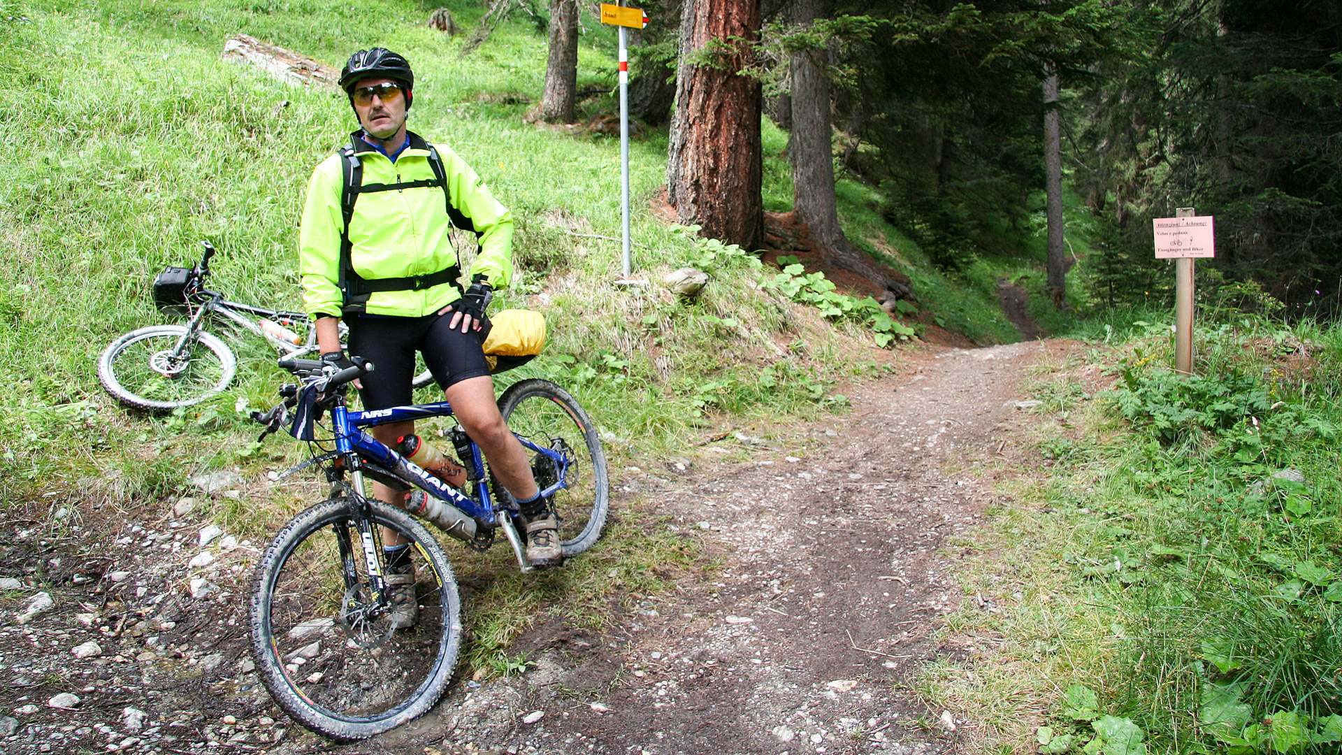 Halbwegs unterwegs überholt uns eine Vierergruppe rasend schnell. Einheimische? Falsch gedacht: eine Fahrerin sitzt am Wegrand, aufgeschundenes, blutendes Knie, kleine Steinsplitter überall. Das Bike hängt am Geländer – Glück im Unglück, 100 Meter Abgrund gesichert! Wir helfen, Englisch wird gesprochen, ihre Freunde erscheinen. Nach kurzer Hilfe weiter, zwanzig Minuten später stehen wir wieder vor dem Hotel VAL D’UINA – geschafft, glücklich, unverletzt und voller Eindrücke.