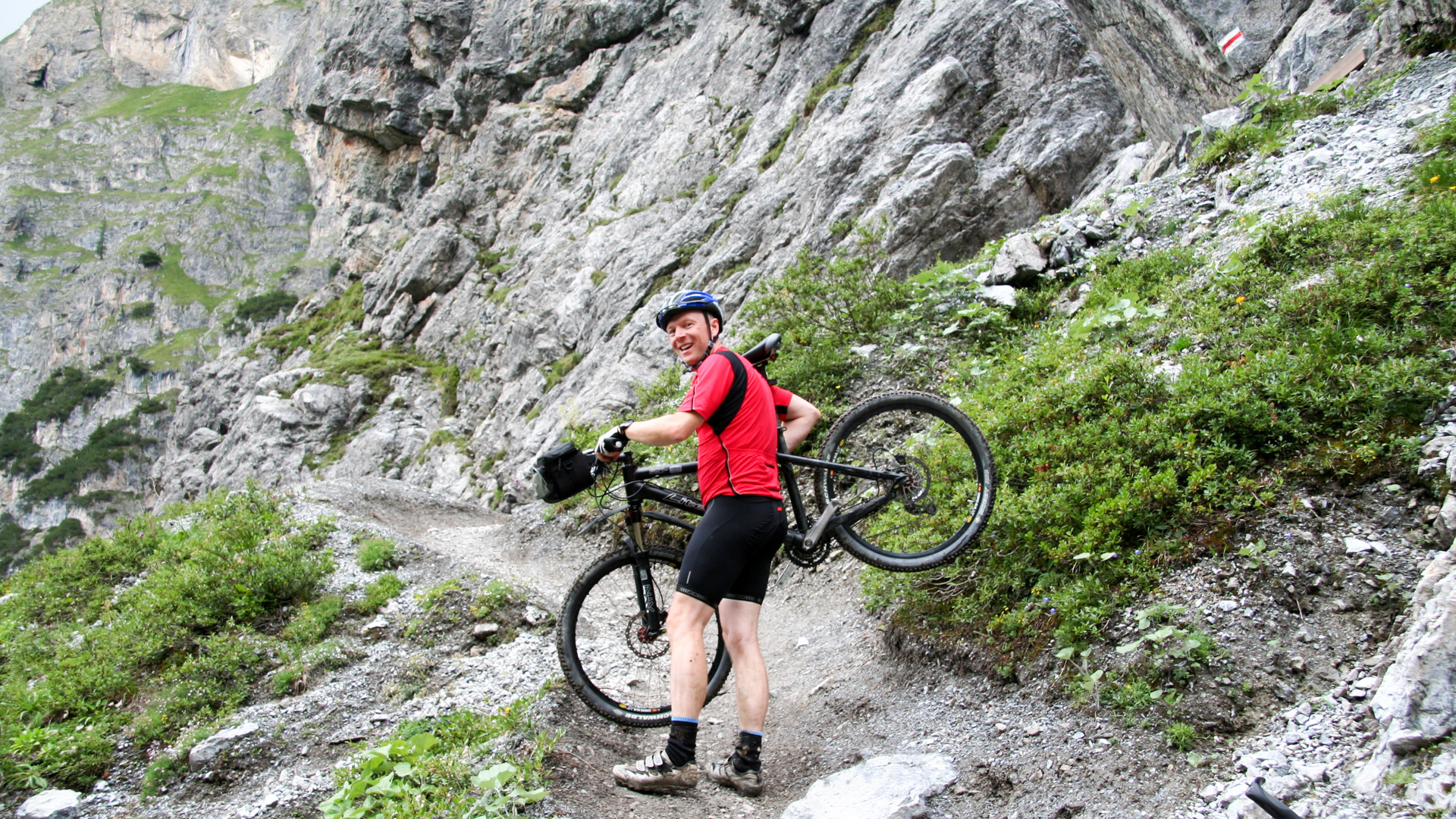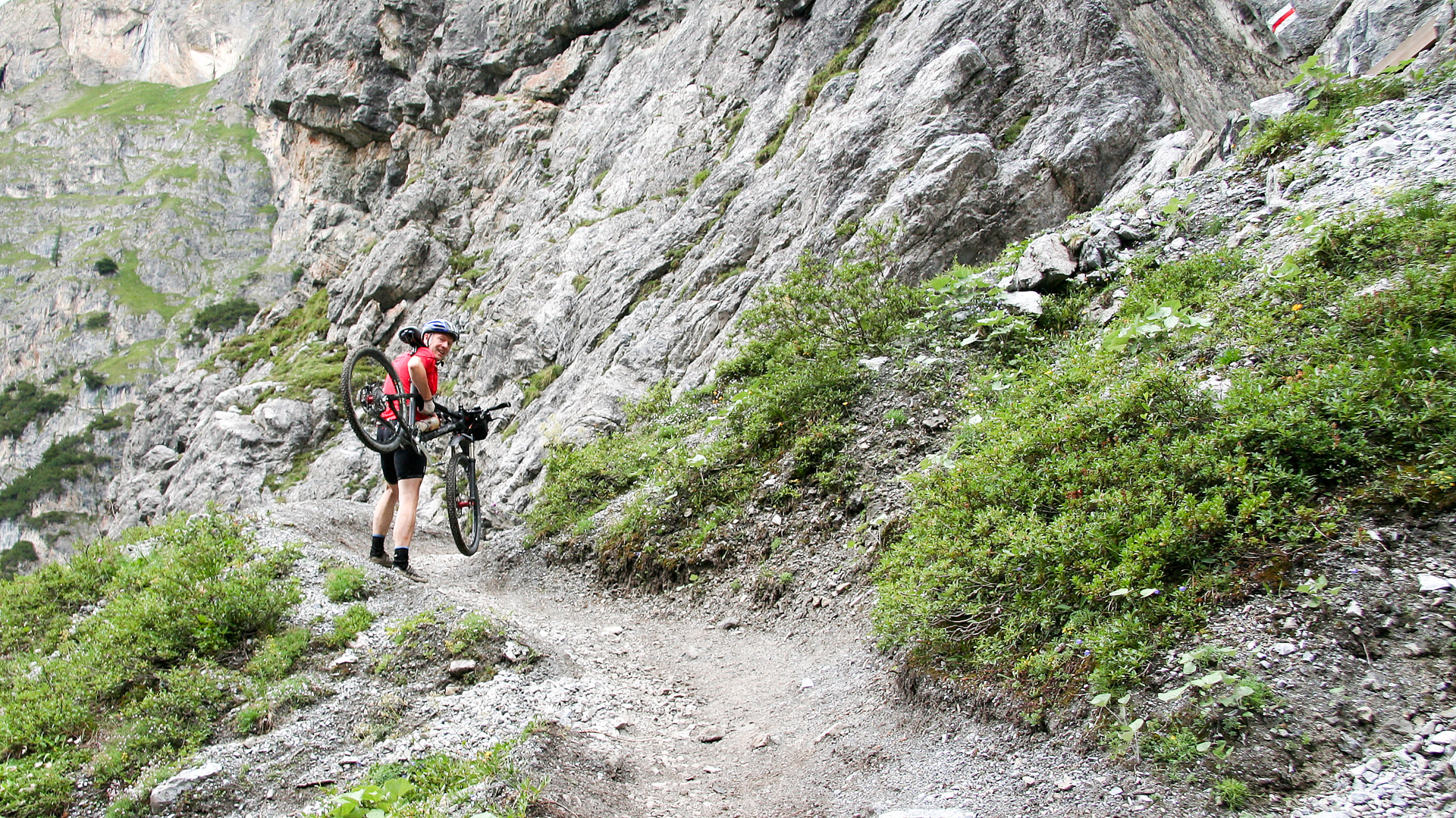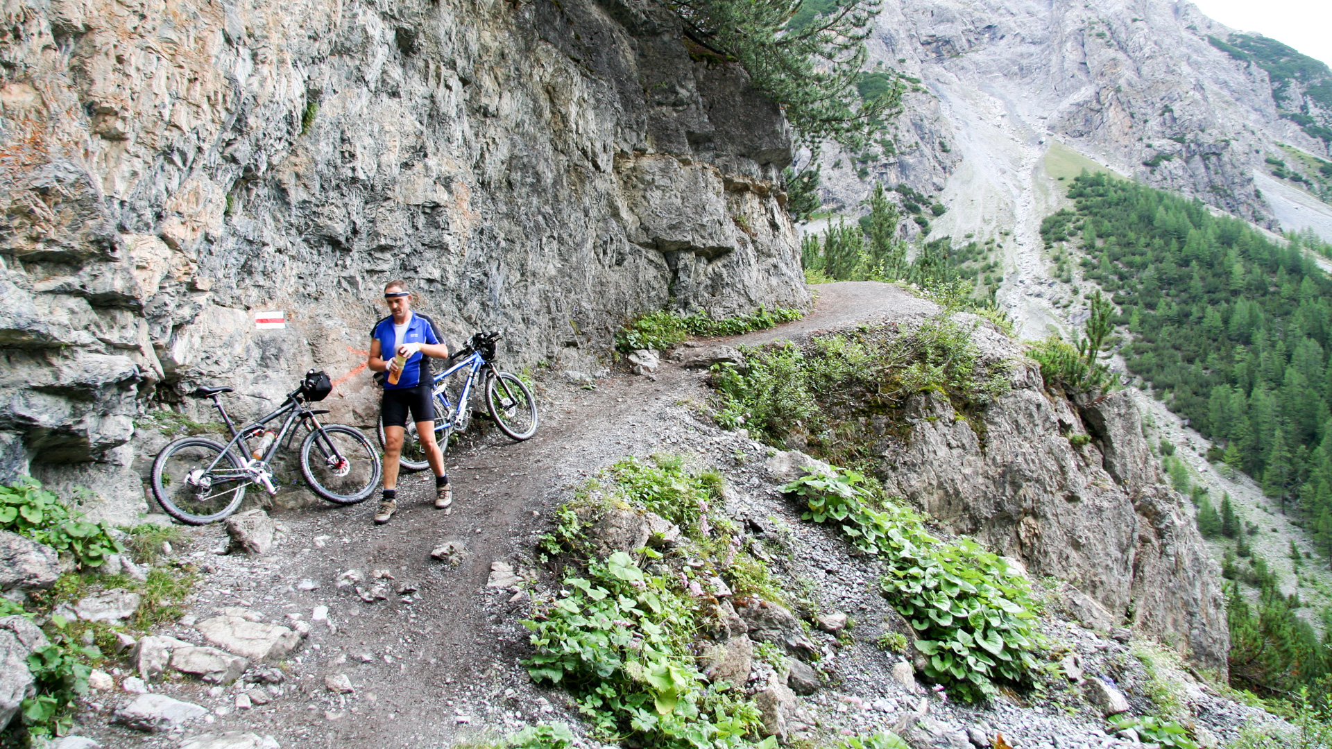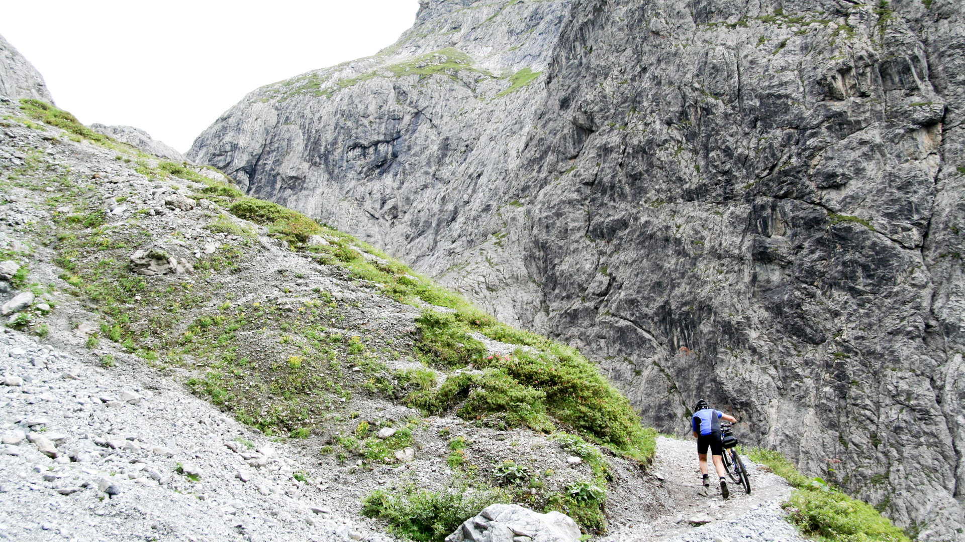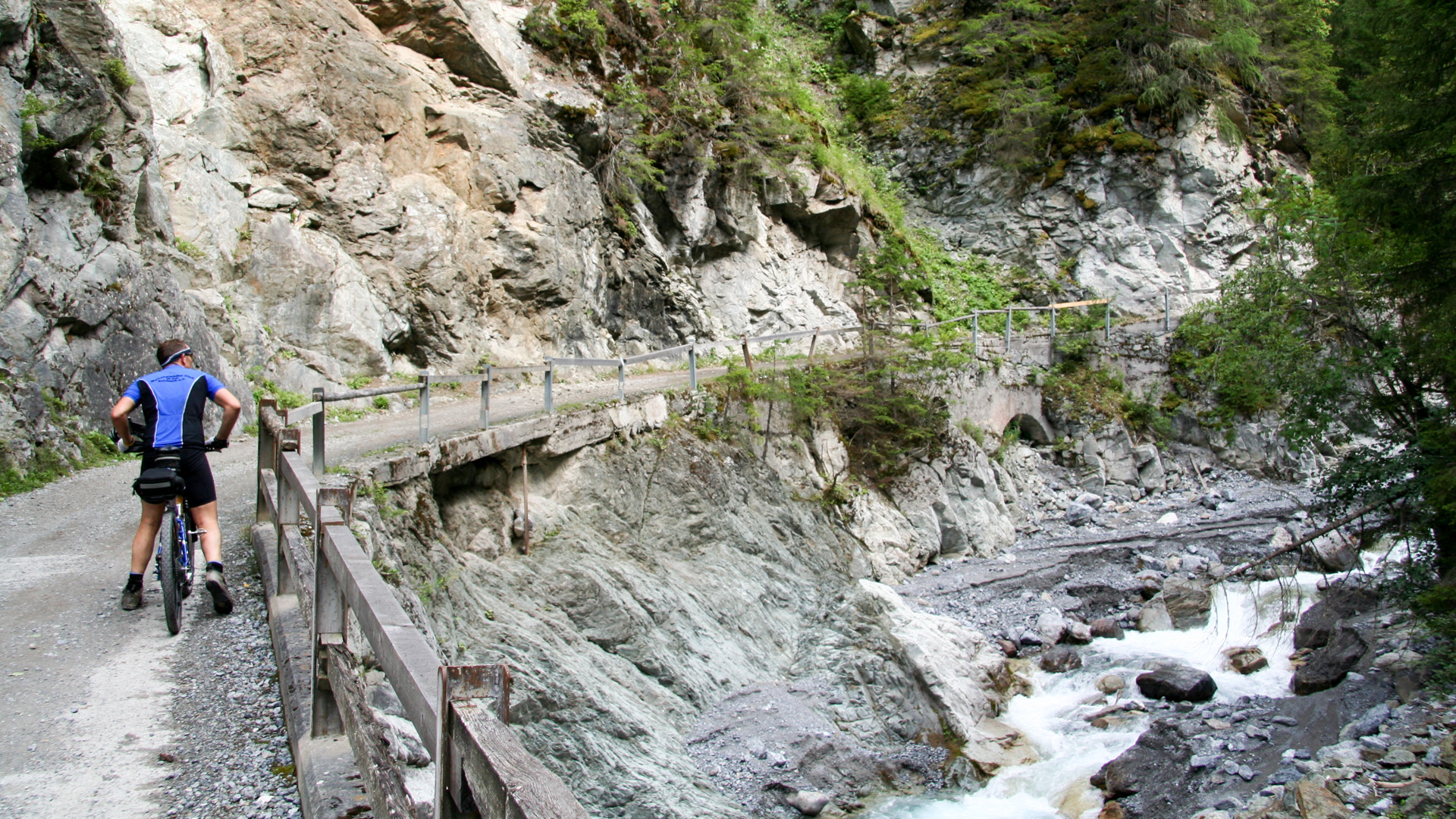 Start auf knackigem Schotterweg bis zur Alpe Uina Dadaint, danach Pfad bis zur Felsschlucht. Dann heißt es schieben, 8,5 Kilometer und 850 Höhenmeter bis zur Galerie der Schlucht. Felsenwege, Tunnels, Höhlen, Abgründe von geschätzten 300 Metern. Der letzte Kilometer nur zu Fuß, steil, schroff, enge Wege – Seil hilft bei den engsten Passagen.