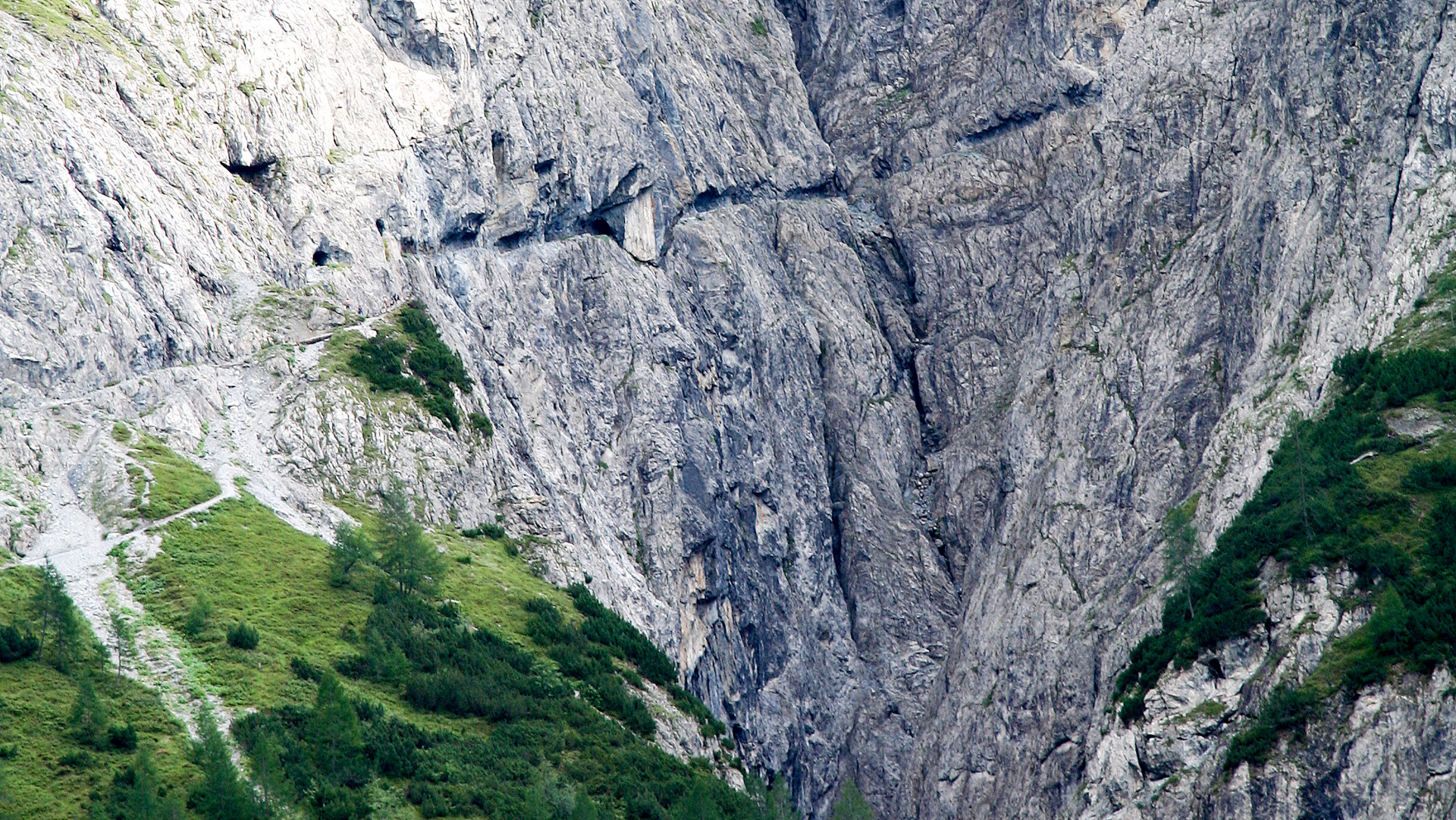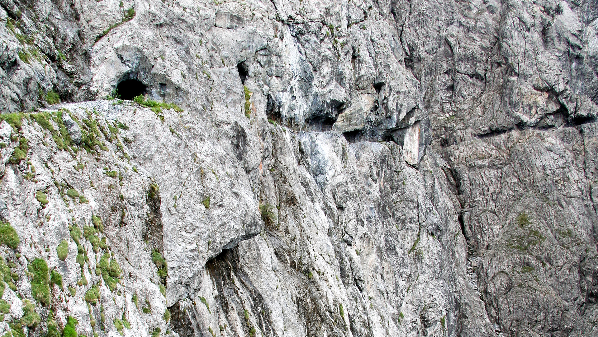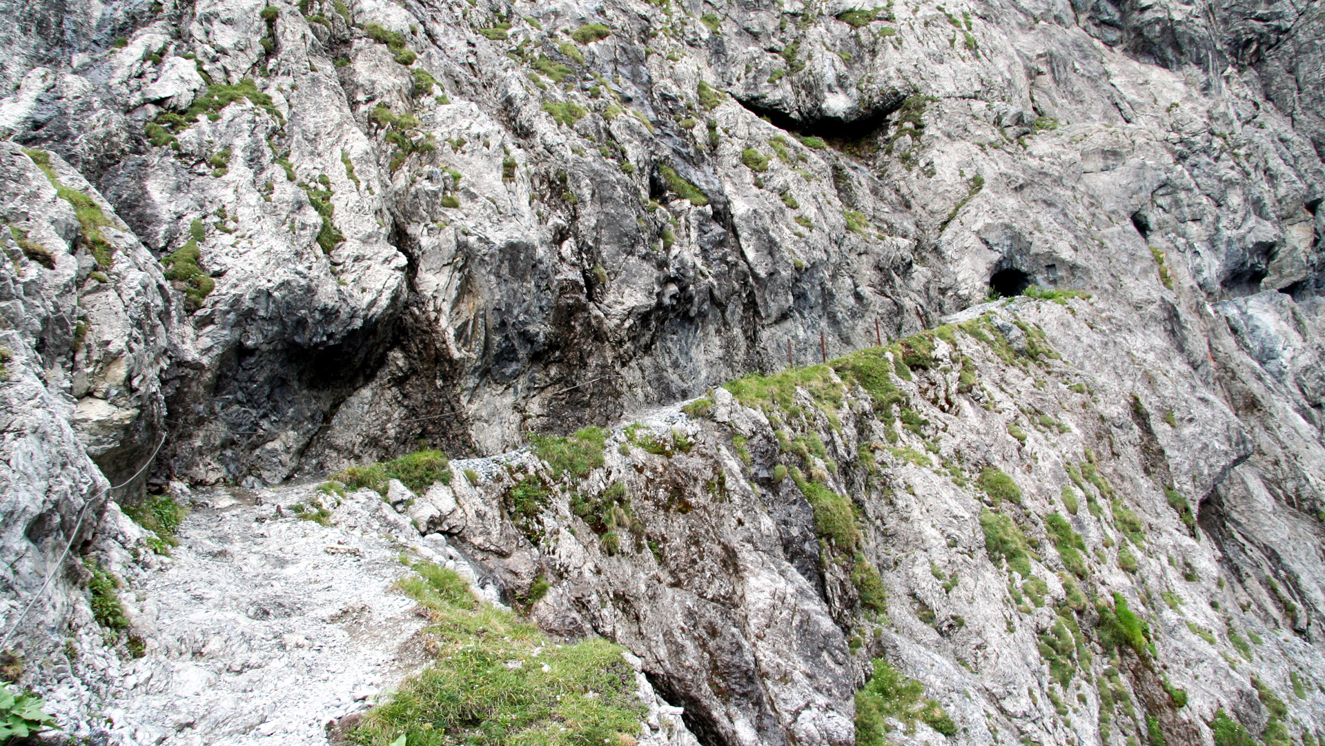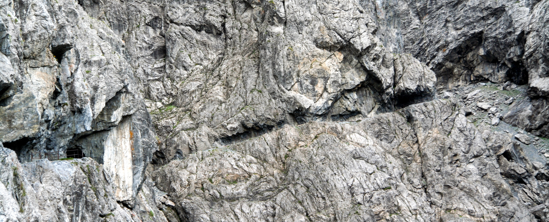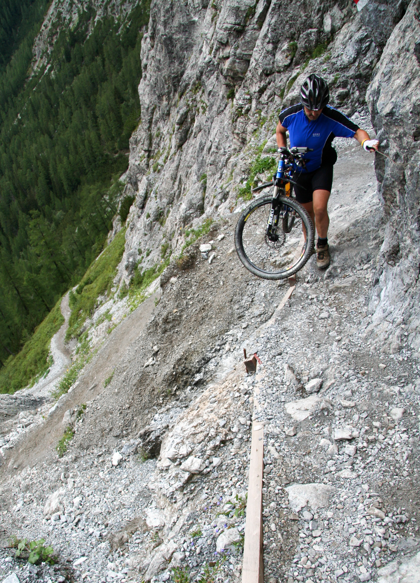 Start auf knackigem Schotterweg bis zur Alpe Uina Dadaint, danach Pfad bis zur Felsschlucht. Dann heißt es schieben, 8,5 Kilometer und 850 Höhenmeter bis zur Galerie der Schlucht. Felsenwege, Tunnels, Höhlen, Abgründe von geschätzten 300 Metern. Der letzte Kilometer nur zu Fuß, steil, schroff, enge Wege – Seil hilft bei den engsten Passagen.