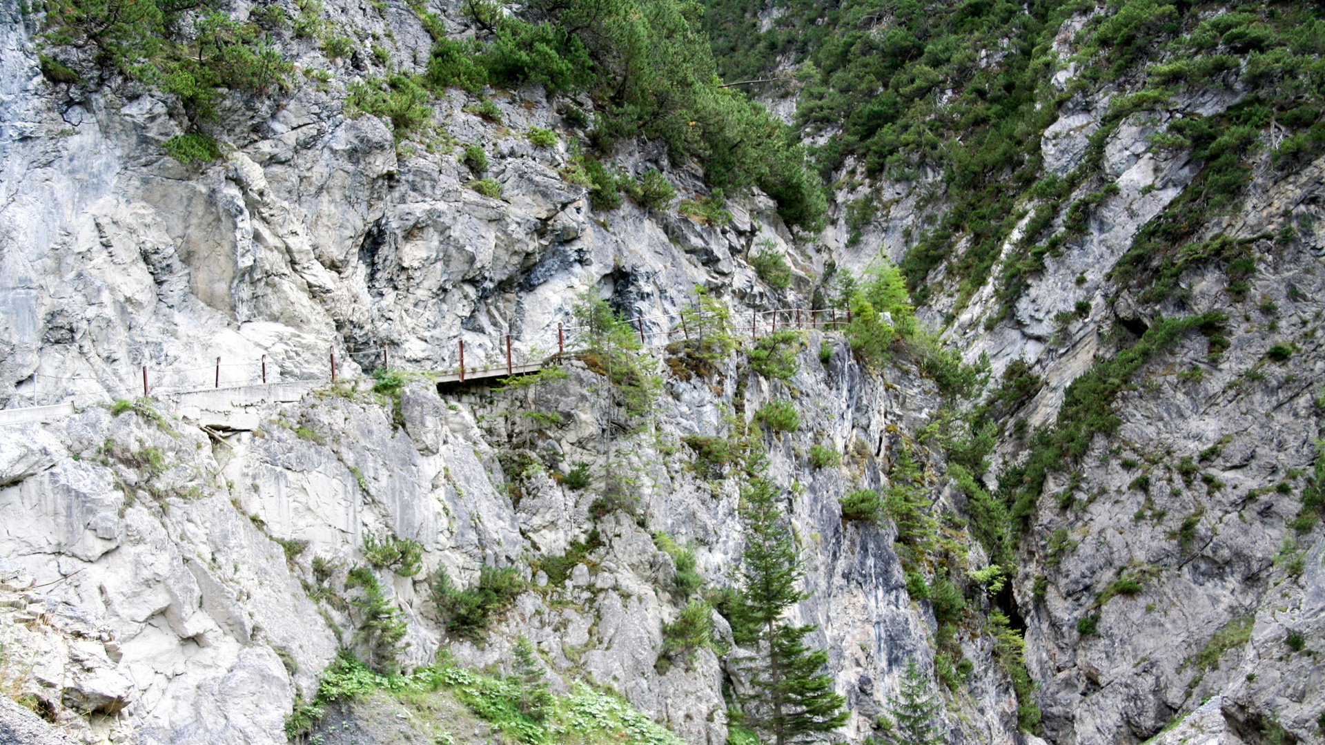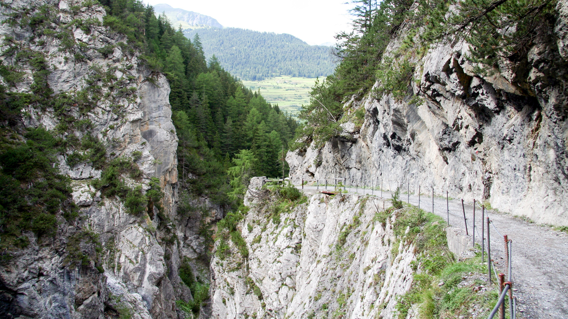 Am tiefsten Punkt der Alp Sursass vereinigen sich die Bäche von Plateau da Rims, Val Cristanas und Pass da Schlingia. Jahrtausende formten hier die Kalkfelsen in eine wilde, romantische Schlucht. Früher unpassierbar, heute ein beeindruckender Felsenweg von 600 Metern Länge, gebaut 1910 von der Sektion Pforzheim des DAV.
