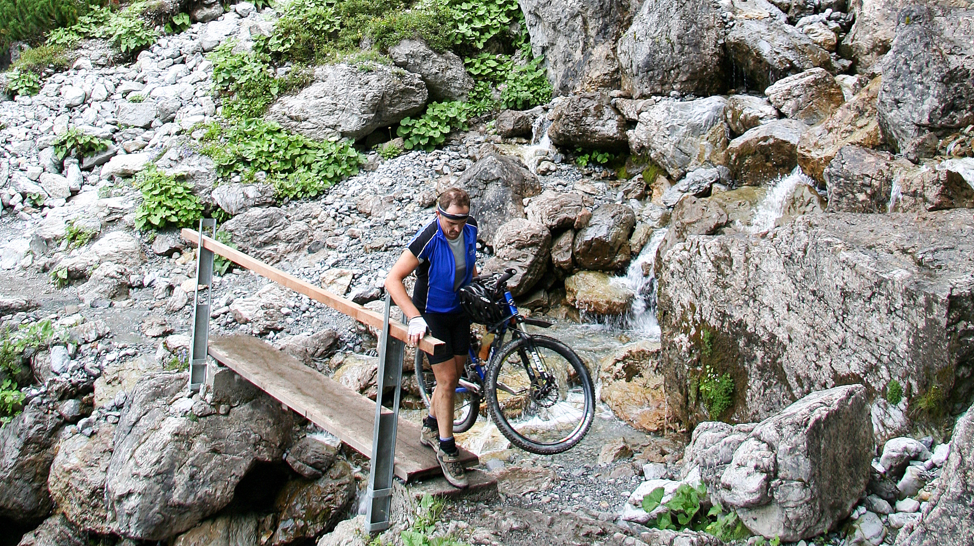 Glücklich erreichen wir Alp Chöglias, eine kleine, geschlossene Hütte. Ein Kilometer weiter bergab, manchmal durch ein Flussbett, und wir stehen vor einer beeindruckenden Brücke aus Stein und Drahtgeflecht, Schweizer Baukunst pur. Wacklig? Vielleicht. Aber stabil genug. Weiter über Forstwege nach Griosch, rasante Wiesenabfahrt, Wurzeltrail nach Vna, vorbei am Kurhaus Val Sinestra, dann auf Naturstraße nach Sur En.