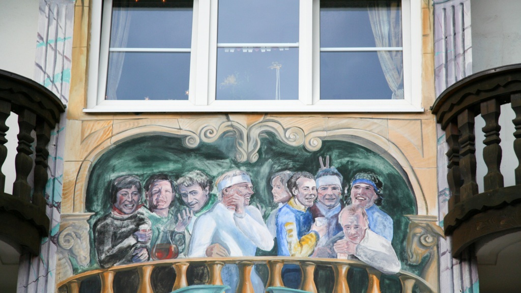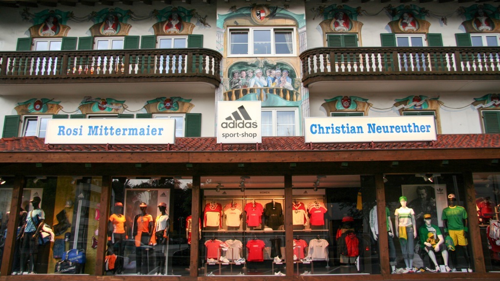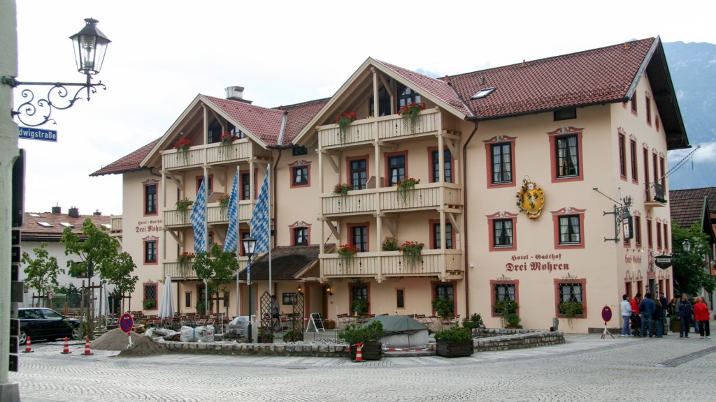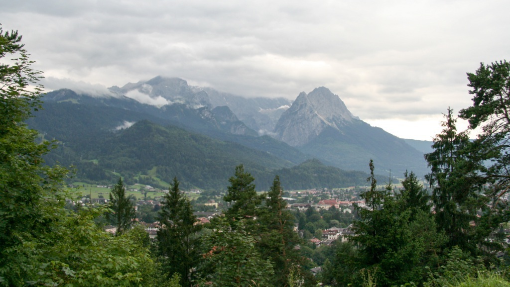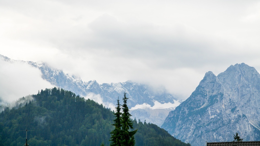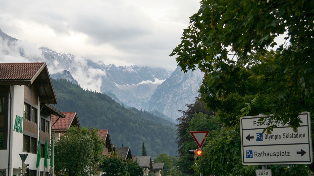 Das Wetter bleibt durchwachsen. Die Bergansätze sind sichtbar, die Gipfel aber tief in Wolken gehüllt. Wir beschließen, das Beste daraus zu machen: ein Spaziergang durch den Ort, ein Abstecher zur berühmten Skisprungschanze, ein Blick aufs bunt bemalte Sporthaus der Skilegenden Mittermeier-Neureuther. Nur die Zugspitze bleibt uns verborgen – der Nebel hat sie verschluckt.