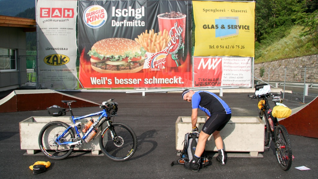Kaum auf der B316, da zeigt Jürgen ein Zeichen: sein Tretlager ist locker! Kein Abzieher dabei – ohne den kriegen wir die Heilbronner Hütte unmöglich. Plan B: Landkarte studieren. Aha, die Eisenbahnstrecke Landeck–St. Anton trifft auf den nächsten Ort, also ab nach Strengen. Steil 10% bergauf – endlich oben angekommen, erfahren wir: hier hält kein Zug. Toll, anscheinend mag uns heute niemand.