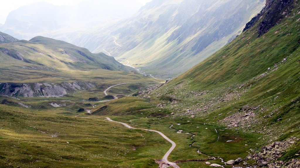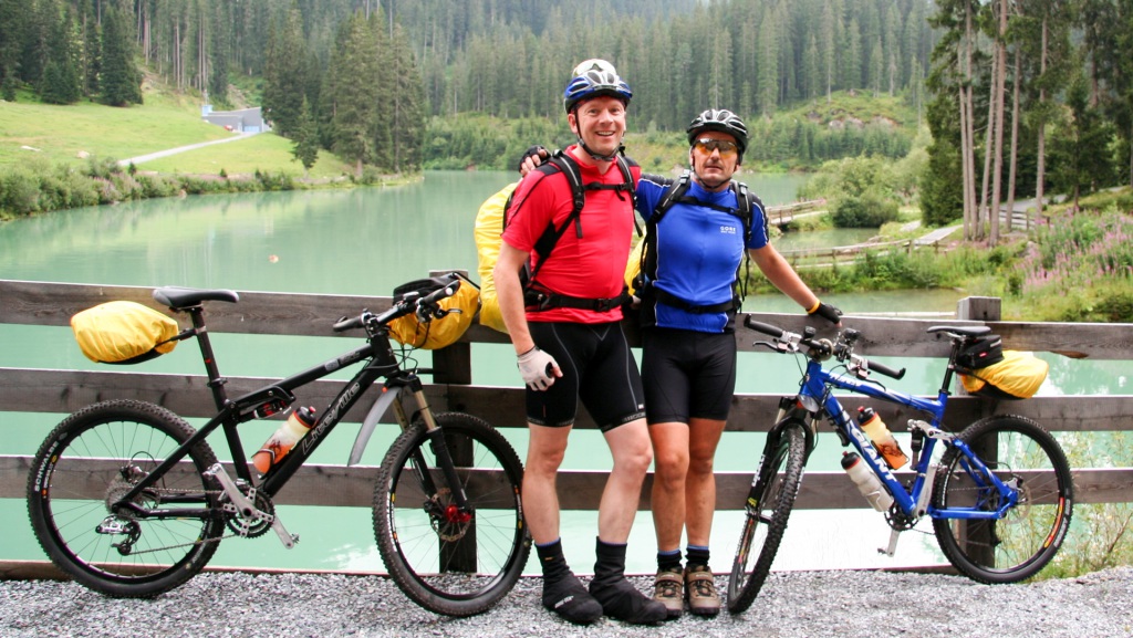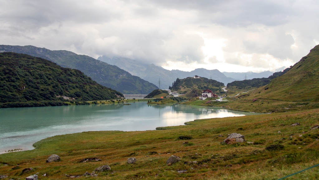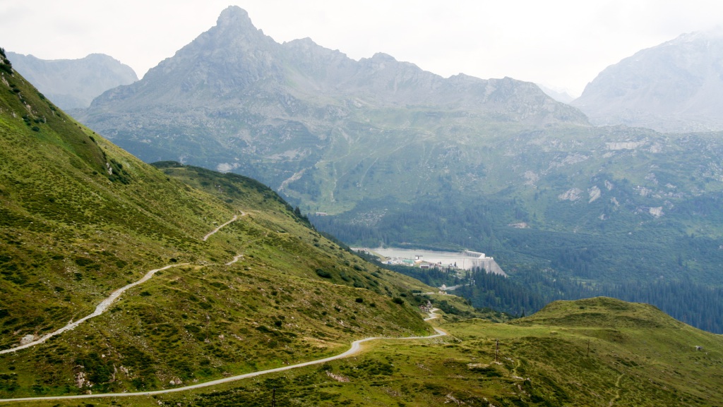 Vom Sonnendeck aus sehen wir den weiteren Weg: Schotterkurven hinab ins Tal. Bis Ischgl nur noch bergab – geil! Serpentinen, top fahrbar, lassen die Mühen der Auffahrt vergessen. Bremsen glühen, Spaß pur. Kurze, steile Passage bergauf, dann erreichen wir den Kops-Stausee.