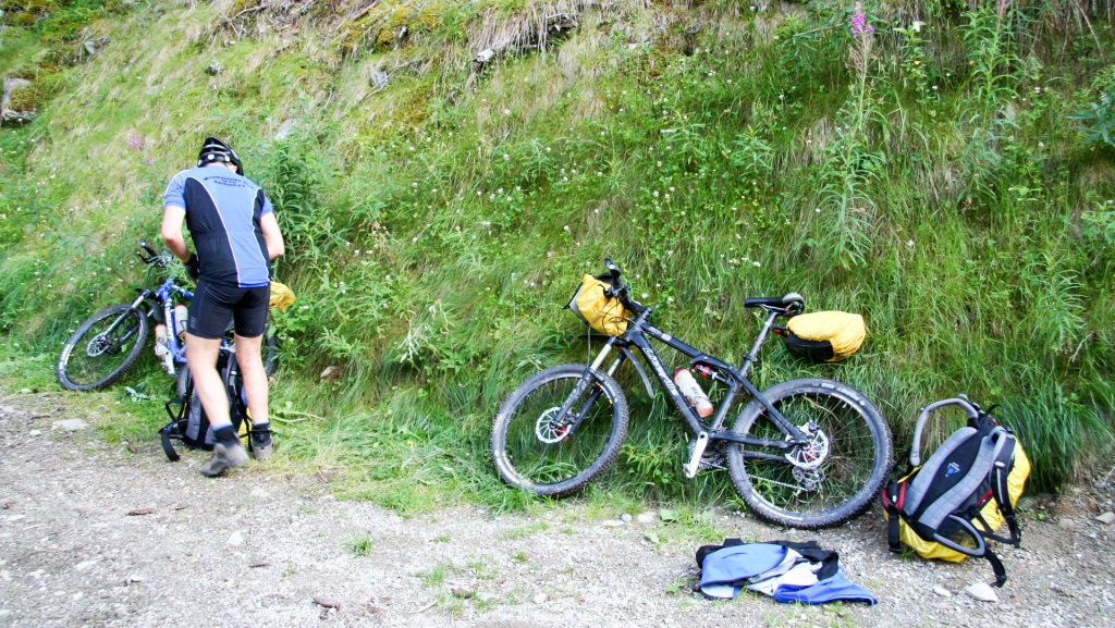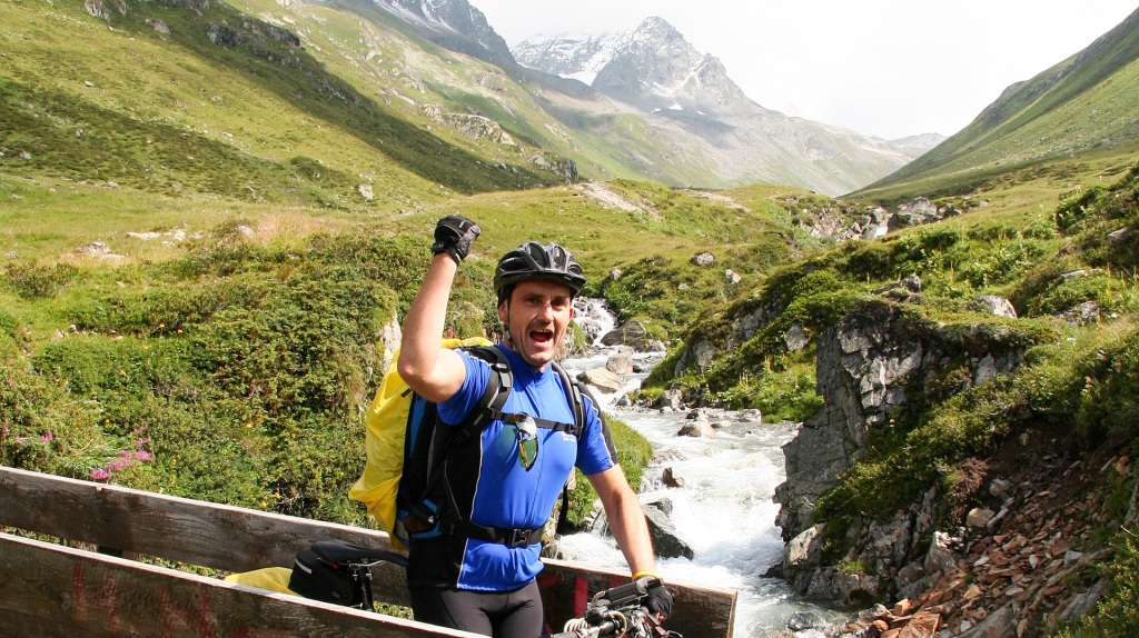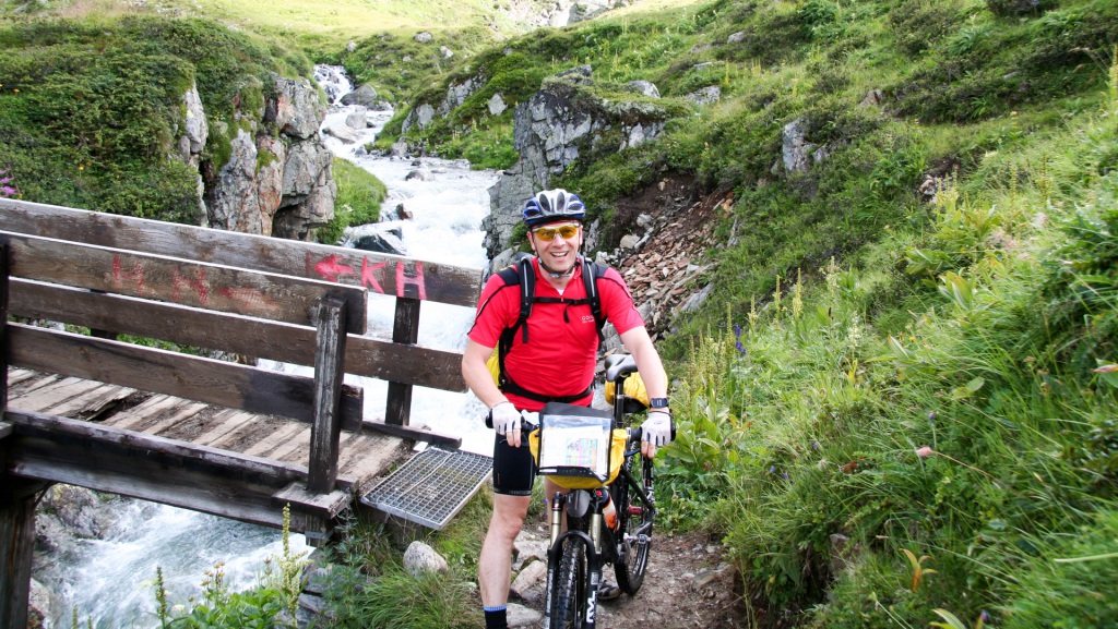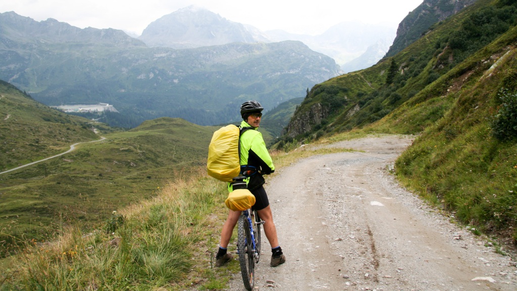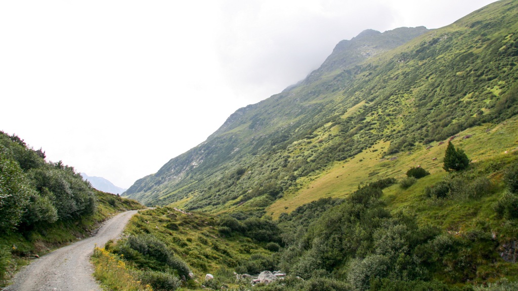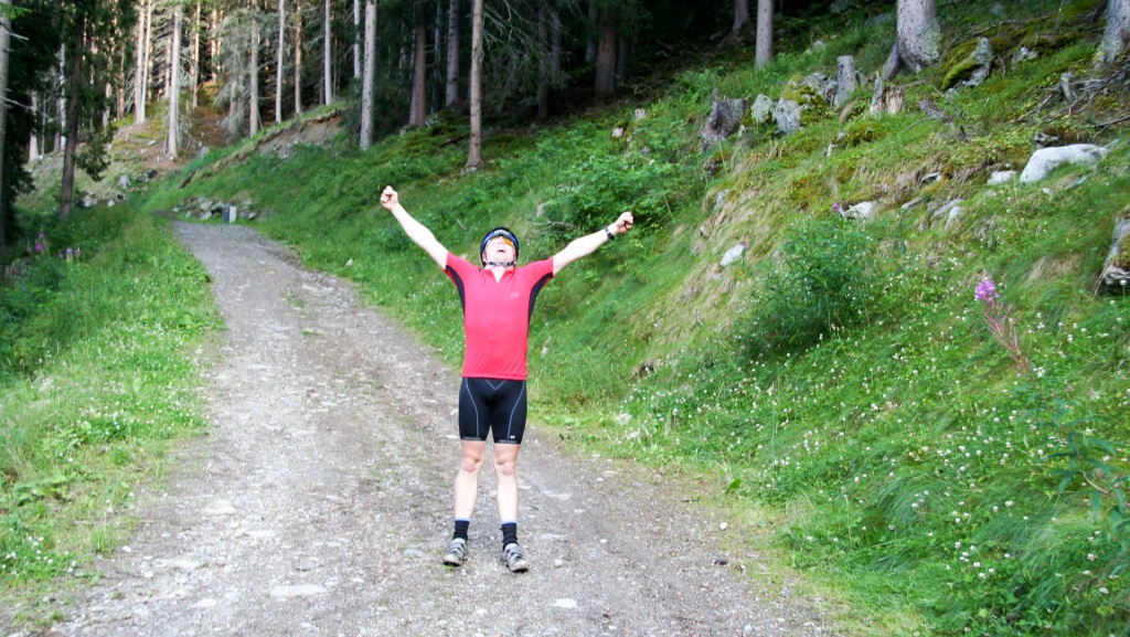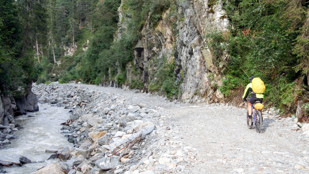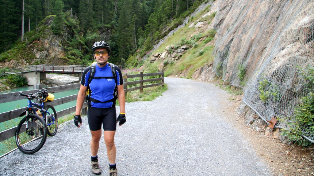 Weiter entlang der Trisanna, durch Galtür, grober Schotterweg Richtung Ischgl, anschließend oberhalb des Waldrandes. Kräfte schwinden, 90 Kilometer und 2.250 Höhenmeter auf dem Tacho.