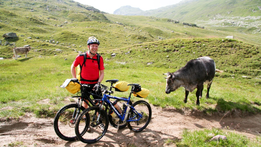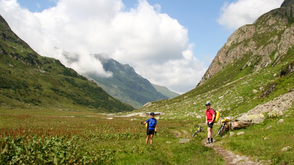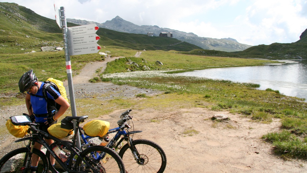 Kurz vor der Hütte ein fahrbares Plateau von 500 Metern, dann der erste große Gipfel unseres Alpencross: 2.320 Meter. Stolz am Passschild, obligatorisches Foto. Windig, kühl, aber wir gönnen uns einen heißen Kakao mit Apfelstrudel auf der Terrasse – verdient!