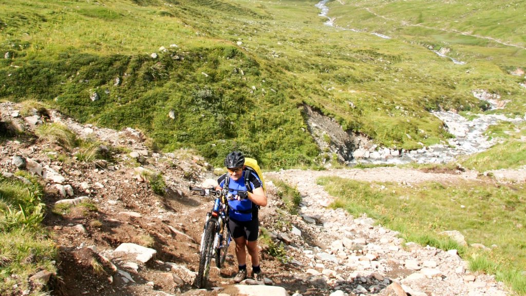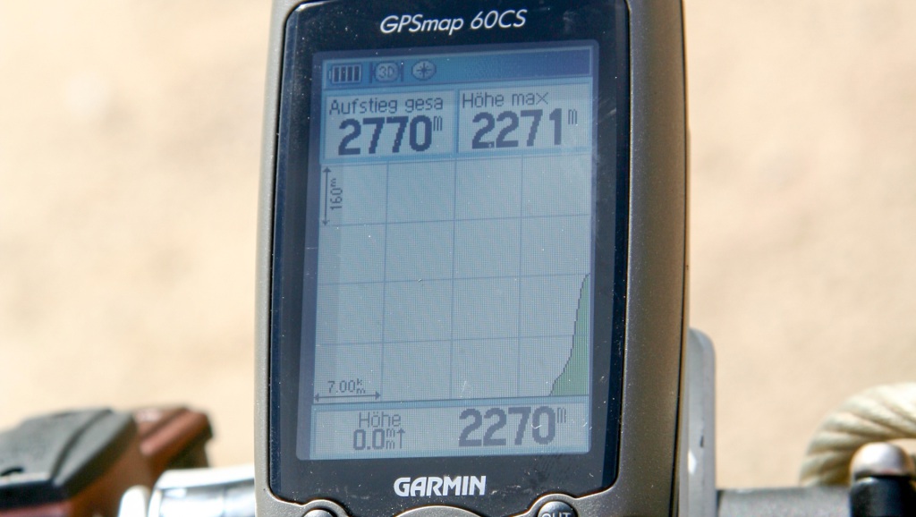 Jetzt wird es ernst: Sechs Kilometer bis auf 2.060 Meter, teils schieben, teils tragen – maximale Steigung laut Bikecomputer 33%! Meter für Meter, langsam, tief atmend, der Rucksack drückt mit sieben Kilogramm. Hier oben ist die Luft dünner, der Körper spürt jede Anstrengung. Kleine Felsbrocken zwingen zum Hochheben, natürliche Steintreppen zum Drücken. Pausen zwischendurch, um die grandiose Aussicht zu genießen, Fotos zu machen – jede Erinnerung zählt.