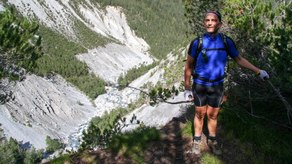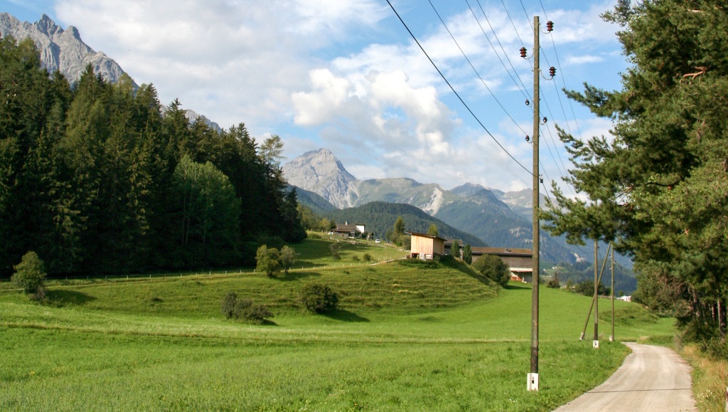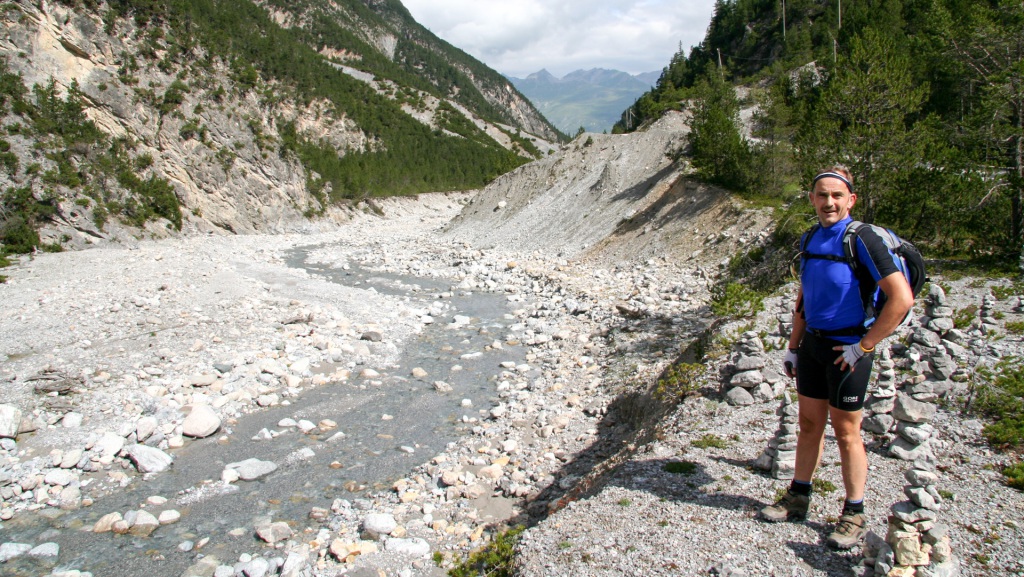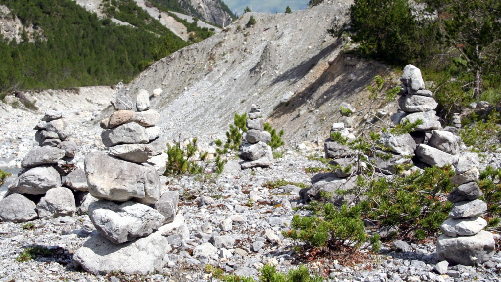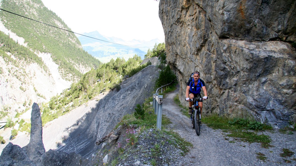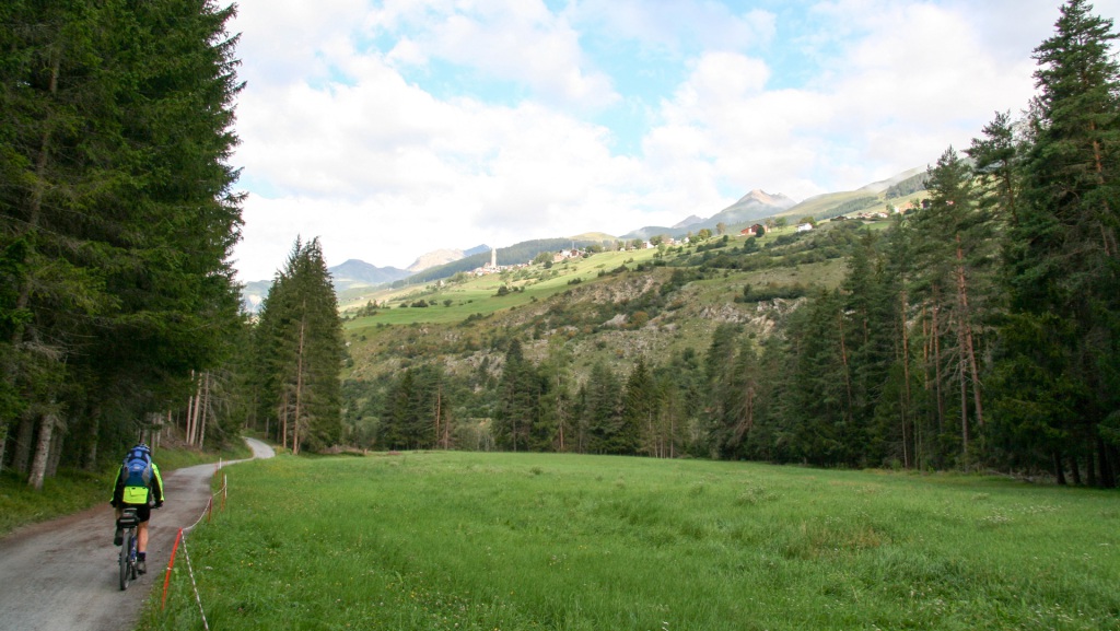 Am Radweg folgen wir einem kleinen Fluss bis nach Scuol, genießen die Sonnenstrahlen, bevor uns eine Straße nach den Sportplätzen stetig aufwärts Richtung S-charl leitet. Der Asphalt wechselt bald in eine feine Schotternaturstraße – ein Genuss zu fahren, die Höhenmeter merkt man kaum. Kurz vor S-charl schweift unser Blick auf ein Plateau mit Steinskulpturen, wie man sie aus Reportagen über das Himalaya-Gebirge kennt.