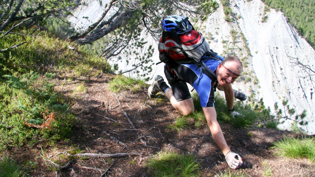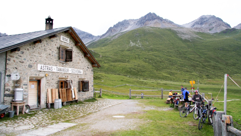 Es steigt stetig, der Duft von frisch Gegrilltem steigt uns in die Nase – Hunger kommt auf. Wir peilen die Hütte Alp Astras an, doch als wir oben ankommen, ist sie geschlossen. Mist! Auch ein paar Wanderer haben das gleiche Problem. Nun gut, Riegel raus, Füße hoch auf die Bank, die Sonne genießen. Ein älteres Paar gesellt sich dazu, etwas irritiert über unsere fahrbaren Bikes auf den engen Pfaden, aber sie wünschen uns viel Spaß. Nach kurzer Pause packen wir zusammen und schwingen uns wieder in die Pedale.
