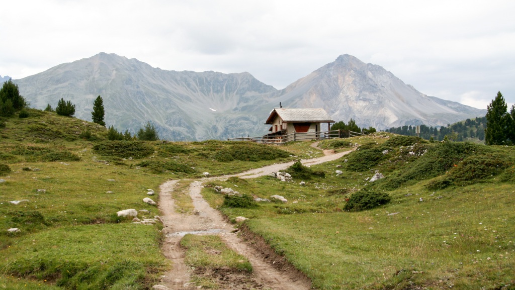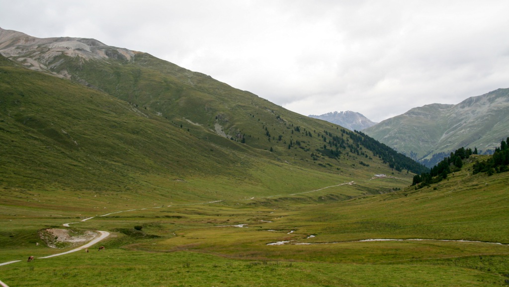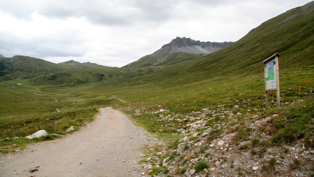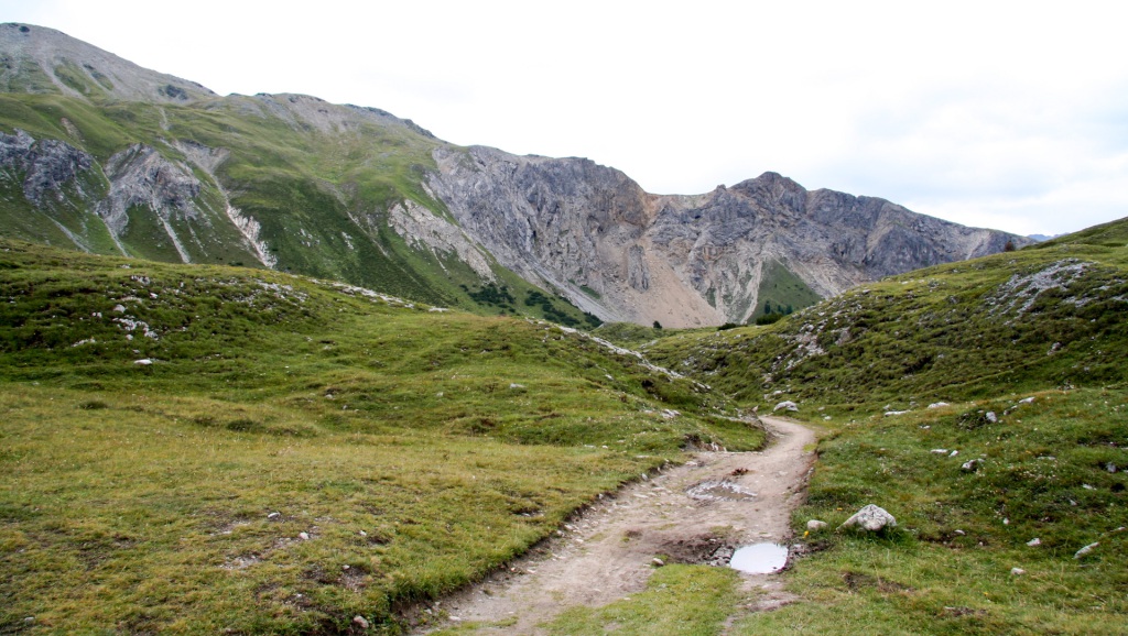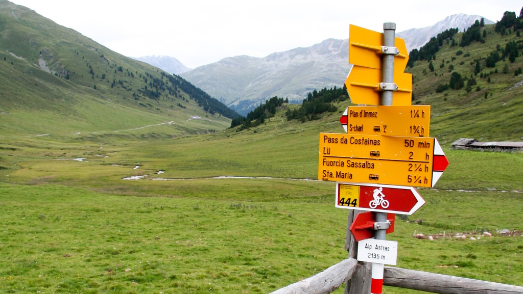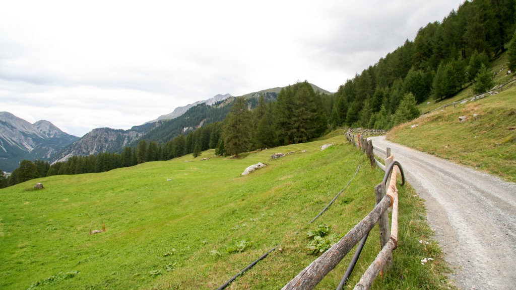 Das kleine Dorf S-charl liegt idyllisch auf 1.800 Metern. Doch der Schein trügt: ein riesiger Parkplatz, voll mit Wanderern und Touristen. Jetzt wissen wir, warum die Busse und Autos bis hier hochfahren. Wir gönnen uns eine kurze Pause am Dorfbrunnen, füllen die Flaschen und machen uns weiter auf Richtung Pass da Costainas.