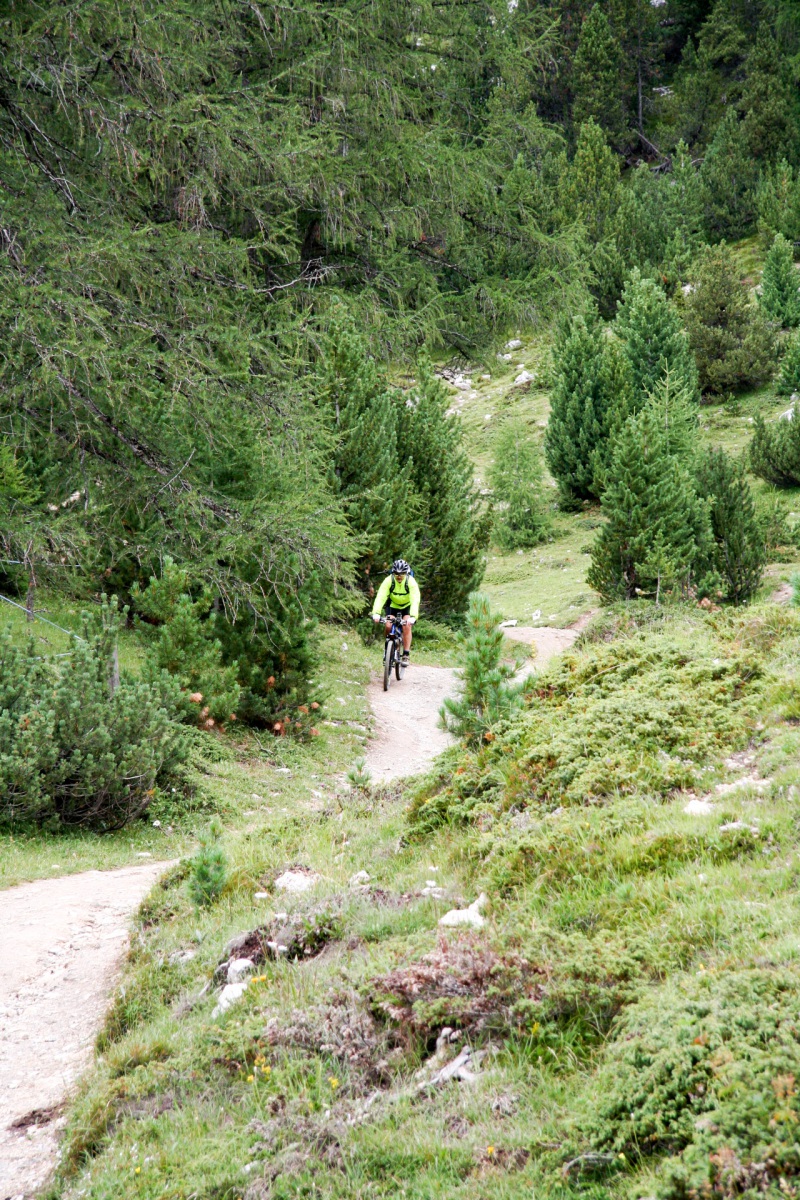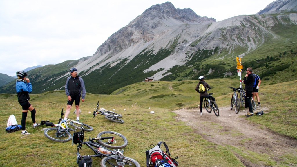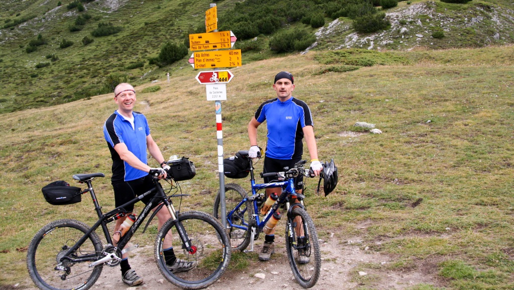 Jetzt beginnt der Singletrail: schmal, immer fahrbar, bis zum Pass da Costainas auf 2.250 Metern – einer der wenigen vollständig fahrbaren Alpenpässe. Oben angekommen, überkommt uns dieses erhabene Gefühl, das man nur kennt, wenn man einen Gipfel erklommen hat. Fotos müssen natürlich sein. Die anschließende Schotterabfahrt ist anspruchsvoll, aber größtenteils fahrbar und macht höllisch Spaß!