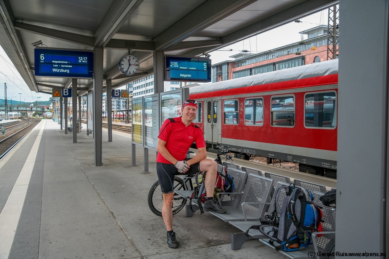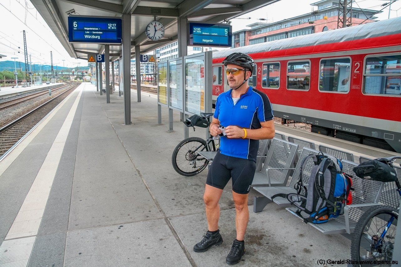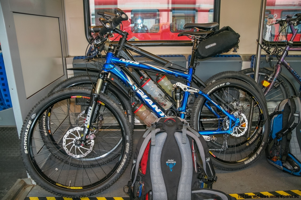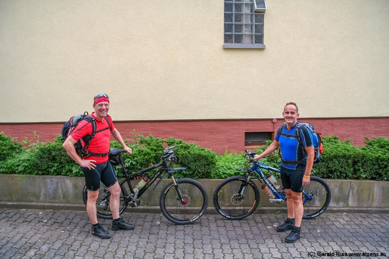 Um 9:00 Uhr klingelt es an der Haustüre, dieses Jahr erwarten wir Familie Flach zum Frühstück. Meine Frau hat schon fast alles Vorbereitet: Verschiedene Antipasti zur Einstimmung auf Italien. Wir lassen es uns schmecken, erzählen über dies und das, bis es endlich los gehen kann. Dieses Mal fahren wir nicht mit dem Auto zum Startpunkt unserer Tour, nein, wir fahren mit dem Zug. Gegen 11:00 Uhr machen wir uns fertig, holen uns noch einen Abschiedskuss bei unseren Frauen ab, machen ein obligatorisches Foto, schwingen uns auf die Bikes und fahren nach Aschaffenburg zum Bahnhof: Das Alpencross Abenteuer 2007 kann starten!