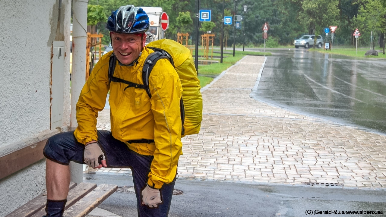 Der obligatorische Blick aus dem Fenster am morgen nach dem Aufstehen lässt diesen Satz nur zu wahr werden. Wir beginnen diesen Alpencross genau so wie im letzten Jahr: mit Regen! Aber zunächst stärkt uns ein anständiges Frühstück, dann die Regenklamotten an und ein letztes Bild vor Tourenbeginn.