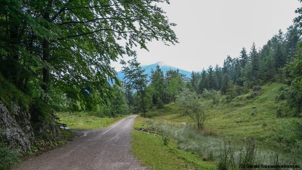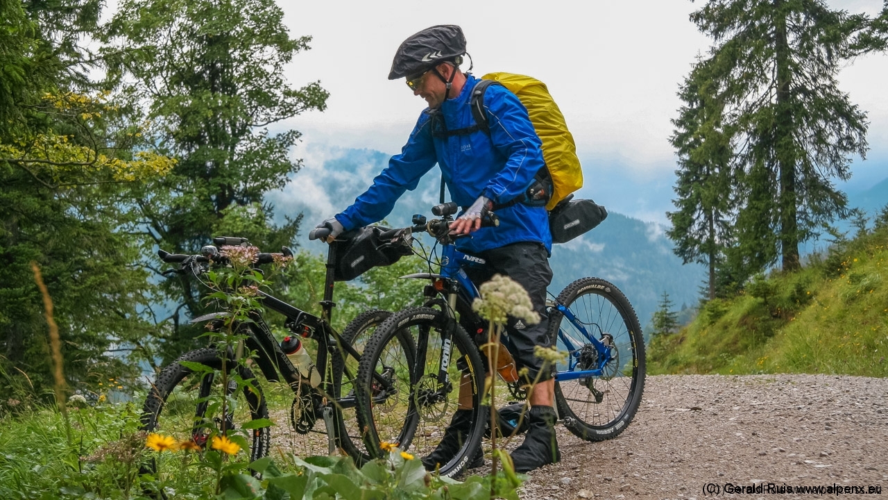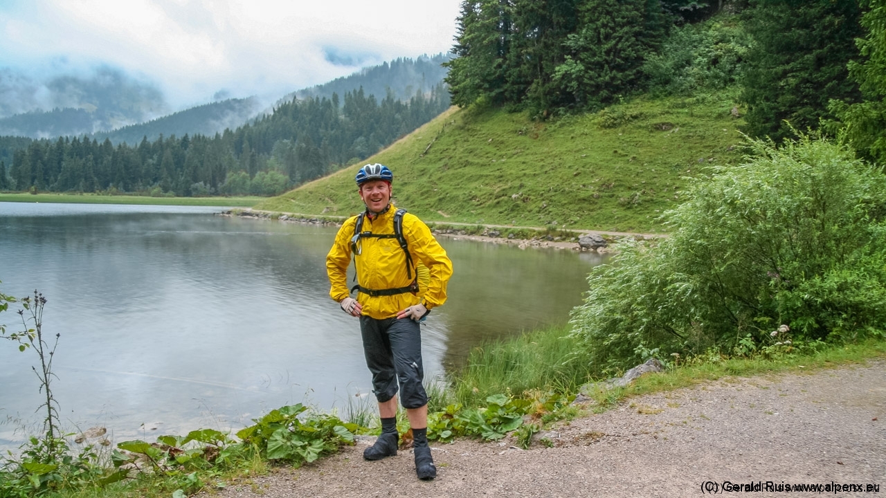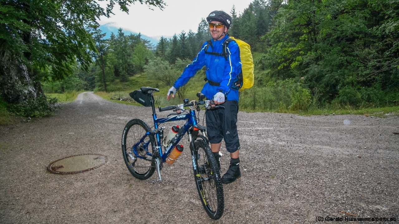 Man kommt sich wie im schlechten Film vor … irgend wie hatten wir das doch alles schon. Aber wer uns näher kennt der weiß, das uns so ein Regen auf keinen Fall von unserem Vorhaben abhalten würde. Also rein in die Pedale und los geht’s. Zunächst am Schliersee entlang, dann verlassen wir diesen auf einer kleinen Teerstrasse, doch der Himmel scheint sich über uns auszuweinen. Wolkenbruchartige Wasserfälle – da hilft nur Unterstellen und auf Besserung warten.