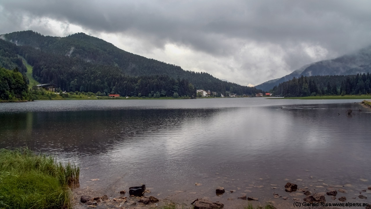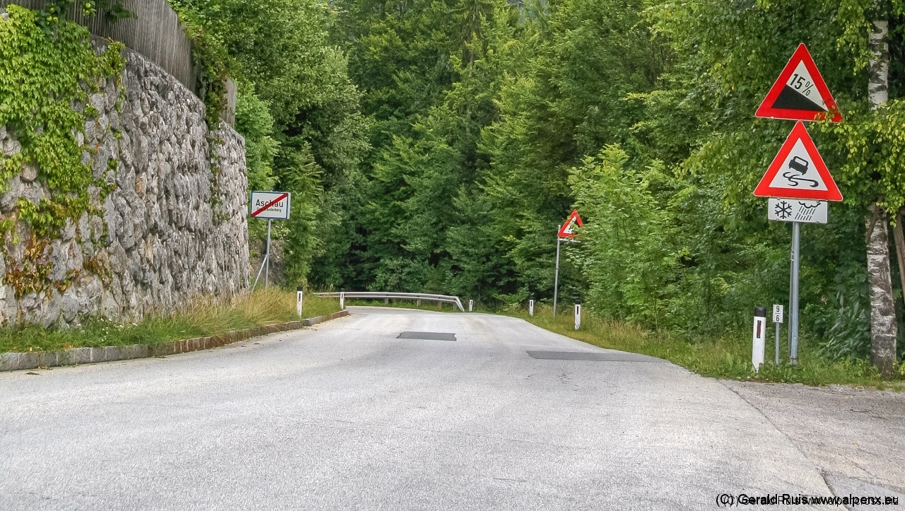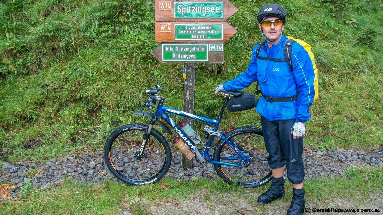Nach ca. 15 Minuten war der Spuck etwas milder geworden, also ein erneuter Anlauf. Die kleine Teerstrasse wechselte ihren Belag in groben Schotter, der aber gut zu fahren ist. Ortsausgang Neuhaus erstreckt sich die erste Rampe des Tages die uns mahnend zeigt: Teilt eure Kraft ein. Auf den nächsten 3 Km folgt eine durchschnittliche Steigung von 10,7 %. Die letzten hundert Meter ging auf Asphalt weiter, bis auf der Kuppe schon ein Schild Spitzingsee zu sehen war. Ein kleiner Pfad rechts ab und wir gelangen direkt zum See. Ein Gutes hat das schlechte Wetter ja – wir treffen keine Menschen Seele hier.
