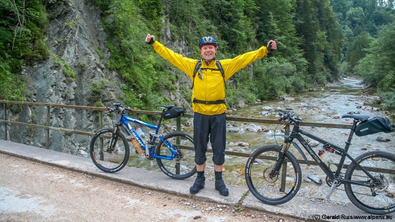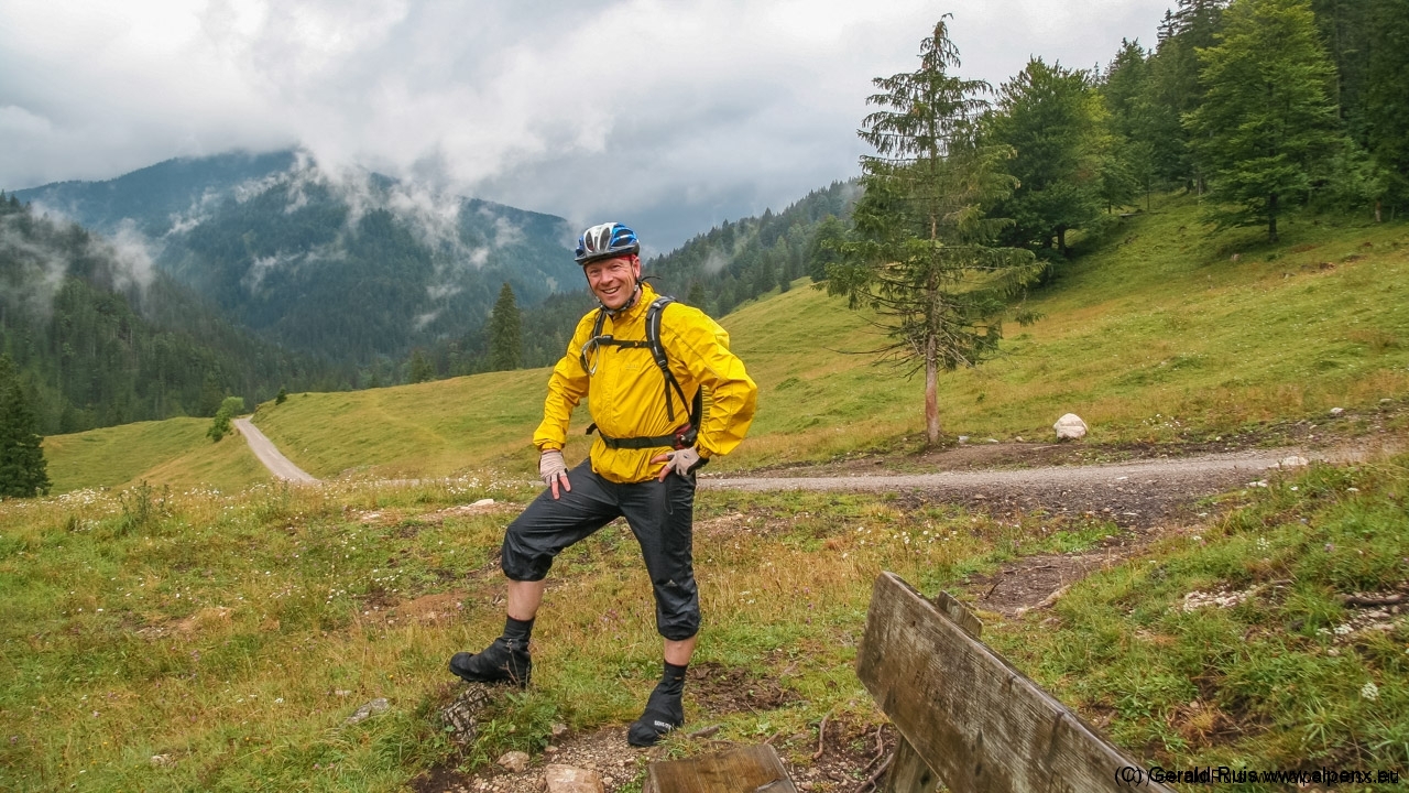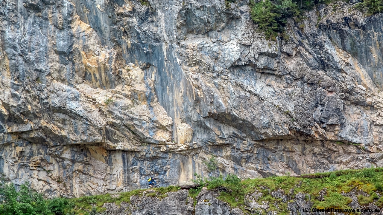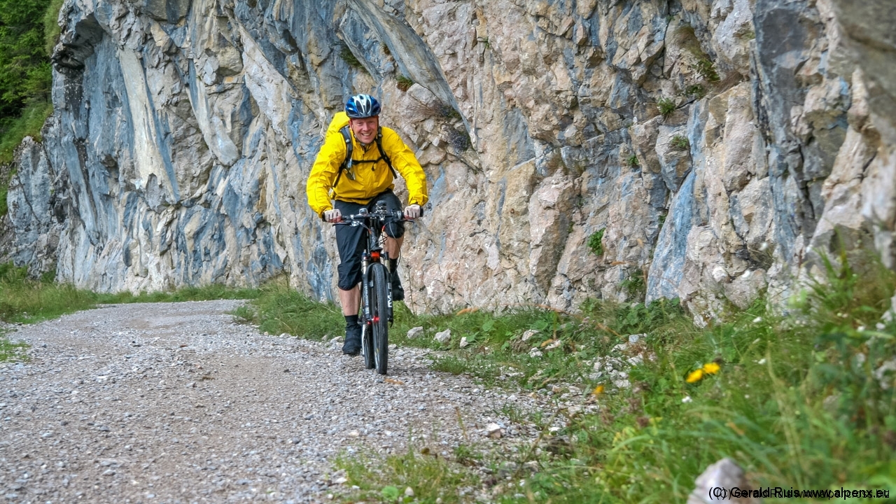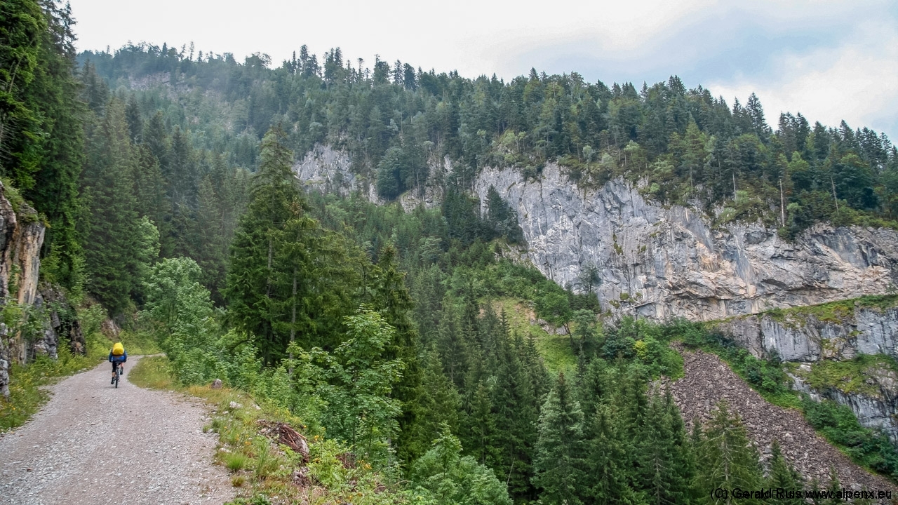 Der Regen wurde immer weniger als wir mit Tempo eine keine Teerstrasse Richtung Vallep hinunter rauschten. Es war frisch aber erträglich – was aber wirklich klasse (und neu auf dieser Tour) war sind unsere kurzen Regenhosen! Es erfolgt erneut eine Schotterauffahrt, die in kurzem Trail und dann wieder auf Schotter weiter geht. Ein toller Weg führt uns entlang einer Schlucht und Felsenwand. Diese lässt uns auf den ersten Blick wirklich sehr klein wirken. Erste Sonnenstrahlen ließen sich blicken und wir sollten doch noch einen wirklich schönen Tag erleben. Traumhaft schöne Wege – immer weiter – auf der linken Seite die Felsenwand – auf der Rechten der tobenden Fluß, auch die Brandenberger Ache genannt.