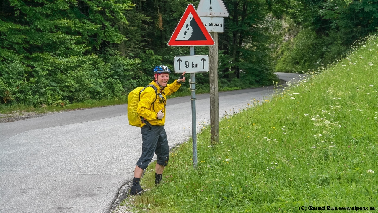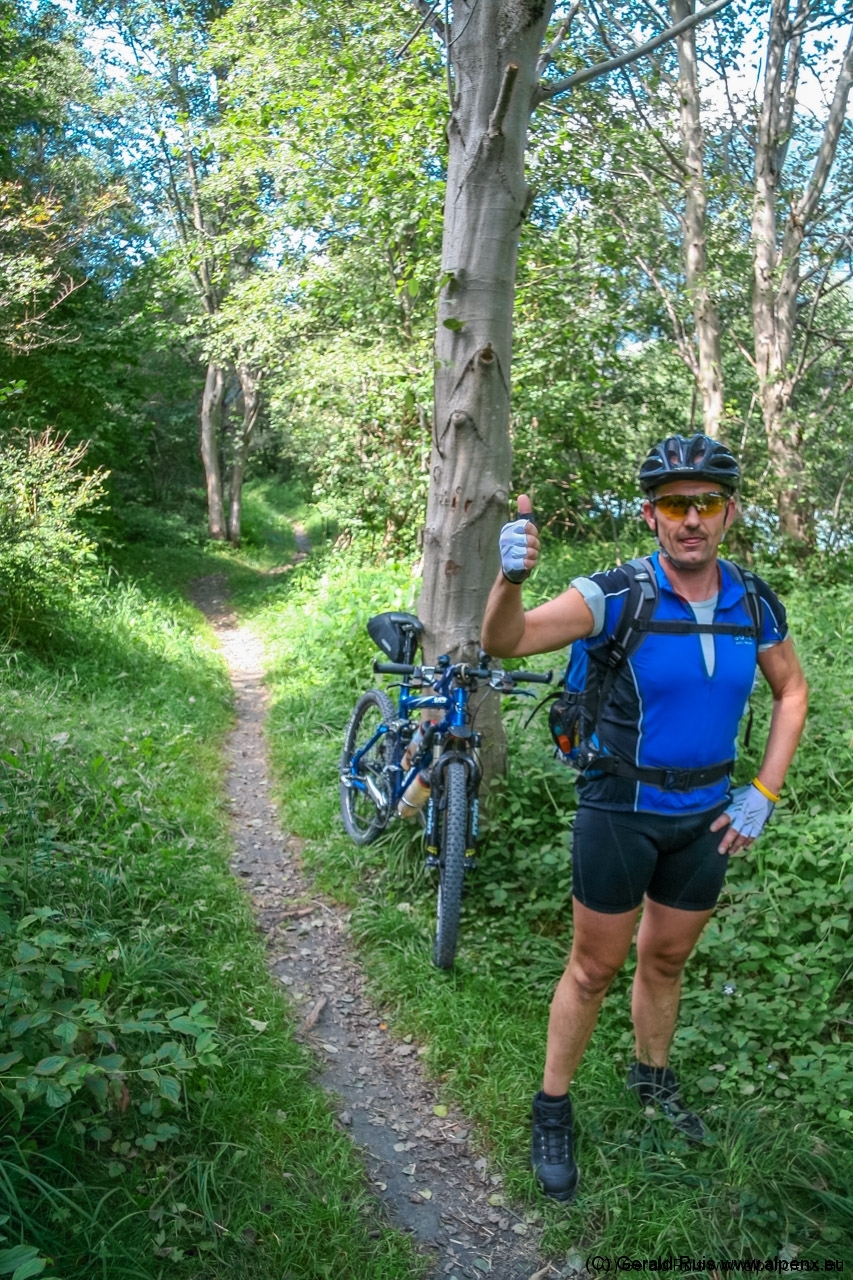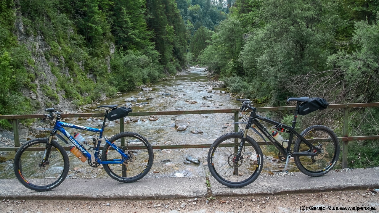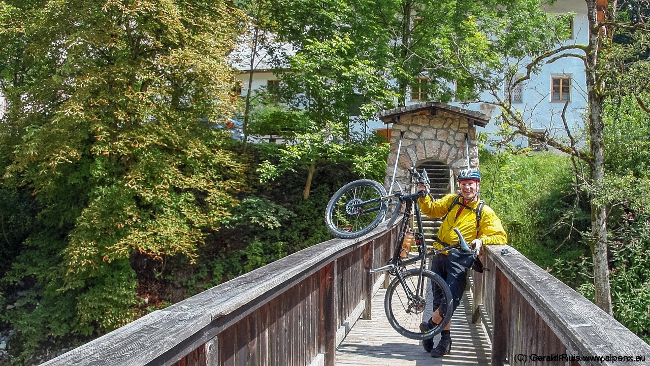 Der Regen wurde immer weniger als wir mit Tempo eine keine Teerstrasse Richtung Vallep hinunter rauschten. Es war frisch aber erträglich – was aber wirklich klasse (und neu auf dieser Tour) war sind unsere kurzen Regenhosen! Es erfolgt erneut eine Schotterauffahrt, die in kurzem Trail und dann wieder auf Schotter weiter geht. Ein toller Weg führt uns entlang einer Schlucht und Felsenwand. Diese lässt uns auf den ersten Blick wirklich sehr klein wirken. Erste Sonnenstrahlen ließen sich blicken und wir sollten doch noch einen wirklich schönen Tag erleben. Traumhaft schöne Wege – immer weiter – auf der linken Seite die Felsenwand – auf der Rechten der tobenden Fluß, auch die Brandenberger Ache genannt.