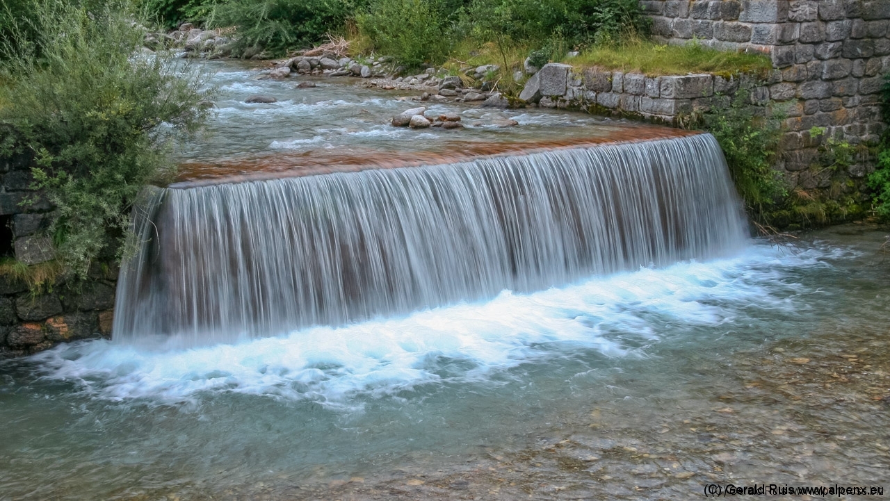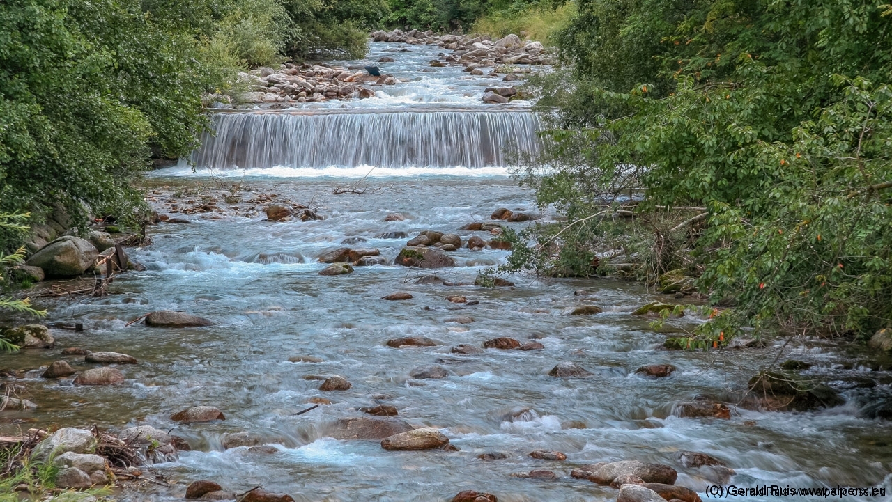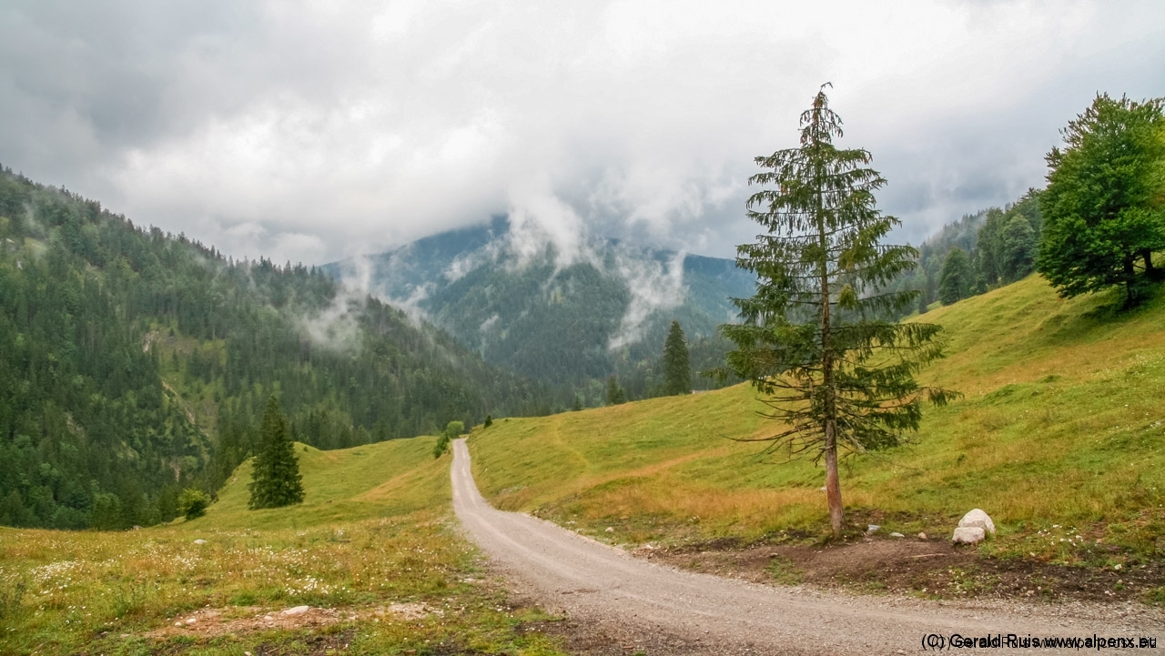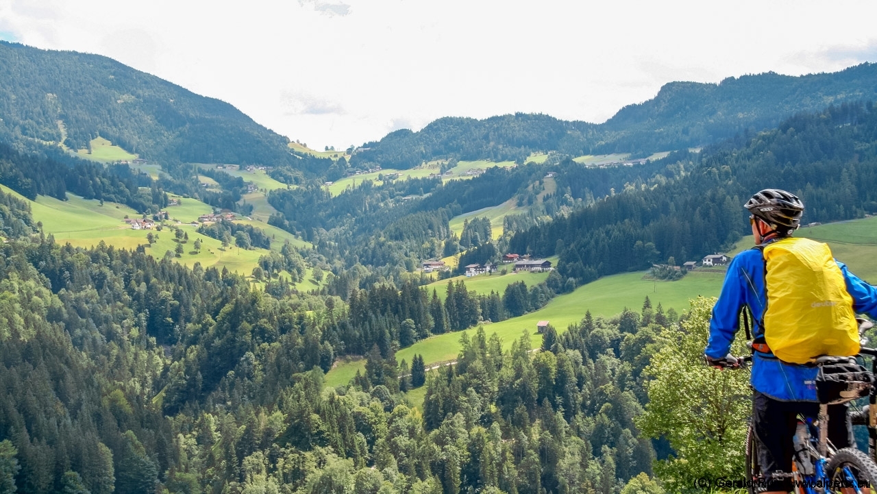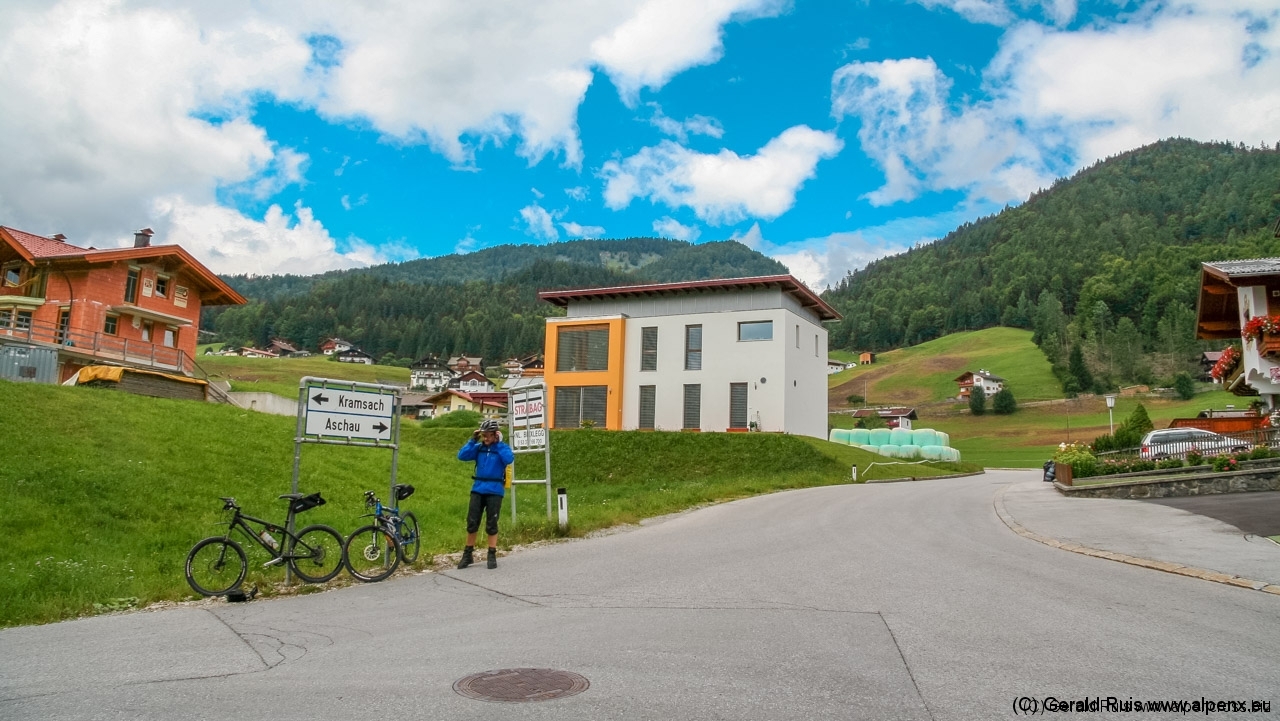 Der Regen wurde immer weniger als wir mit Tempo eine keine Teerstrasse Richtung Vallep hinunter rauschten. Es war frisch aber erträglich – was aber wirklich klasse (und neu auf dieser Tour) war sind unsere kurzen Regenhosen! Es erfolgt erneut eine Schotterauffahrt, die in kurzem Trail und dann wieder auf Schotter weiter geht. Ein toller Weg führt uns entlang einer Schlucht und Felsenwand. Diese lässt uns auf den ersten Blick wirklich sehr klein wirken. Erste Sonnenstrahlen ließen sich blicken und wir sollten doch noch einen wirklich schönen Tag erleben. Traumhaft schöne Wege – immer weiter – auf der linken Seite die Felsenwand – auf der Rechten der tobenden Fluß, auch die Brandenberger Ache genannt.
