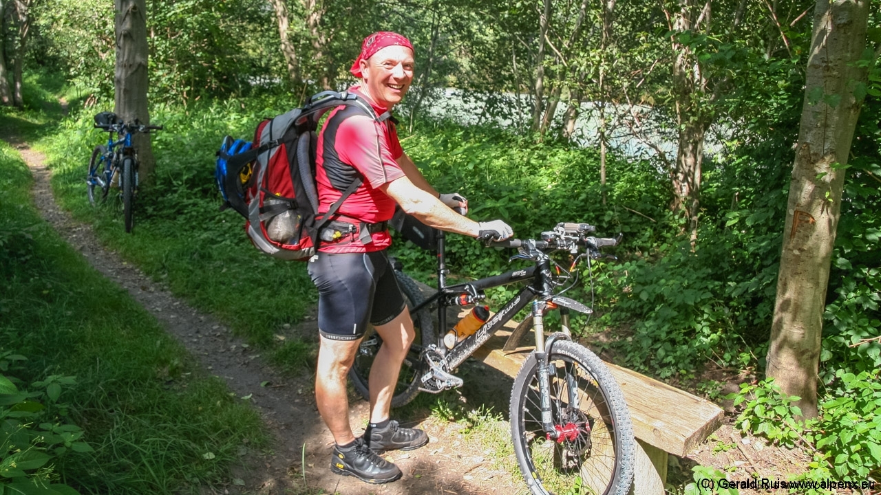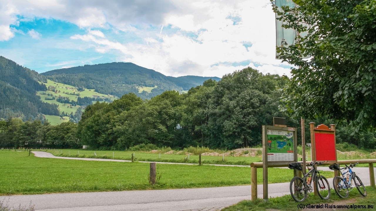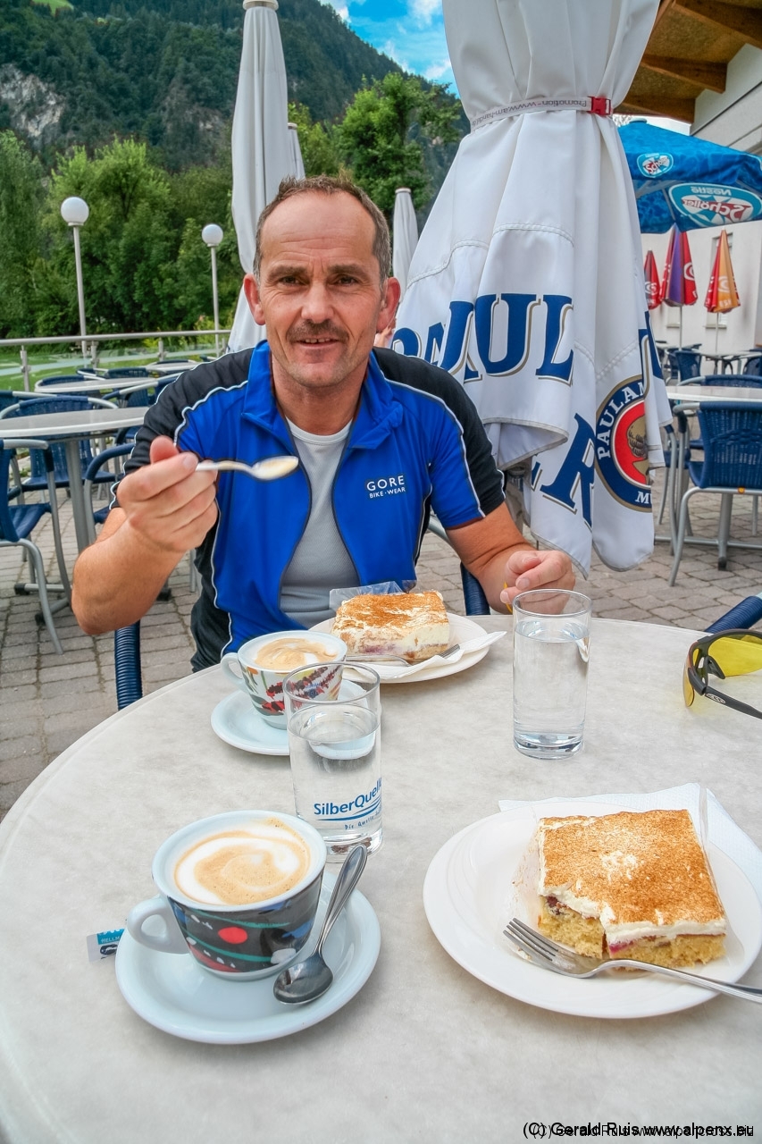 Wer mit offen Augen fährt, hat mehr vom Biken. Getreu nach diesem Motto erkenne ich einen kleinen Trail, der immer direkt an der Ziller entlang läuft und wieder auf dem Radweg zurück kommt. Wir nehmen diese Gelegenheit natürlich war und folgend immer wieder diesem Trail, der teils dann auf einem Wiesenpfad, teils sich am der Ziller entlang schlängelt und das mehrere Kilometer lang – klasse! Zwischendurch fahren wir an einem kleinen Badesee natürlich nicht vorbei, denn das Wetter lädt zum Cappuccino, Kuchen und relaxen ein. Wir genießen das tolle Panorama und erfreuen uns der Sonnenstrahlen.