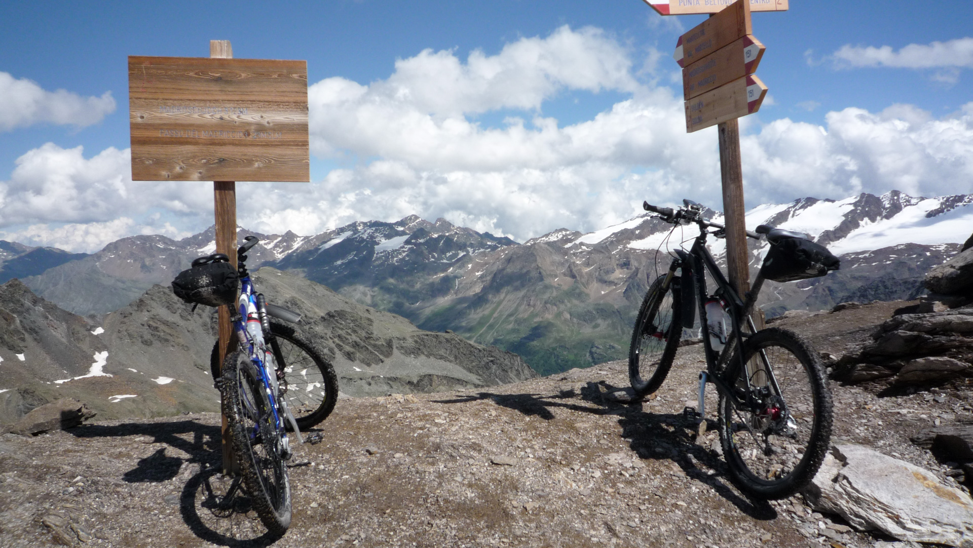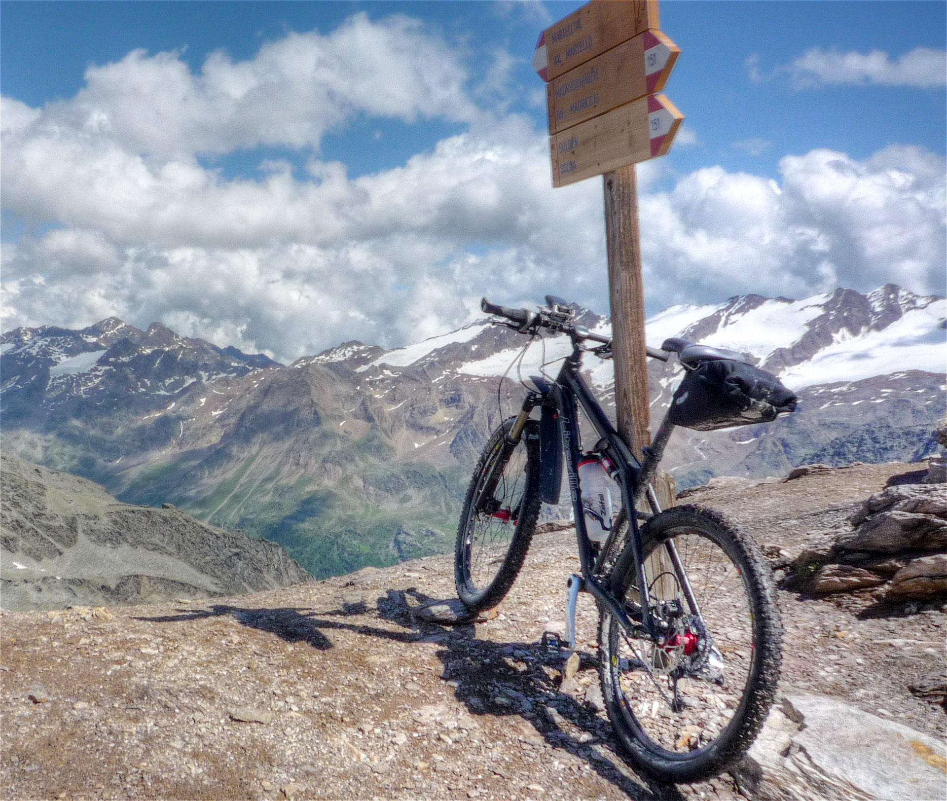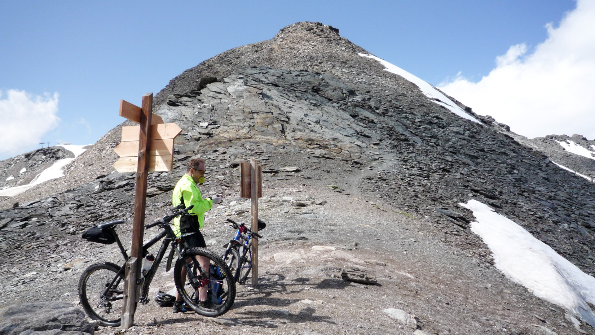 Wir nutzen ein Schneefeld aus, stecken unsere Räder hinein und befestigen die Reifen mit verharschtem Schnee. So, da stehen sie nebeneinander, wie von Geisterhand gehalten. Eine tolle Möglichkeit Fotos zu schießen. Die Bikes auf dem Schneefeld – im Hintergrund der Ortler. Wir haben Glück, den die Gipfel sind für fünf Minuten völlig wolkenfrei – Spitze! Wir kommen an der Bergstation eines Skiliftes vorbei, eine kleine steilere Rampe steht vor uns. In der Ferne erkennen wir zwei Wanderer, die im Abstand von 200 Meter dem Gipfel entgegen laufen. Uns wird bewusst, dass wir die ganze Zeit auf einer Skiabfahrt hoch schieben. Schön sind die Geröllfelder nicht, die Erosion hat hier auch schon dazu beigetragen, dass der komplette Hang sehr zerklüftet und vegetationslos aussieht. Im Winter, wenn hier meterhoch der Schnee liegt, sieht man von den verschandelten Skiabhänge nichts. Aber die Höhe und der Rundumblick auf die hohen Gipfel der Berge lassen es dennoch zu einem einprägendem Erlebnis werden.