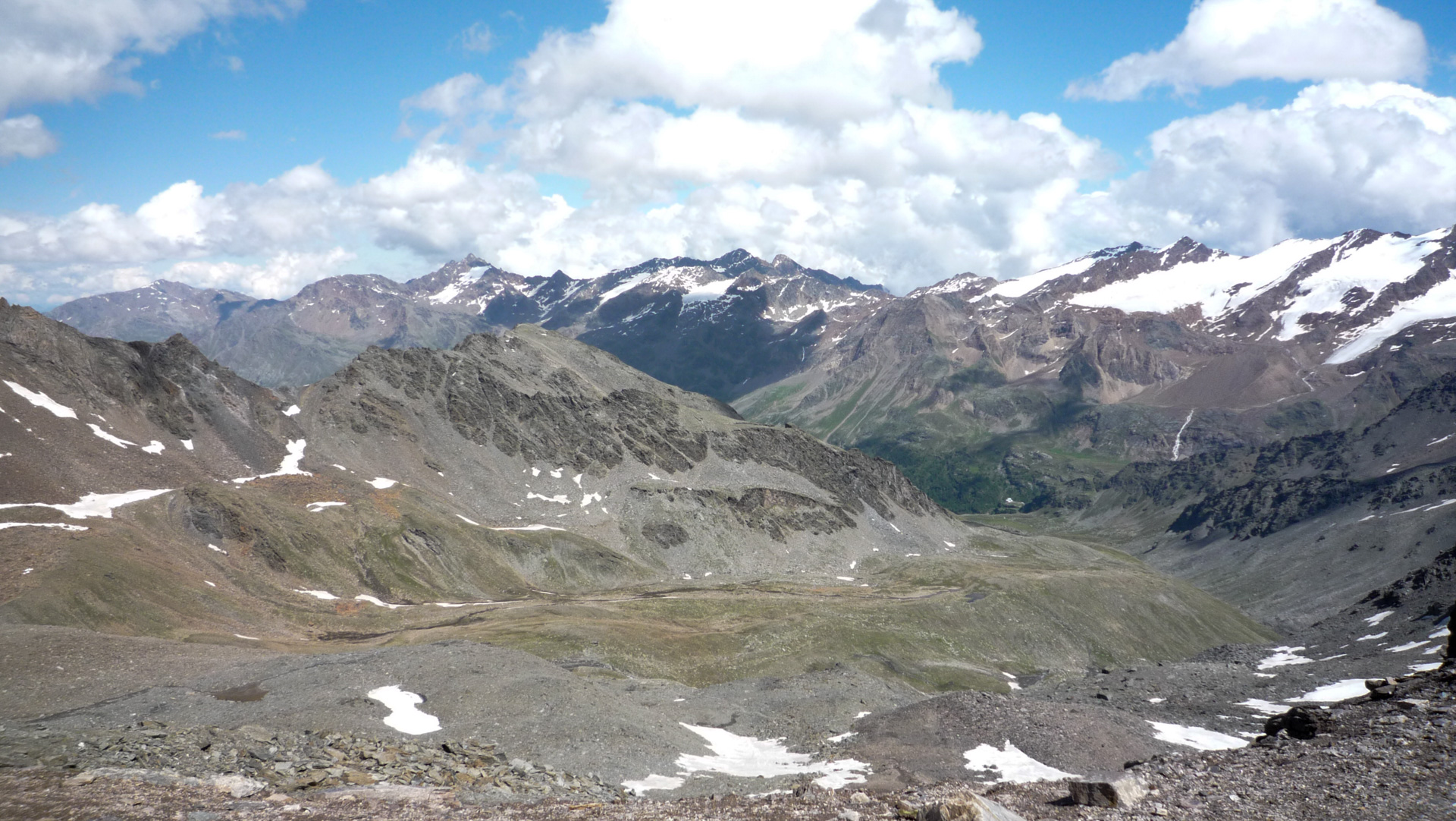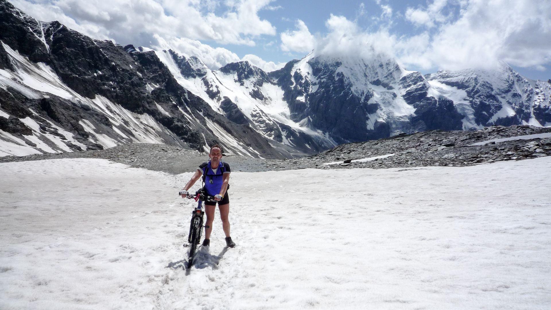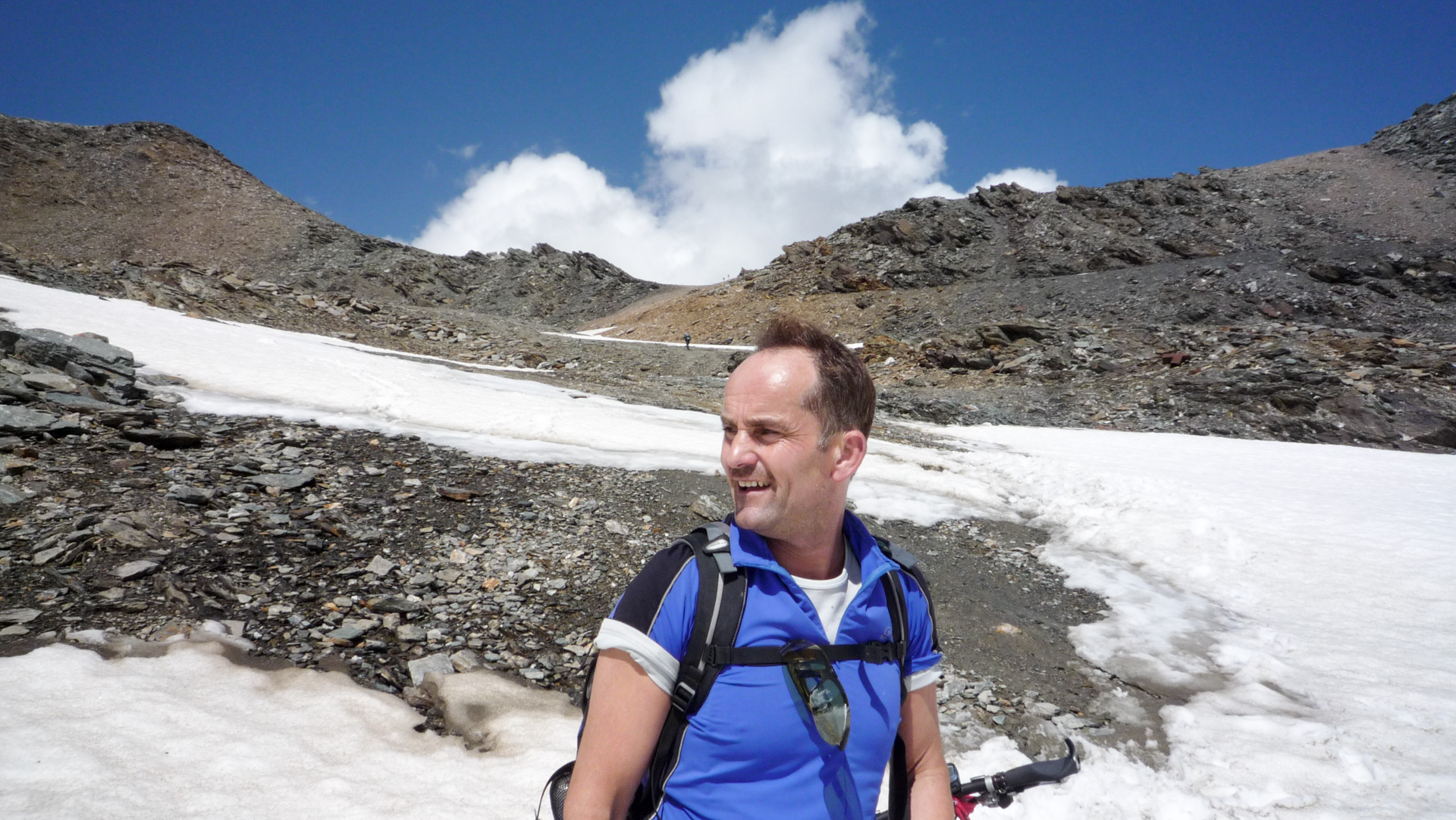 Wir nutzen ein Schneefeld aus, stecken unsere Räder hinein und befestigen die Reifen mit verharschtem Schnee. So, da stehen sie nebeneinander, wie von Geisterhand gehalten. Eine tolle Möglichkeit Fotos zu schießen. Die Bikes auf dem Schneefeld – im Hintergrund der Ortler. Wir haben Glück, den die Gipfel sind für fünf Minuten völlig wolkenfrei – Spitze! Wir kommen an der Bergstation eines Skiliftes vorbei, eine kleine steilere Rampe steht vor uns. In der Ferne erkennen wir zwei Wanderer, die im Abstand von 200 Meter dem Gipfel entgegen laufen. Uns wird bewusst, dass wir die ganze Zeit auf einer Skiabfahrt hoch schieben. Schön sind die Geröllfelder nicht, die Erosion hat hier auch schon dazu beigetragen, dass der komplette Hang sehr zerklüftet und vegetationslos aussieht. Im Winter, wenn hier meterhoch der Schnee liegt, sieht man von den verschandelten Skiabhänge nichts. Aber die Höhe und der Rundumblick auf die hohen Gipfel der Berge lassen es dennoch zu einem einprägendem Erlebnis werden.
