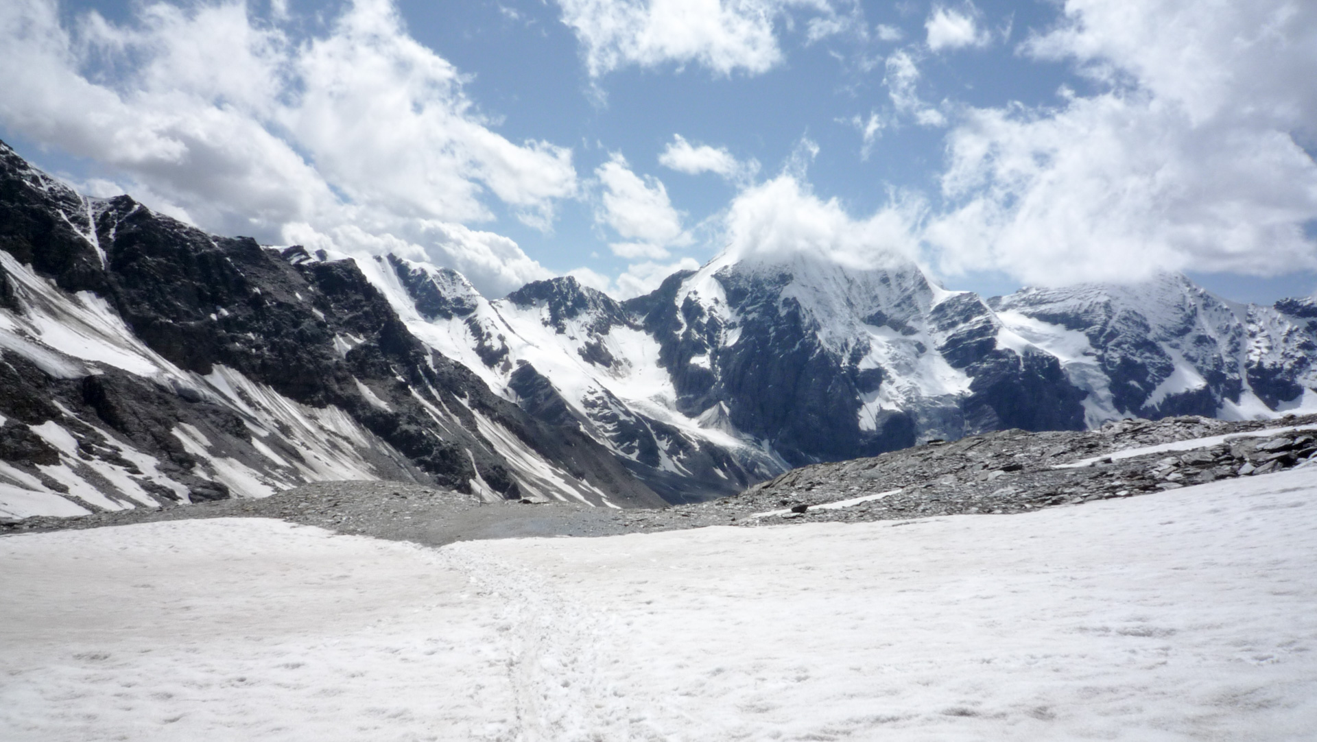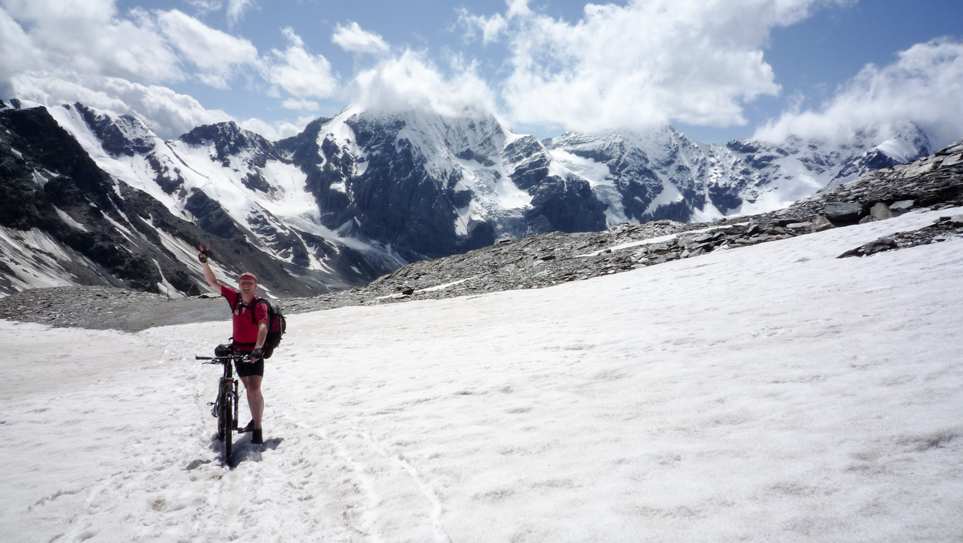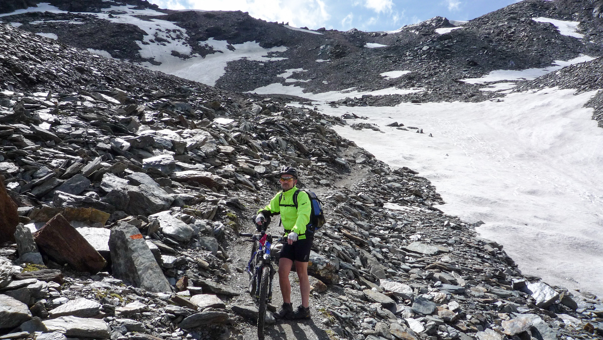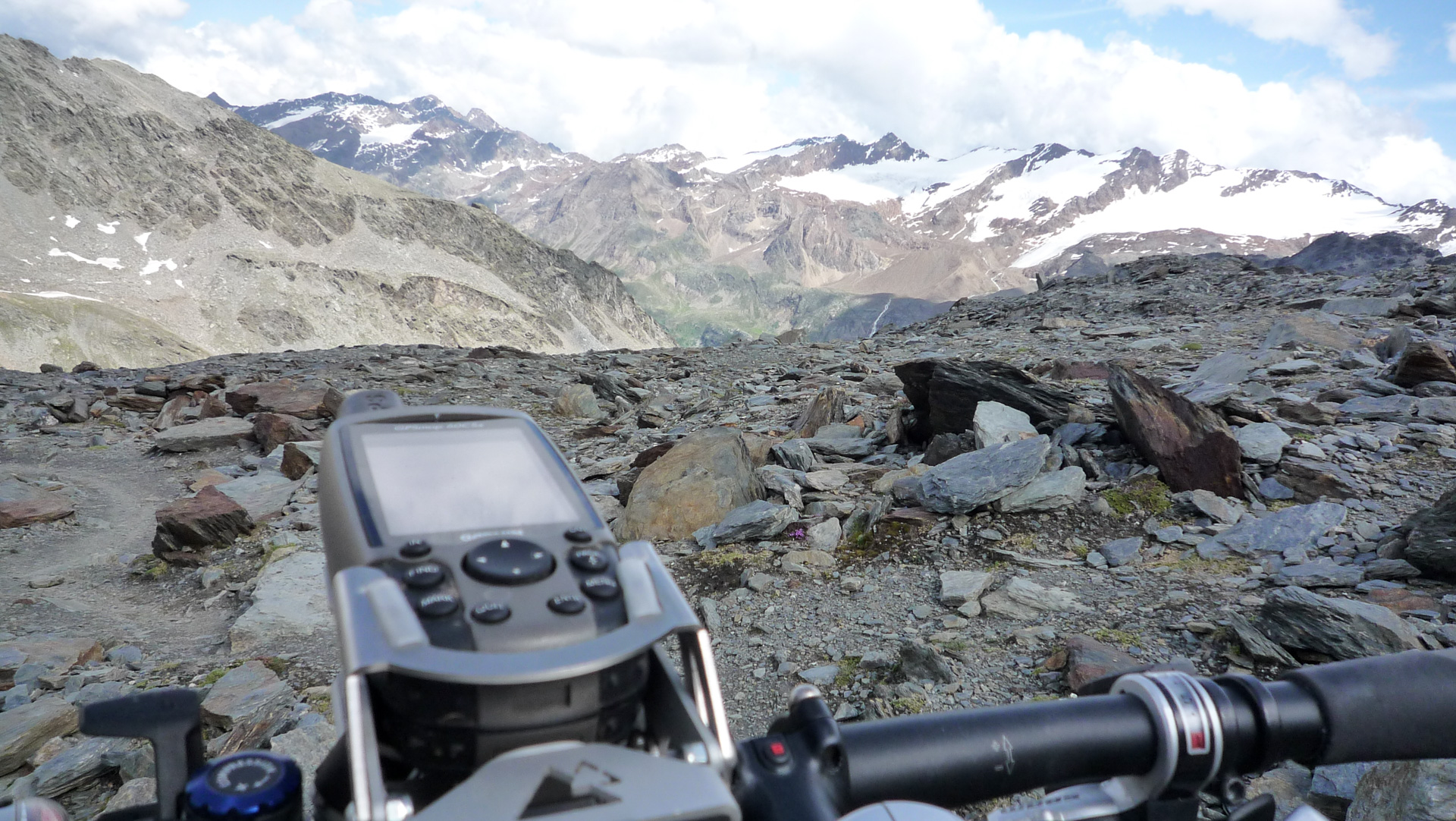 Unsere Augen verfolgen natürlich gleich den Weg Richtung Gipfel. Nur die ersten paar Meter können wir noch fahren, dann ist Schieben angesagt. Auf Schotterpiste durch Schmelzwasser und kleinere Schneefelder geht es von 2.580 Meter auf 3.130 Meter dem Madritschjoch entgegen. Das Joch ist mit seinen Ausmaßen der höchste, mit dem Bike noch sinnvoll überquerbare Alpenpass. Durchschnittlich 20% Steigung und die Höhenluft machen es uns nicht leicht, aber rückblickend war es das angenehmste Schiebestück auf unserem gesamten Alpencross. Dazu aber mehr in den nächsten Tagen. Die Schneefelder stellten auch kein großes Problem dar, denn man kann schon in der vorhanden Spur laufen und sinkt somit nur 10 Zentimeter ein. Verpasst man allerdings die Spur, sind es circa 30 Zentimeter Schneematsch, die das Laufen erschweren. Auf den Reifen klebt förmlich der Schnee und das Schieben des Bikes ist nicht immer einfach, aber dennoch machbar.