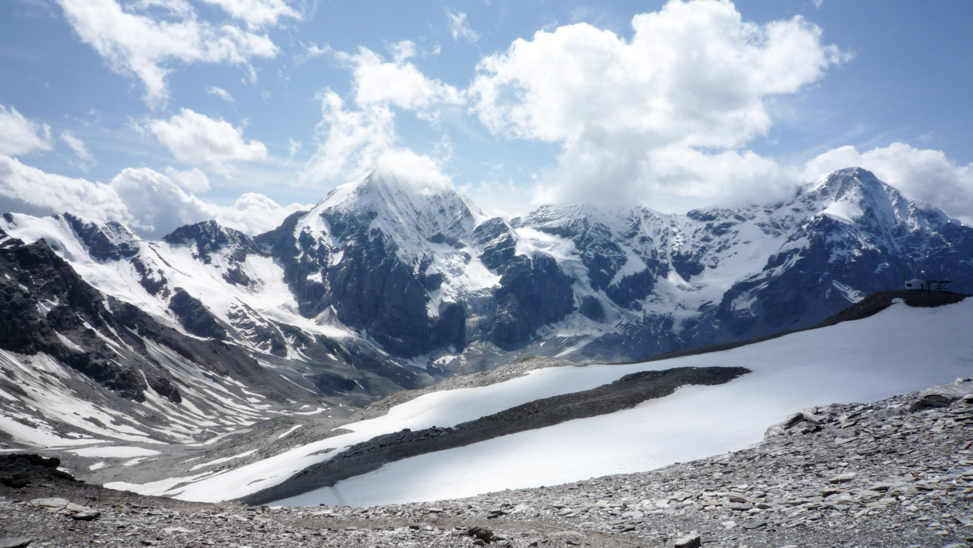 Pünktlich um 14:00 Uhr stehen wir bereit und steigen in die Gondel ein. Eine grandiose Aussicht, die uns während der Auffahrt und beim Verlassen der Gondel geboten wird. Bayrischer weiß/blauer Himmel, das Drei-Gestirn «Ortler», «Königsspitze» und «Zebru» ist teilweise mit weißen Wolken umhüllt und einfach nur schön anzusehen. Auch der bekannte Blick auf die Schaubachhütte gleich hinter der Bergstation ist sehr imposant.