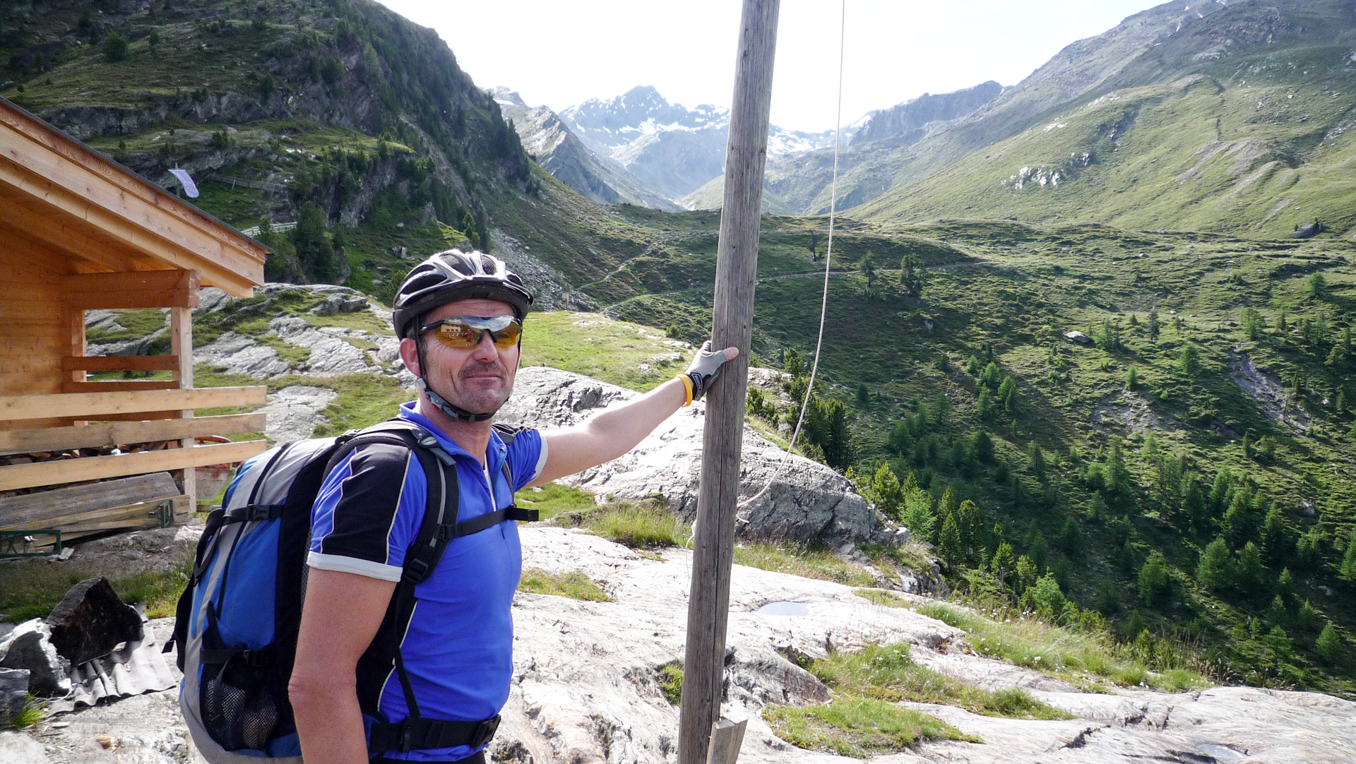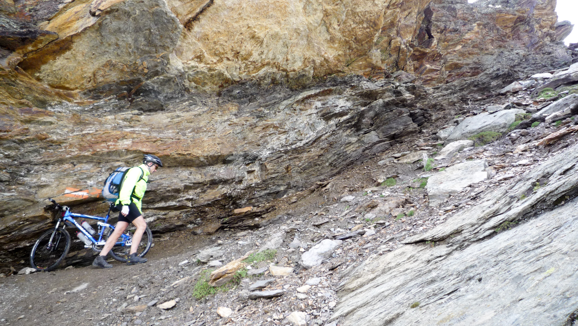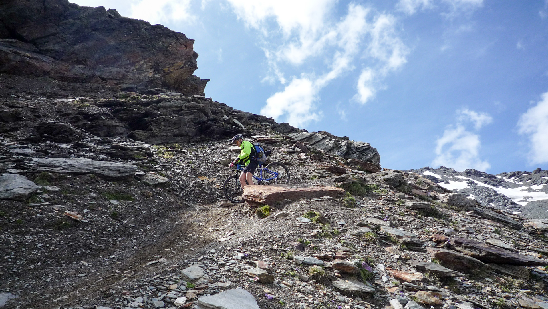 Wären wir gestern bei dem Unwetter gestartet, das hätten wir nicht erlebt. Jürgen und ich sind uns einig, hier oben möchten wir nicht sein, wenn sich Blitz und Donner abwechseln und der Regen oder Schnee erbarmungslos ins Gesicht peitscht. Kaum eine Möglichkeit sich hier oben unterzustellen oder anderweitig Schutz zu finden. Aber heute, herrlicher Sonnenschein in luftiger Höhe. Nein, wir haben wieder mal alles richtig gemacht und werden auch noch dafür belohnt! Der Blick auf die andere Seite hinab verrät uns: Viel zu fahren gibt es jetzt nicht. Nicht für uns «Flachlandtiroler». Die Abfahrt, oder soll ich besser sagen der Fußmarsch mit bis zu 40% Gefälle auf dem nächsten Kilometer ist schon heftig. Dieses Mal laufen wir die Rampen runter, ein kleiner Wanderpfad schlängelt sich an der Felswand hinab, linker Hand der Abgrund. Es macht uns dennoch jede Menge Spaß, wir können uns einfach nicht satt sehen an der Schönheit der Natur. Es dauert aber wirklich nicht lange und der Spuk ist vorbei.