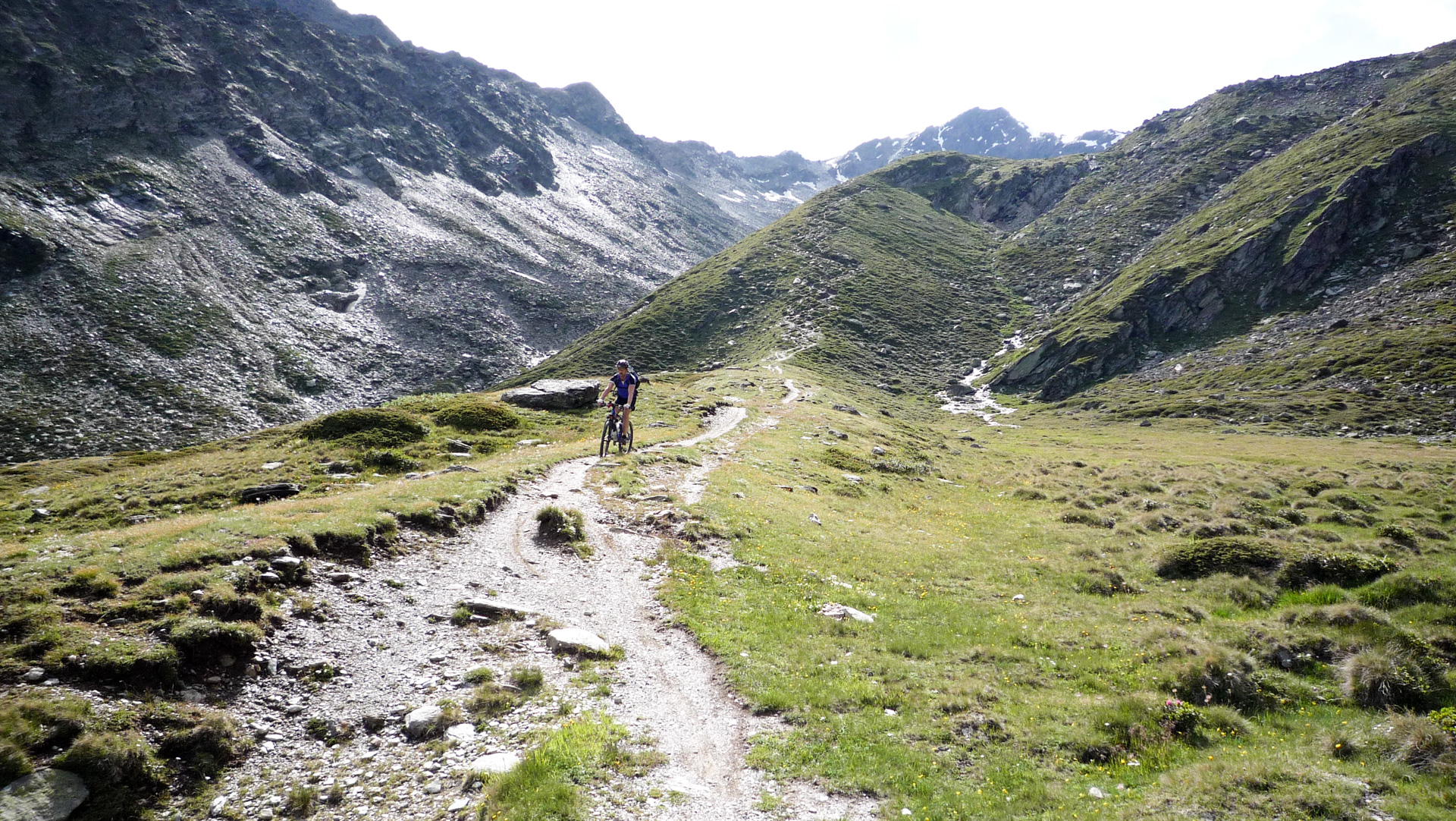 Uns offenbart sich ein toller, fahrbarer Weg. Das haben wir so nicht erwartet. Ein handtuchbreiter Trail, immer abwärts, mal ein Steinbrocken dazwischen, mal eine Stufe, dann durchfahren wir einen Wasserlauf, der sich vom Gipfel seinen Weg ins Tal sucht. Und das aller Beste ist, wir können alles fahren. Einfach nur Spitze! Immer wieder Rechts/Links Kombinationen, kleine natürliche Steintreppen dir wir hinunter fahren, traumhaft. Unsere Dämpfer und Federgabeln leisten Schwerstarbeit, ab und zu ein kleiner Sprung, dann sackt die Gabel beim Überfahren eines größeren Felsbrocken tief ein, dennoch hat Sie aber immer noch merklich Reserve. Natürlich halten wir immer wieder an, um das Panorama der einsamen Bergwelt aufzusaugen, Bilder zu machen und die ganze Situation einfach nur zu genießen! Eine kleine Hochebene lässt uns schon auf unser nächstes Ziel blicken, der Zufallhütte im Martelltal. Wir lassen es einfach hinunter laufen, immer weiter treiben ohne zu treten.