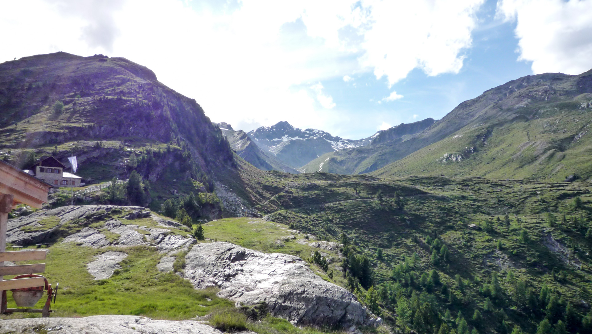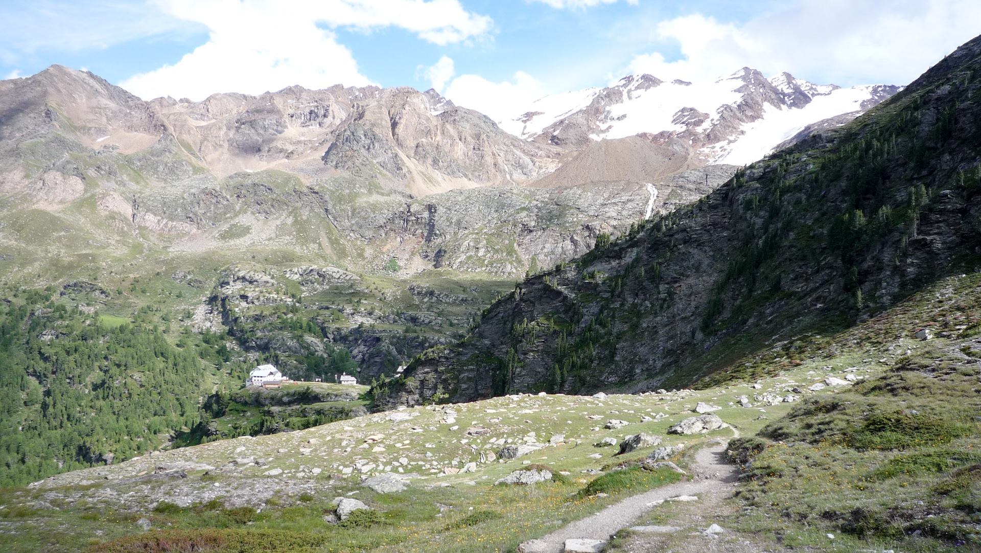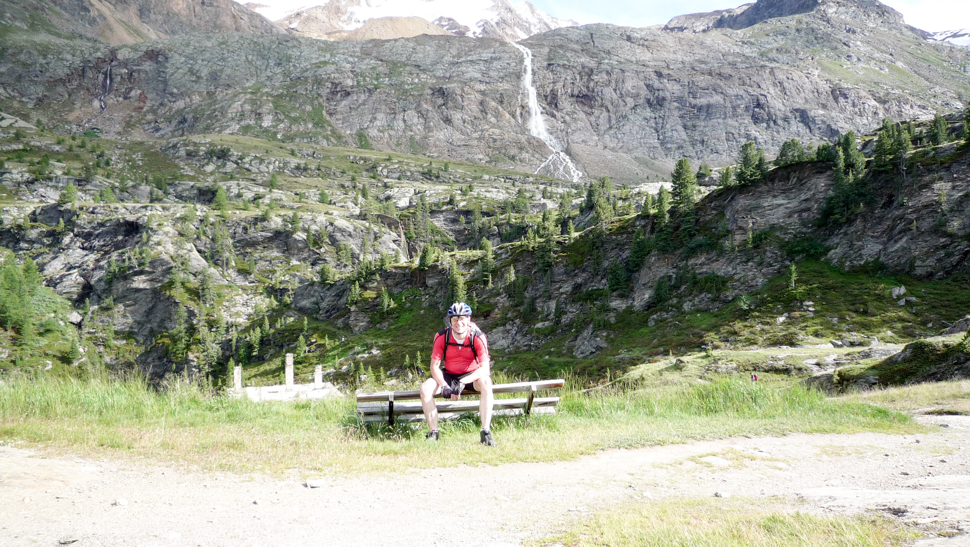 Ein kleiner aber kurzer Gegenanstieg und wir stehen vor der Hütte auf 2.245 Meter, mit einem atemberaubenden Blick Richtung Martelltal auf den Zufritt Stausee. Wir erfreuen uns an einer Pause, an der Quelle tanken wir ein letztes Mal für heute frisches Wasser, nur der Fotoapparat hat keine Ruhe und verrichtet Schwerstarbeit. Hinter der Hütte der türkisblaue Stausee, seitlich ein schmaler Wasserfall, der sich vom Berggipfel seinen Weg in die Tiefe sucht. Eine Einkehr in die Hütte ersparen wir uns, nehmen Platz auf einer Bank direkt gegenüber einer kleinen Kapelle und lassen die Schönheit der Natur auf uns wirken. Die Sonnenstrahlen sind sehr intensiv und verwöhnen unsere nackte Haut.