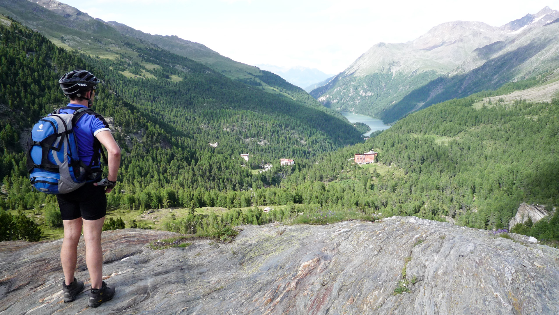 Jetzt folgt eine circa 15 Kilometer lange Abfahrt bis auf 1.100 Meter hinunter. Wieder auf einem kurzen Stück eine toller Trail bis kurz vorm Stausee, dann folgt eine gemütliche Schotterfahrt rechts um den See herum. Auf der Staumauer bleiben wir kurz stehen, um den phantastischen Ausblick zurück zum Madritschjoch zu genießen und in einem Bild einzufangen.