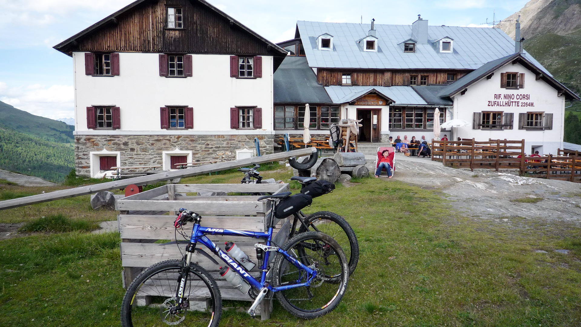 Die Seilbahn Sulden am Ortler ist die größte Luftseilbahn der Alpen. Sie führt von der Talstation bei Sulden von 1.900 Meter aus zur Bergstation bei der Schaubachhütte auf 2.600 Meter Höhe. Wir sparen uns die 700 Höhenmeter auf die Schaubacher Hütte, denn zum Einen kann man die Strecke wegen Ihrer Steilheit sowieso fast nur laufen, zum Anderen stehen heute immerhin insgesamt 2.300 Höhenmeter auf unserem Programm. Das ist uns genug für den ersten Tag. Also nutzen wir die Gelegenheit, machen es uns auf der Terrasse des Hotels gegenüber gemütlich und genießen so den ein oder anderen Cappuccino mit leckerem Apfelstrudel. Die Sonne scheint, die Sonnenstrahlen fangen langsam an uns zu bräunen und wir genießen die Stunde Mittagspause.
