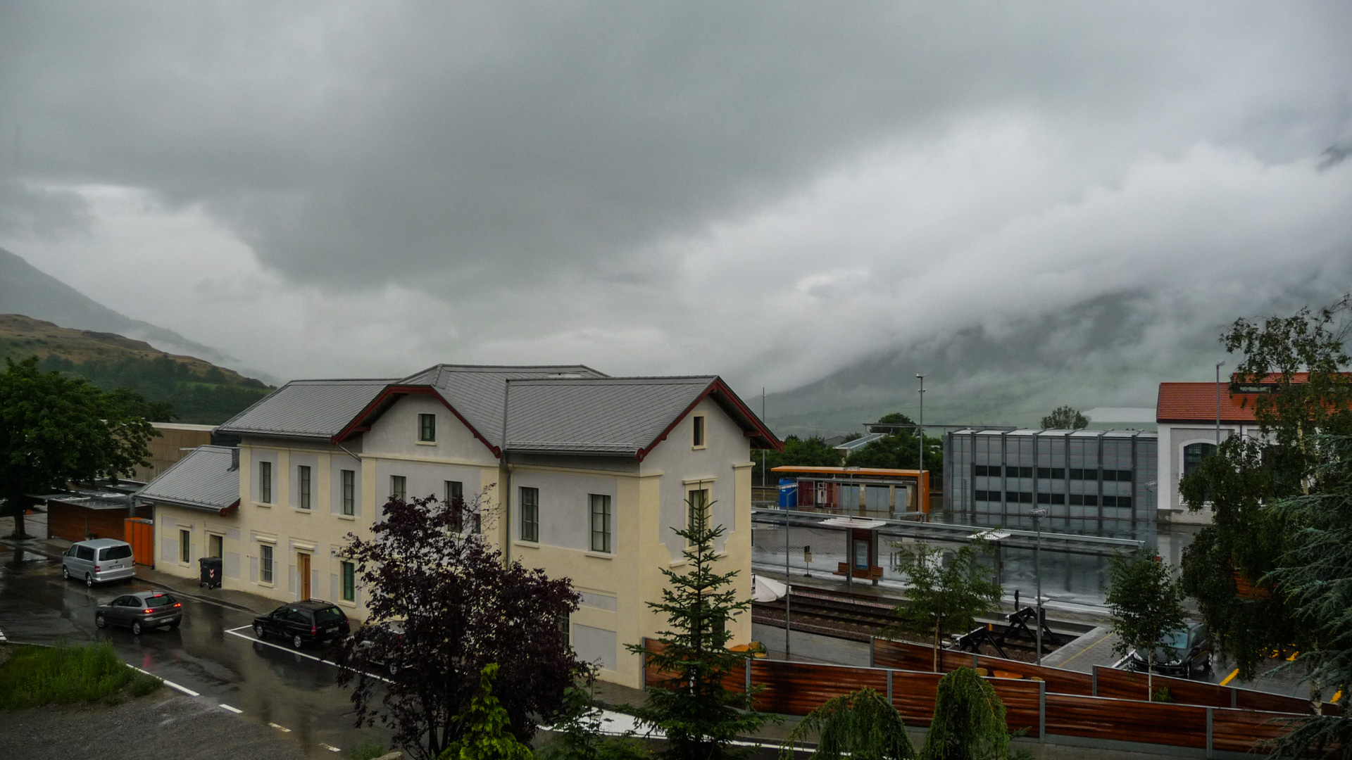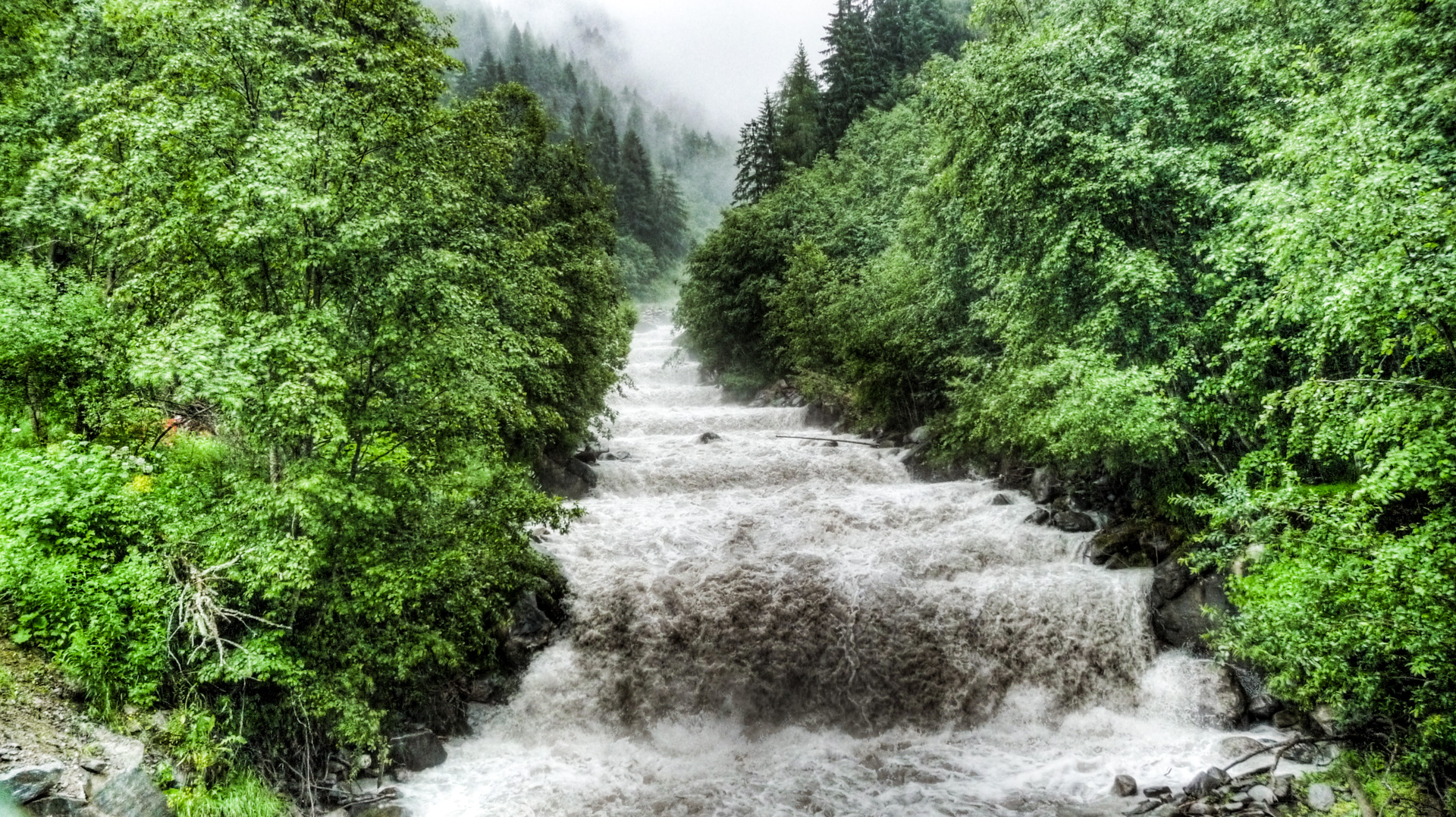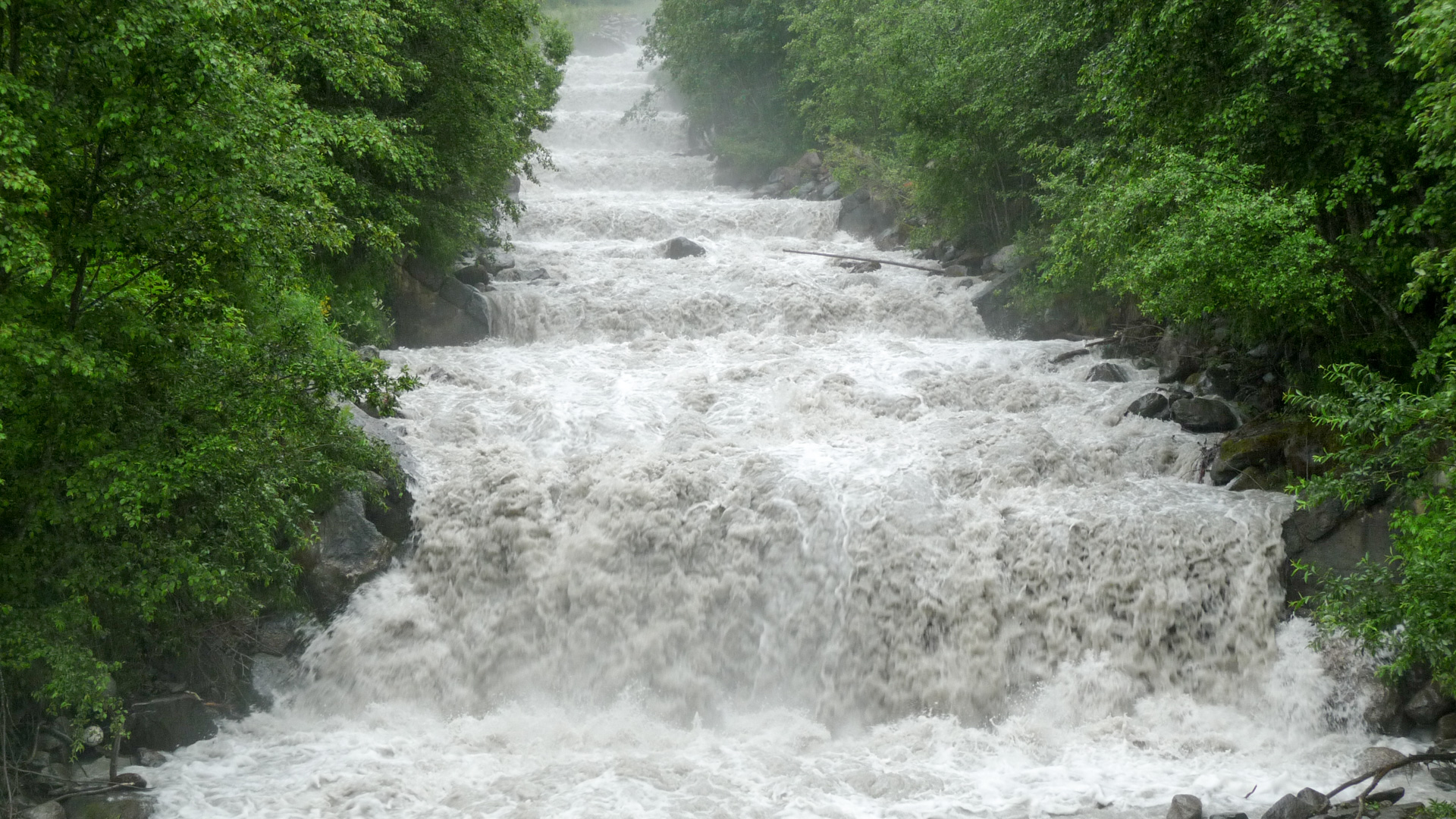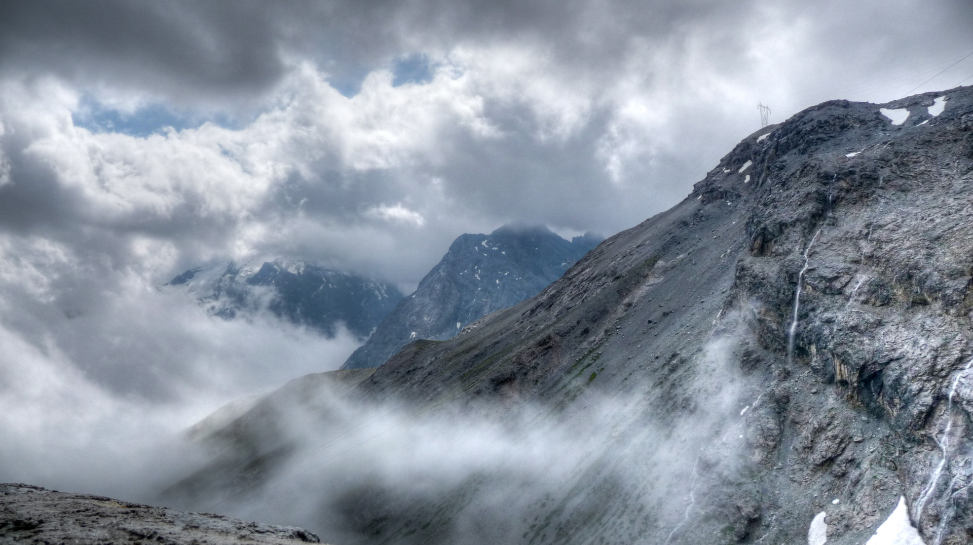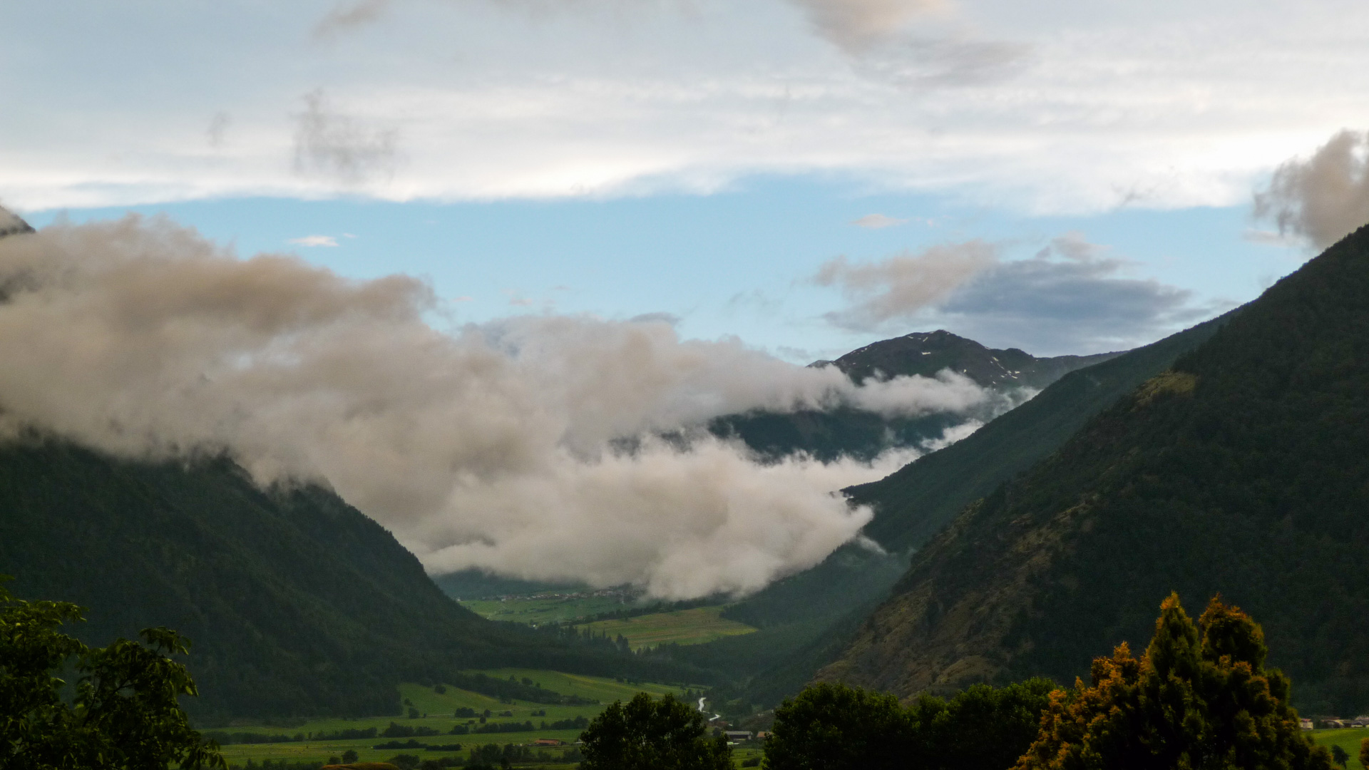 Nach kurzem hin und her, nach Abwägen aller Möglichkeiten halten wir es für das Beste, die ganze Tour um einen Tag zu verschieben. Gesagt, getan. Wir rufen alle vorgebuchten Hotels/Pensionen an und kündigen unser Kommen um einen Tag später an! Alles ganz ohne Probleme, super, wenigstens das hat geklappt! Das ist der Vorteil, wenn man etwas mehr Urlaub einplant und dann auf der Tour reagieren kann. Der Tag läuft dann sehr ruhig ab, bis auf eine Ausnahme, dazu am Ende dieses Kapitels mehr! Wir fahren mit dem Auto hoch nach Sulden zu Seilbahnstation am Madritschjoch und notieren uns die Fahrzeiten der Gondel. Denn morgen kommen wir mit den Bikes hier vorbei und wollen dann die Auffahrt mit der Gondelbahn genießen. Auch hier regnet es, wir kommen über eine Brücke an einem rauschendem Fluss vorbei. Er ist schön anzuschauen, wie der Nebel den Horizont bedeckt und sie die Fluten ins Tal stürzen.