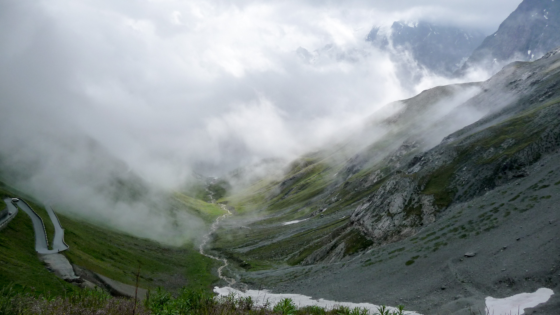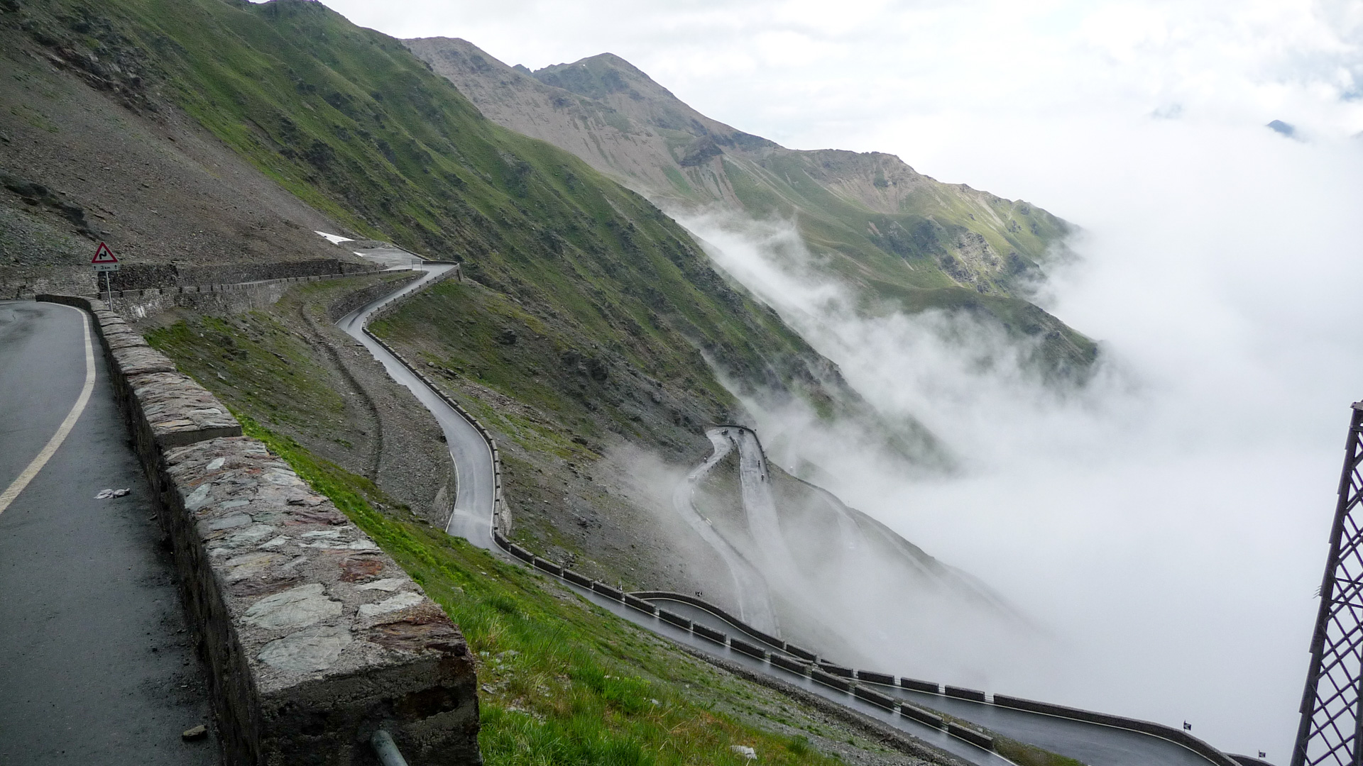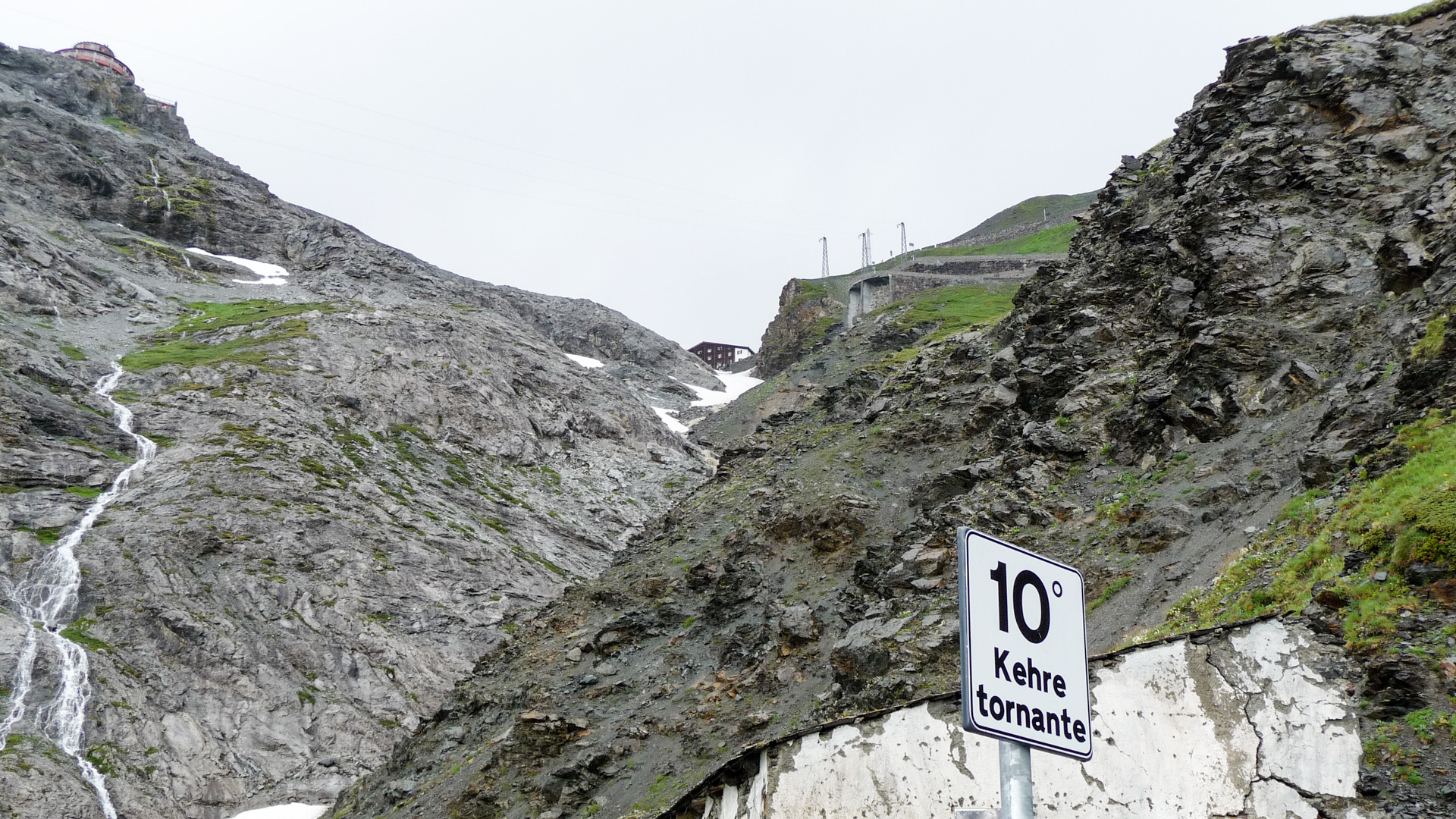 Die fast unzähligen Kehren hoch, nein es sind genau 48 aufs Joch, machen auch mit dem Auto Spaß. Man sind wir froh, heute nicht biken zu müssen, sau kalt, stürmisch und oben gerade mal 2 Grad. Dazu kaum Sicht aufgrund einer dicken Nebelwand! Aber wenn alles klappt, dann kommen wir hier mit dem Bike am letzen Tag nochmal vorbei. Ein paar Bilder mache ich natürlich noch, dann zieht es uns auch schon wieder zurück nach Mals.