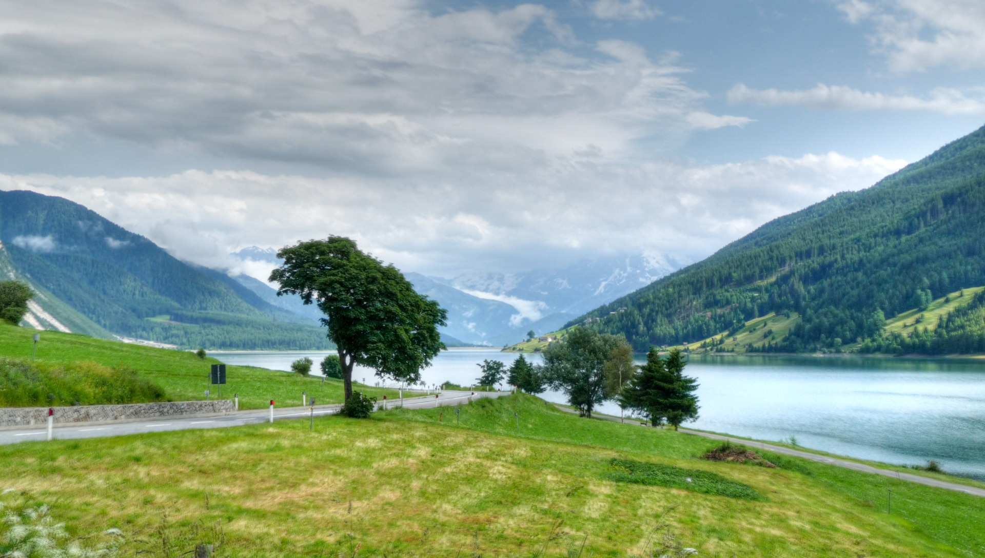 Kaum überschreiten wir dir Grenze zu Österreich, fängt es auch schon an zu regnen. Das sieht insgesamt nicht sehr gut aus, was sich da zusammenbraut, überall tief hängende dunkle Wolken, aber wie heißt es so schön: die Hoffnung stirbt zuletzt! Am Reschensee machen wir eine kurze Pause, genießen ein wenig den Flair der Berge, die reine Luft und leider auch den Nieselregen. Für ein paar Bilder habe ich natürlich auch noch Zeit.