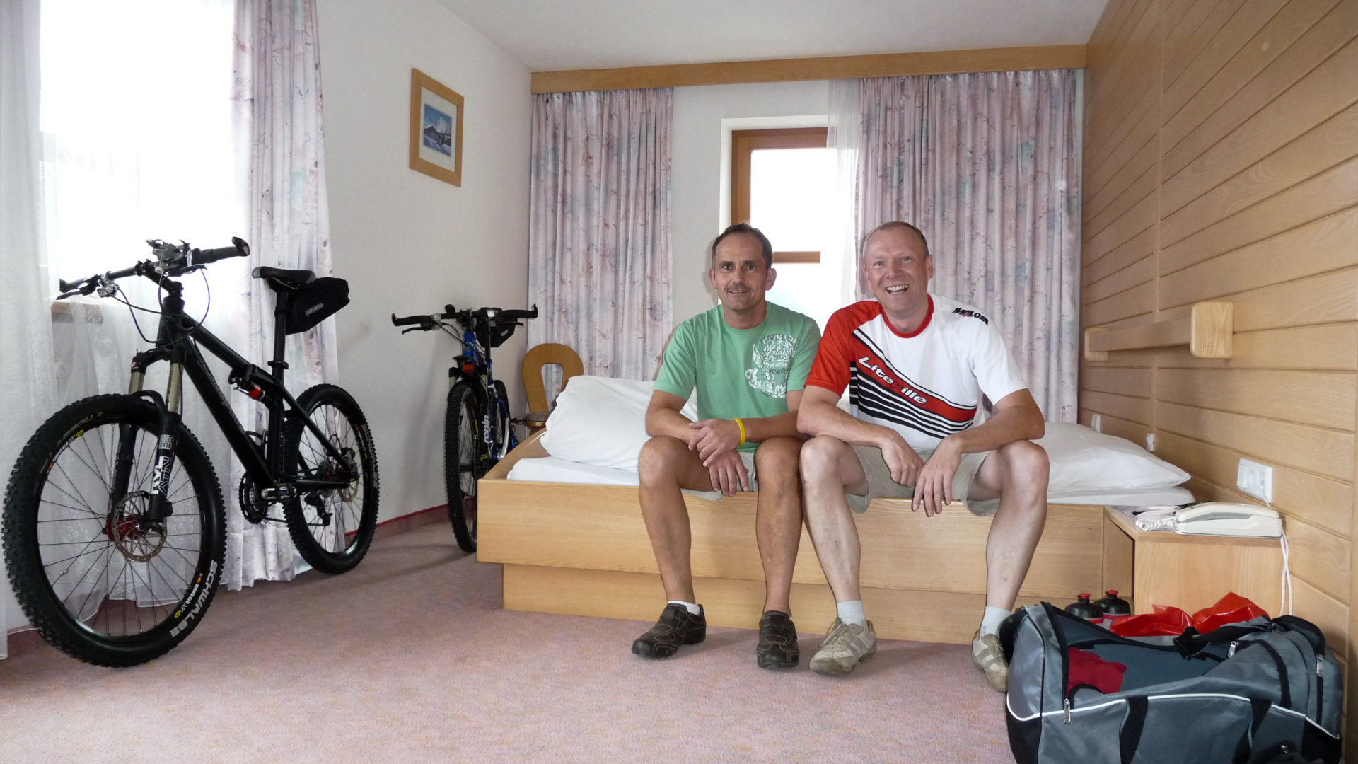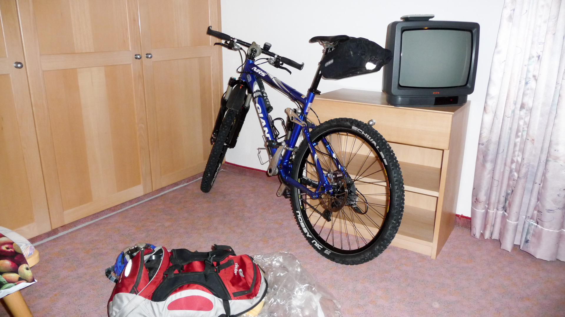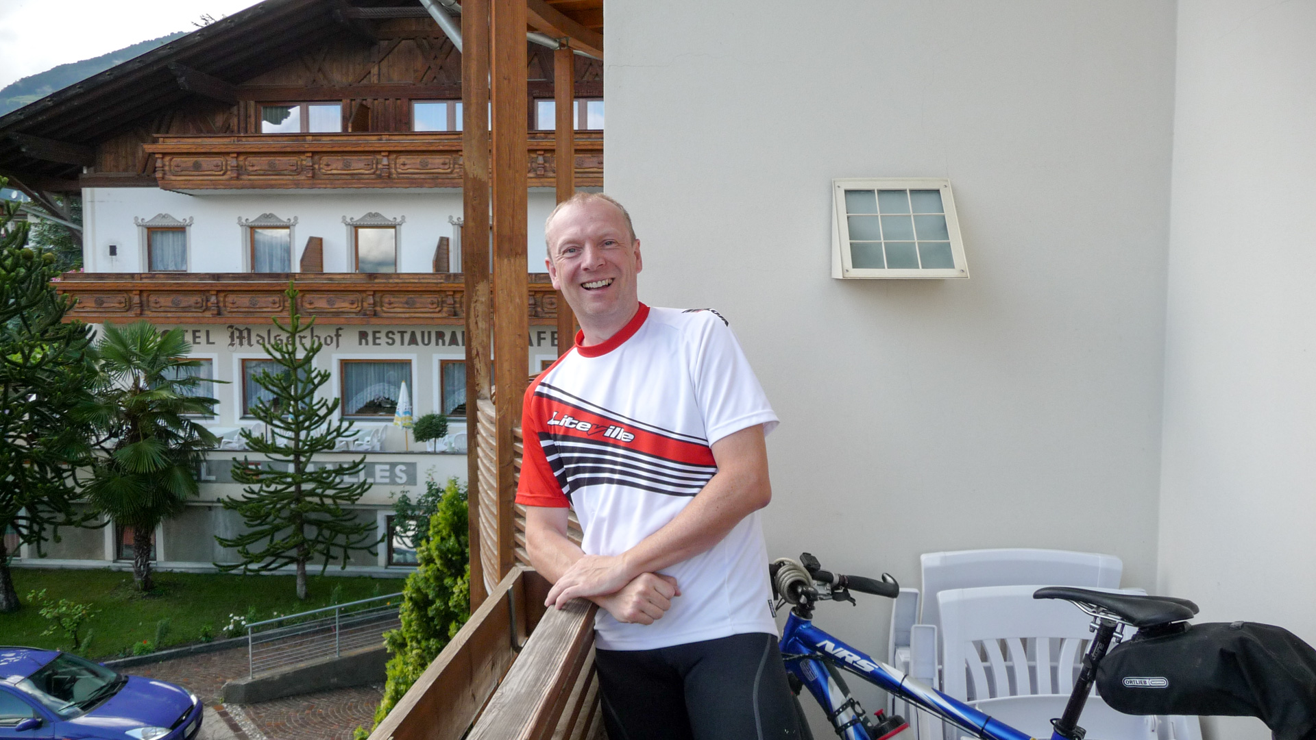 18:00 Uhr treffen wir in Mals ein, einem kleinen verschlafen Ort unterhalb des Reschensee . Dank Navigationsgerät finden wir schnell unser Hotel, stellen das Auto auf den hauseigenen Parkplatz, melden uns an der Rezeption und beziehen unser Zimmer. Durch einen erwartungsvollen Blick vom Balkon ins weite Land wird unsere Stimmung nicht gerade positiv angehaucht. Der Nebel hängt tief im Tal und es ist kein Aufreißen einer Wolkendecke in Sicht, der Regen will nicht aufhören. Huch, die Räder sind ja auch noch auf dem Dachgepäckträger und werden nass. „Was heißt hier werden, die sind es schon lange“, bemerkt Jürgen mit einem verschwitzen Lächeln im Gesicht. „Wo wollen wir die Räder hin tun?“ Schaut er mich fragend an. „Ganz einfach, komm mit!“ geb ich zum Besten und wir holen die Räder ins Zimmer und stellen sie kurzer Hand auf unseren überdachten Balkon.