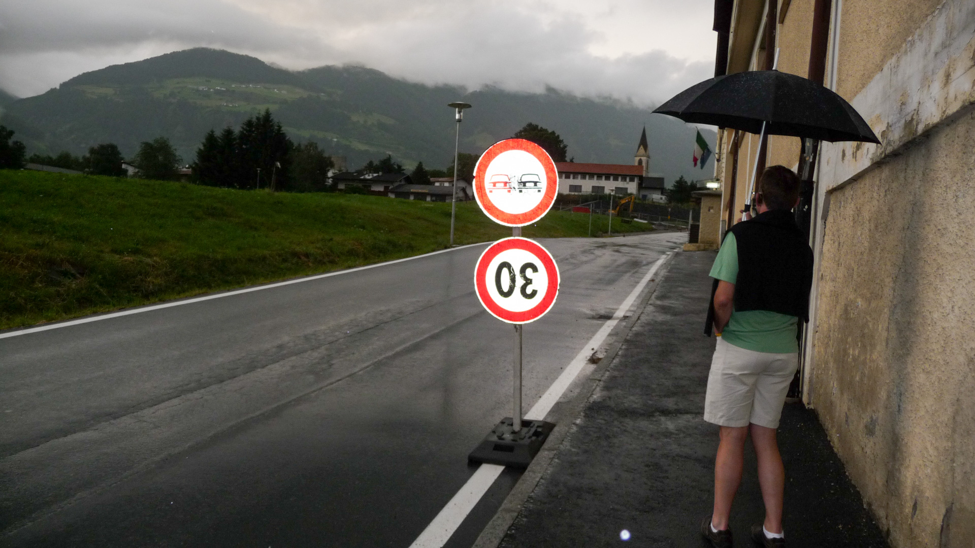 Der passende Ort ist gefunden! Die Bundesstraße «SS38» führt auf knapp 60 Kilometer nach Meran (auch ital. Merano). Zwischendurch immer wieder kleinere Ortschaften, vielleicht haben wir Glück und finden auf der Strecke einen Elektronikhändler. Wir machen uns mit dem Auto auf dem Weg, klappern jeden Händler den wir finden ab, doch eine angemessene Kamera war nirgends zu bekommen. Endlich in Meran angekommen, suchen wir vergebens einen Parkplatz, ganz schön groß, das Städtchen. An einem Taxistand erfragen wir nach einem größeren Foto oder Elektrohändler. Ja, es existiert einer, circa einen Kilometer von hier, aber wir sollen uns beeilen, denn in 10 Minuten machen hier die Geschäfte zu. Schock!