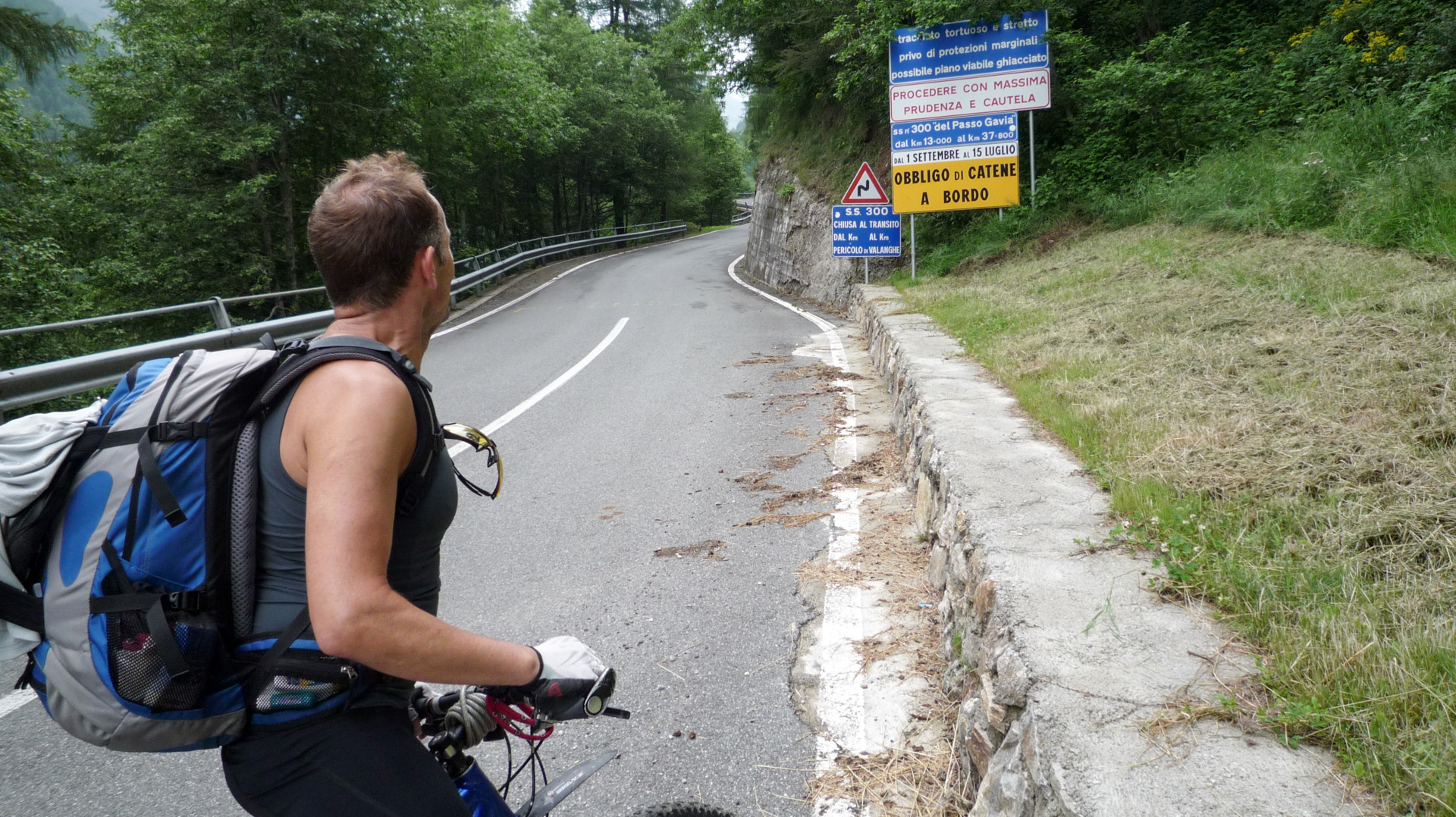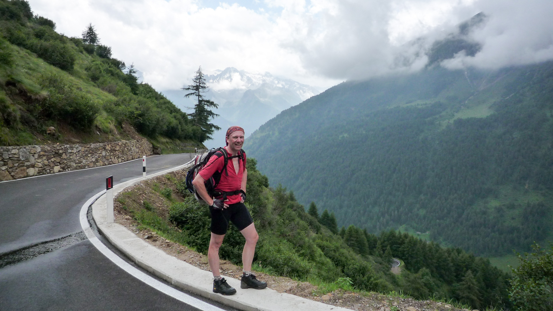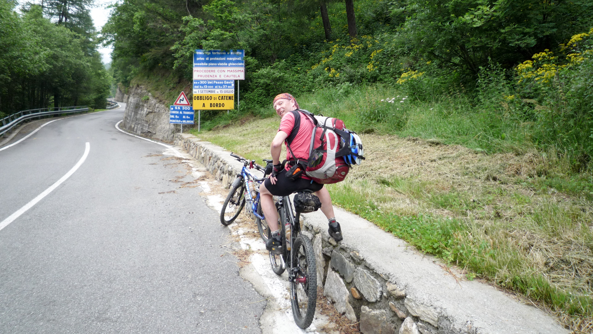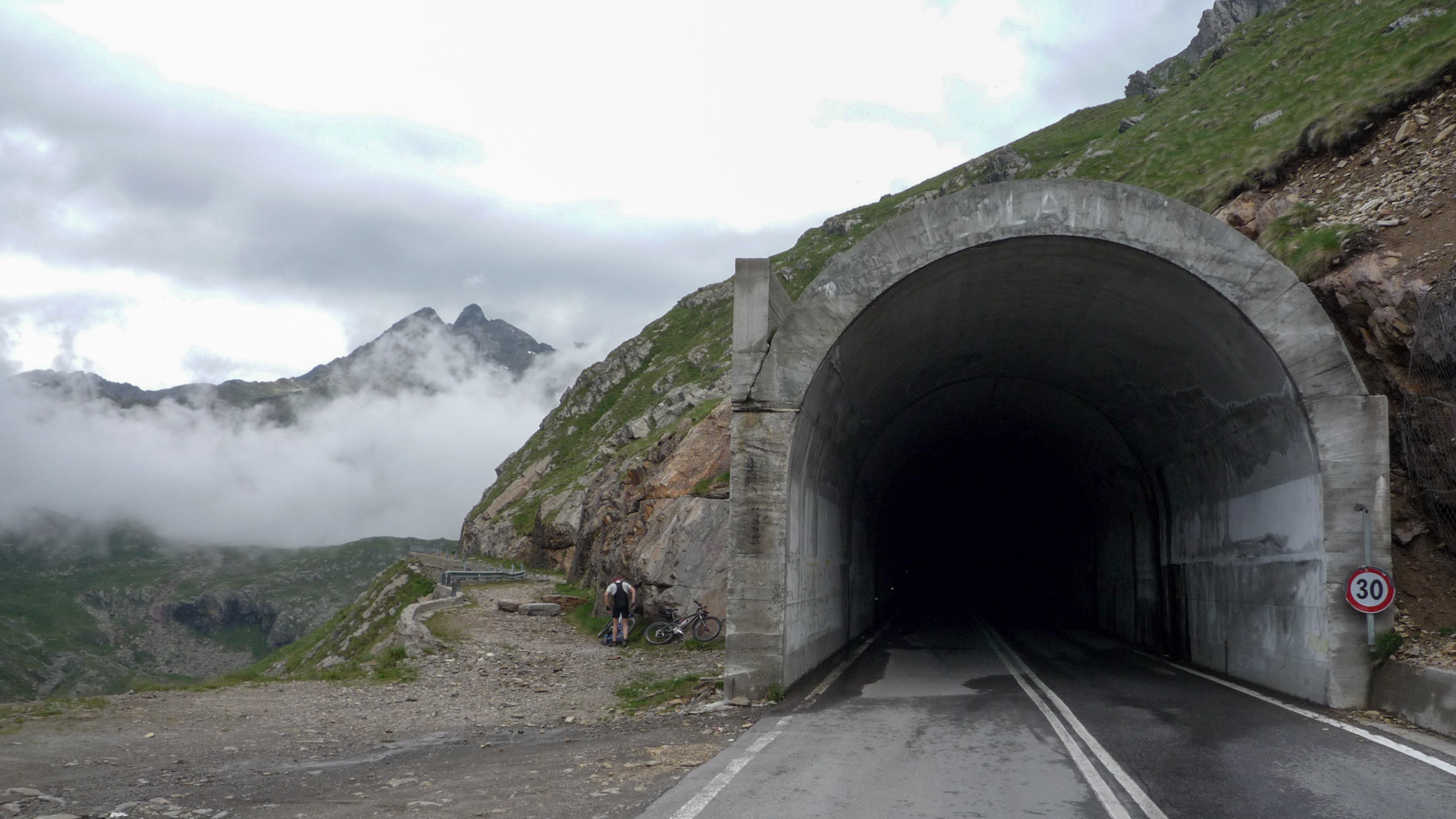 Auf den kommenden 12 Kilometer müssen wir im Schnitt 8,5% Steigung bewältigen. Das ist im Vergleich zu den vergangen Tagen ein Kinderspiel. Auch wenn es zwischendurch mal 14% sind, auf Straße geht es doch viel einfacher. Aufgrund des schlechten Wetters ist nicht viel Betrieb, ab und zu ein Auto, viel öfter ein paar Motorräder. Wir erklimmen Serpentine für Serpentine, pausieren ab und zu für ein Foto. Auf dem Straßenbelag stehen oft Namen vergangener Rad-Legenden: Basso, Pantani und viele, für uns unbekannte, mehr. Der «Giro Italia» hat den Pass öfter im Programm, man denkt unweigerlich an die Heldentaten der früheren Tage und fühlt sich wie ein Radprofi. Nur lange nicht so schnell!