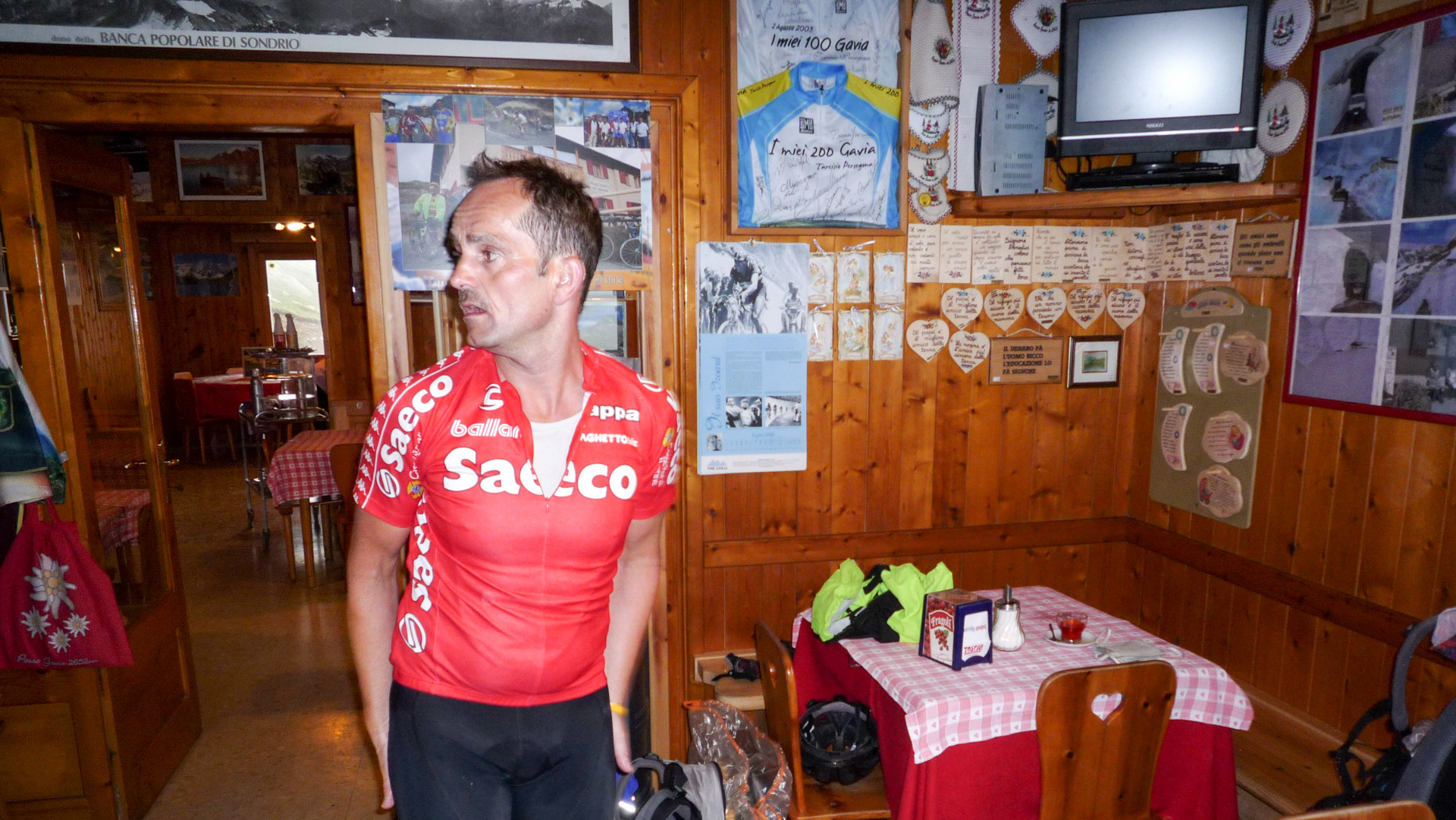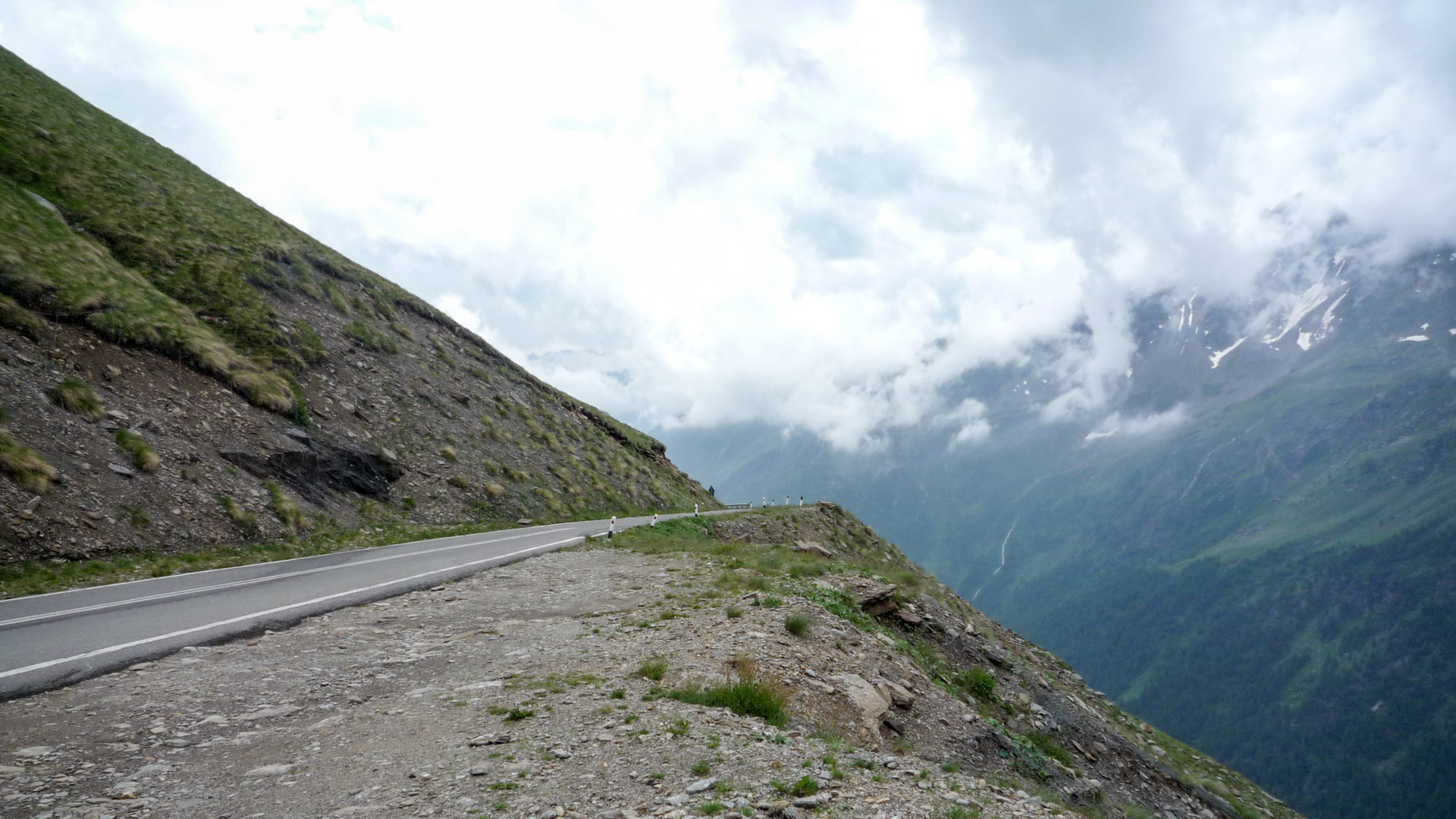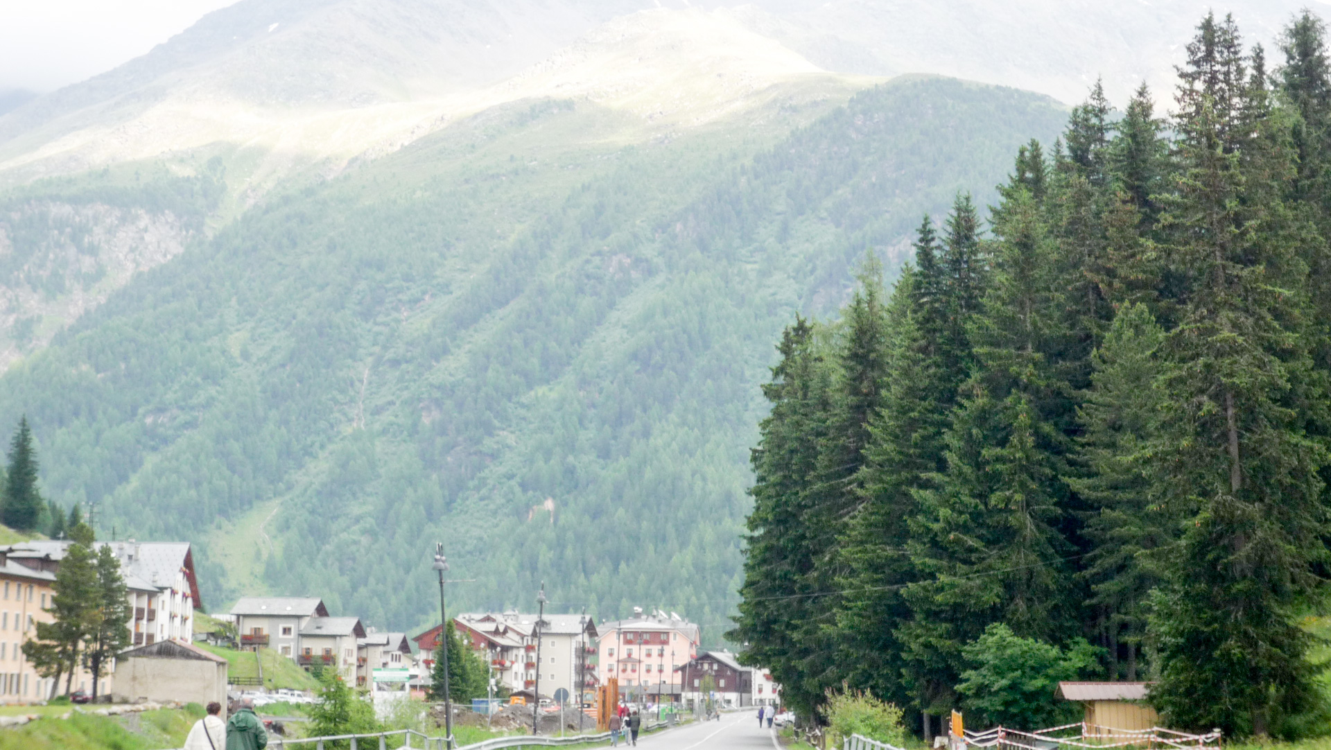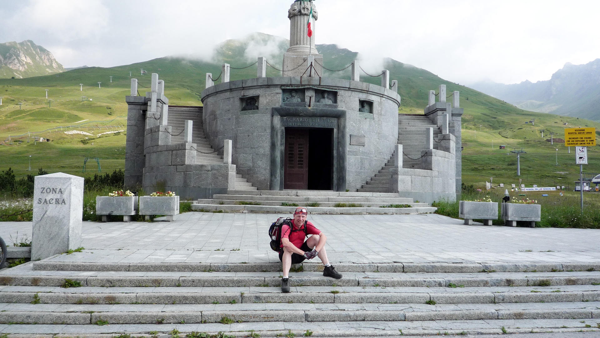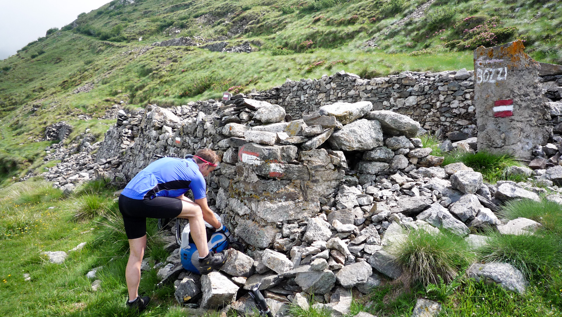 Auf den kommenden 12 Kilometer müssen wir im Schnitt 8,5% Steigung bewältigen. Das ist im Vergleich zu den vergangen Tagen ein Kinderspiel. Auch wenn es zwischendurch mal 14% sind, auf Straße geht es doch viel einfacher. Aufgrund des schlechten Wetters ist nicht viel Betrieb, ab und zu ein Auto, viel öfter ein paar Motorräder. Wir erklimmen Serpentine für Serpentine, pausieren ab und zu für ein Foto. Auf dem Straßenbelag stehen oft Namen vergangener Rad-Legenden: Basso, Pantani und viele, für uns unbekannte, mehr. Der «Giro Italia» hat den Pass öfter im Programm, man denkt unweigerlich an die Heldentaten der früheren Tage und fühlt sich wie ein Radprofi. Nur lange nicht so schnell!